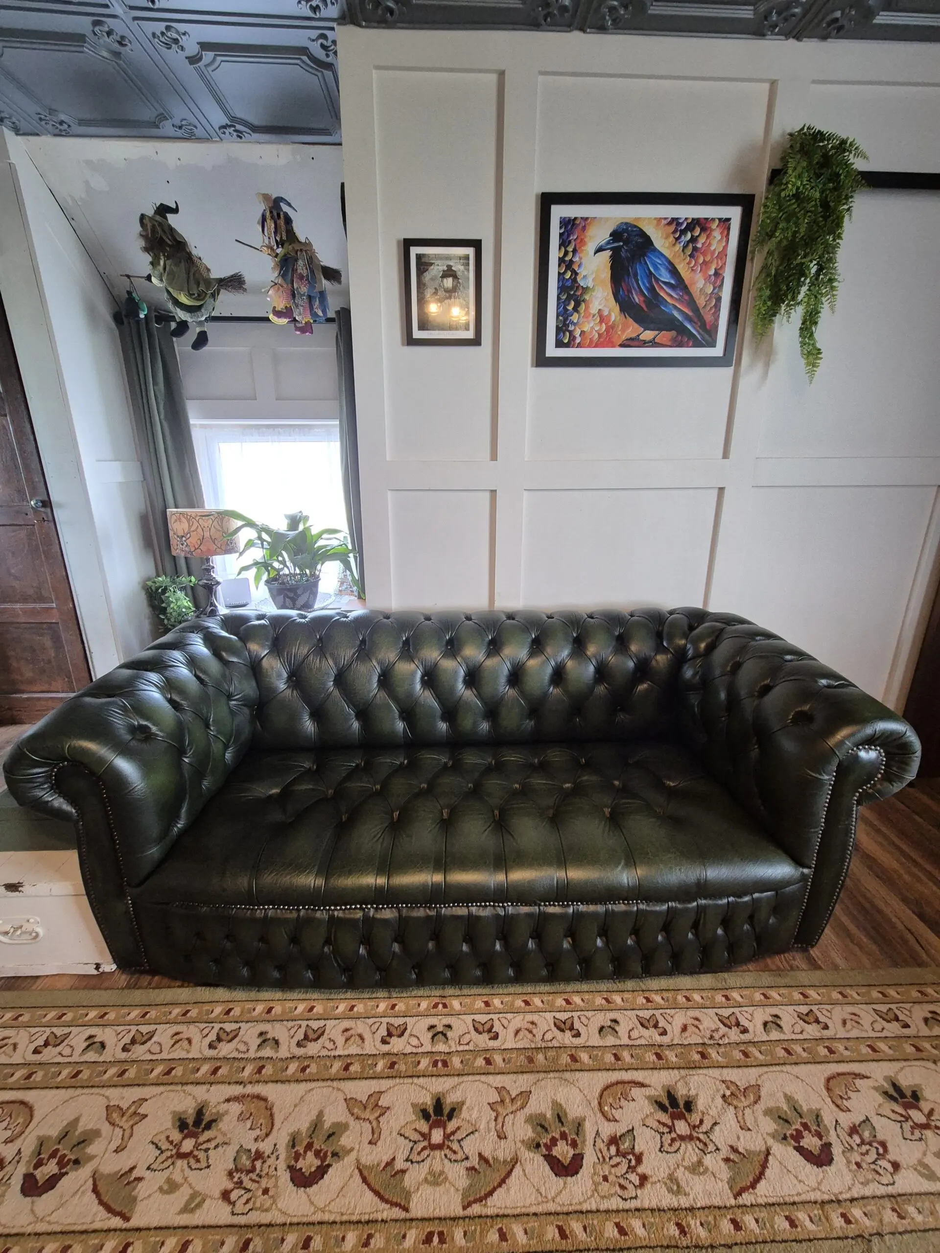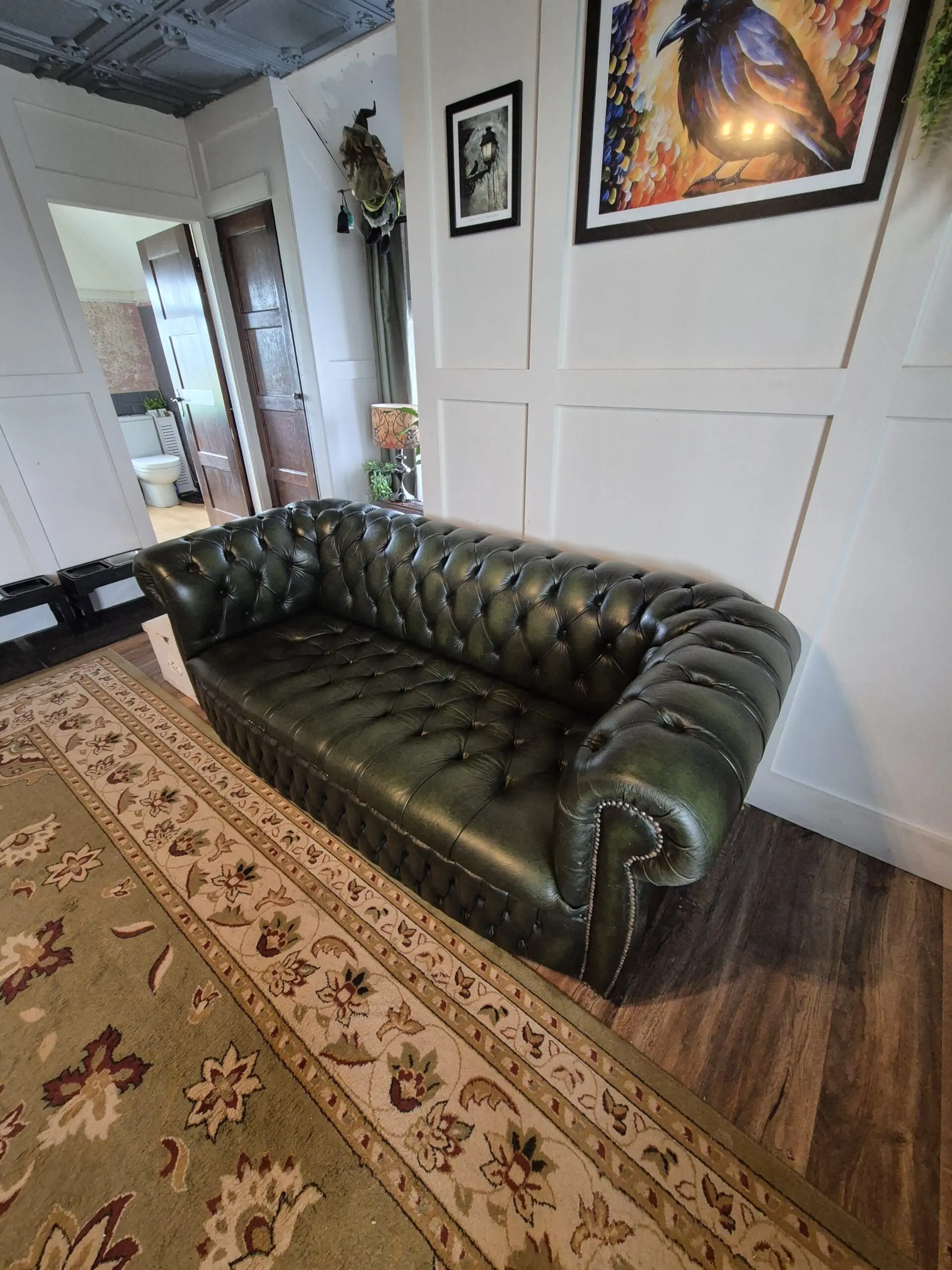 2 identical Bespoke Green 3 seater Leather Chesterfield Sofas great condition .