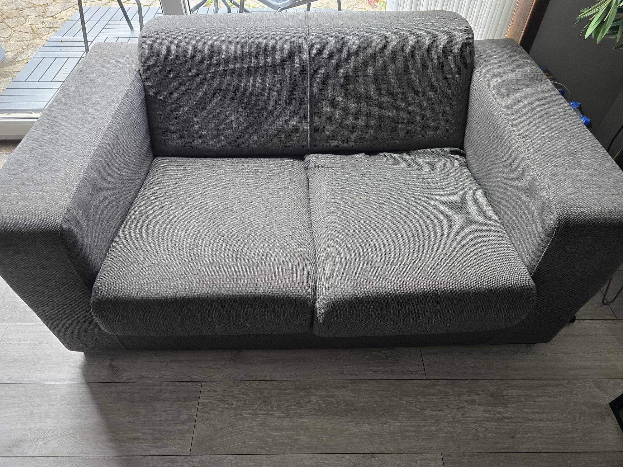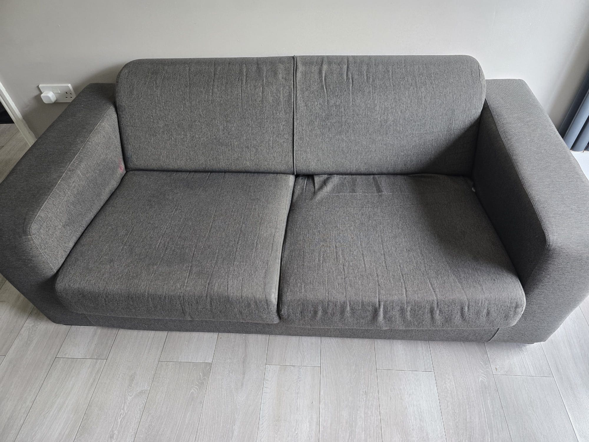 A three-seater and a two-seater sofa set are available. Both sofas are in good condition, although the cushion covers are beginning to show slight loosening on the sides.