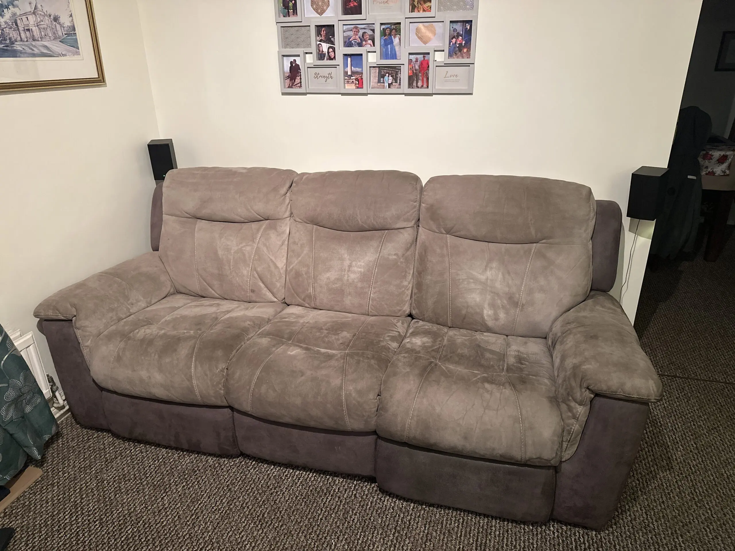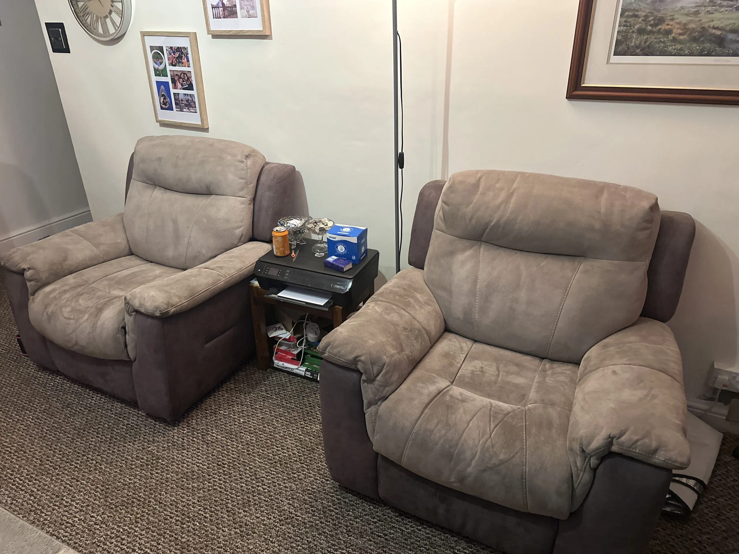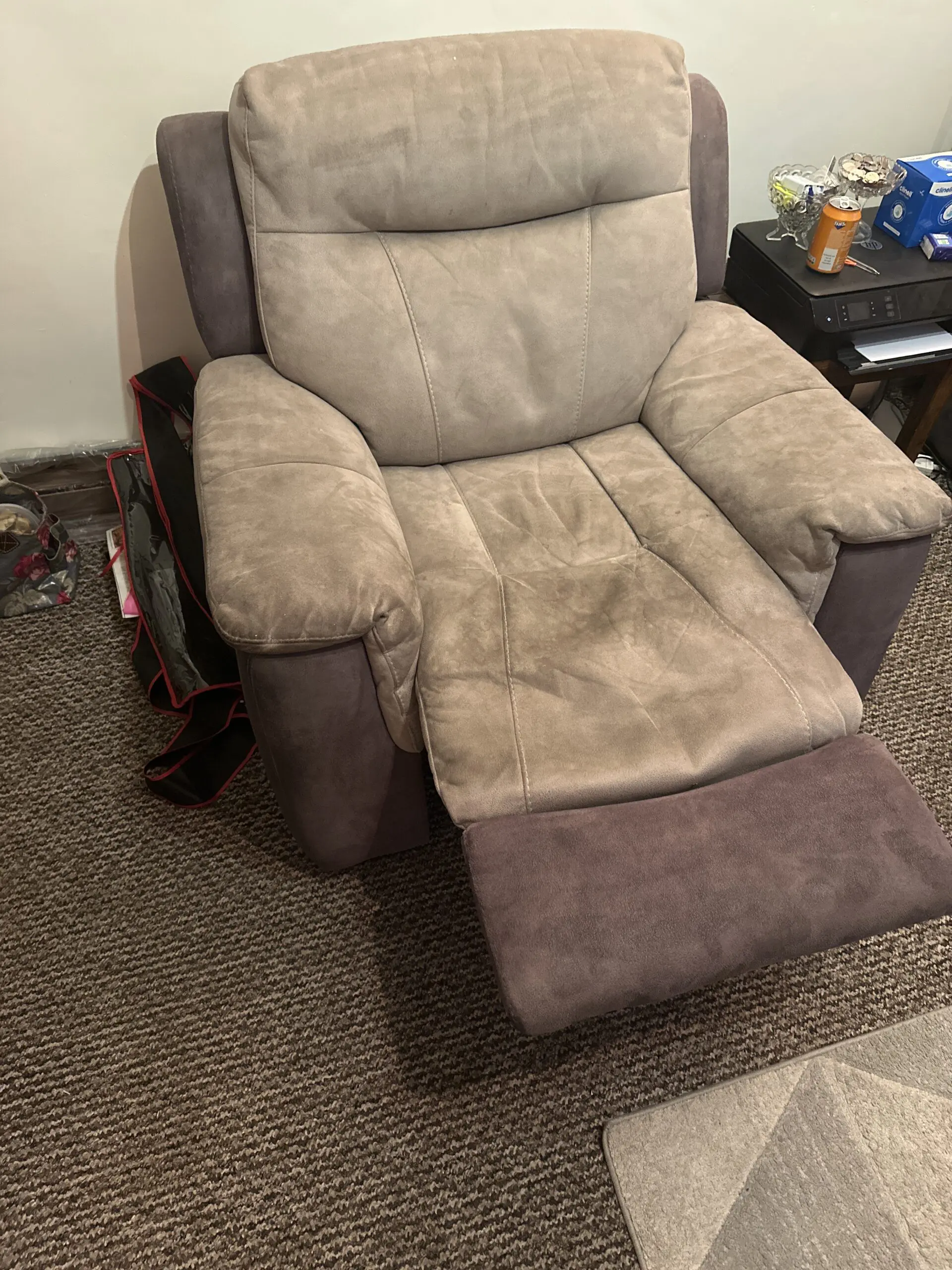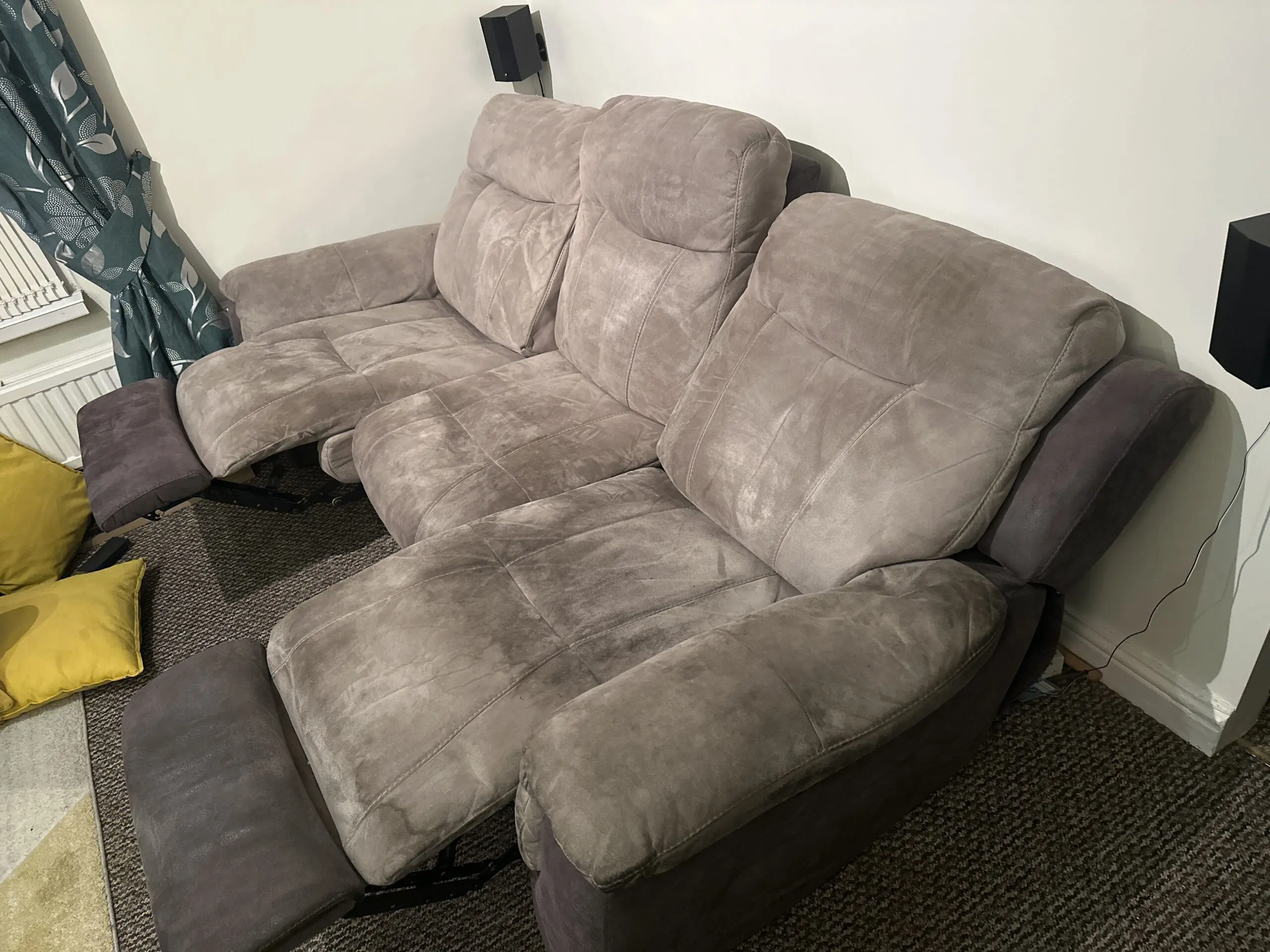 DFS 2 single manual recliners and a 3 seater electric twin recliner and center stays as seat, no rips, pet free and smoke free home