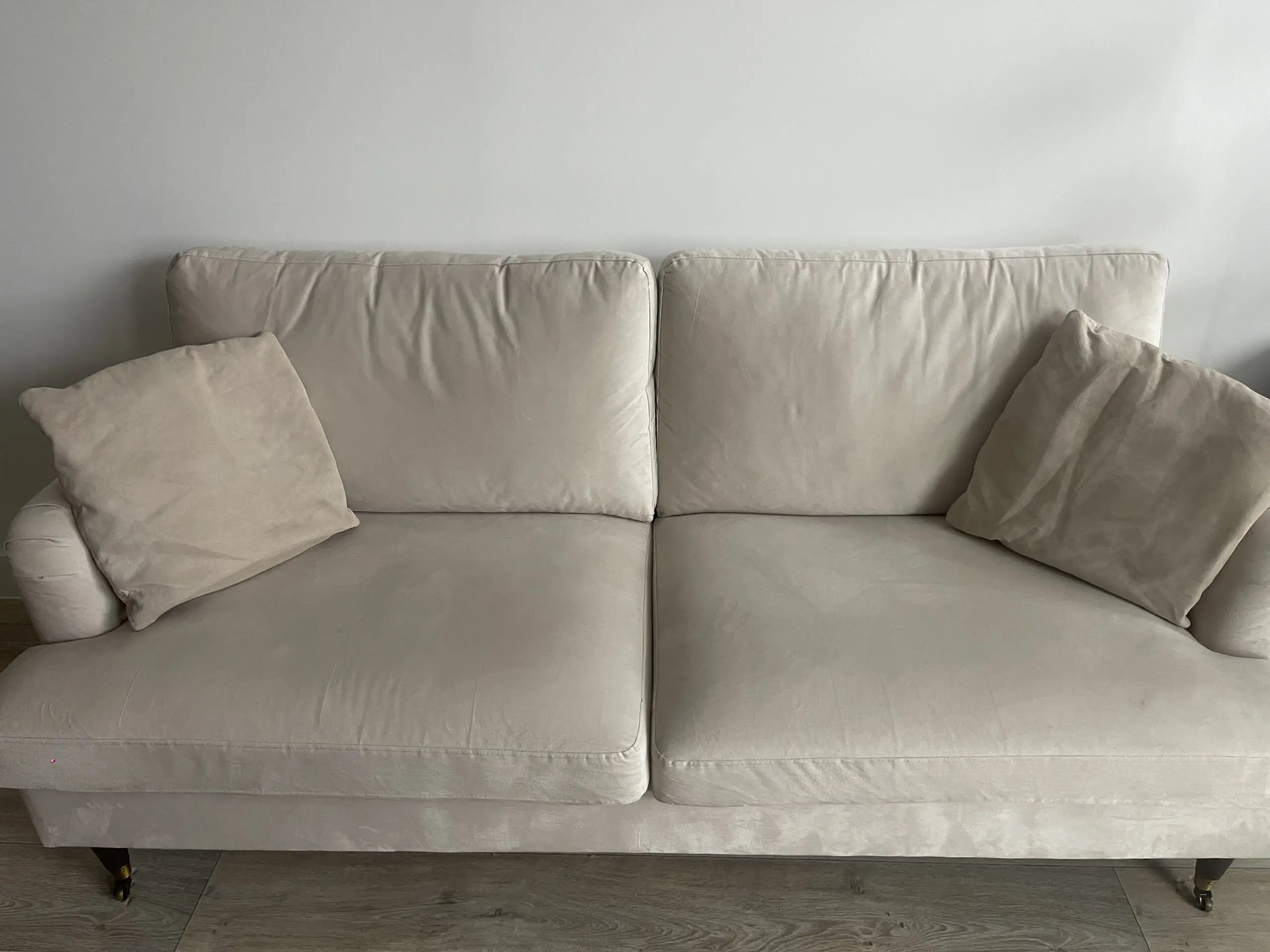 3 seater beige velvet sofa with antique brass castor legs