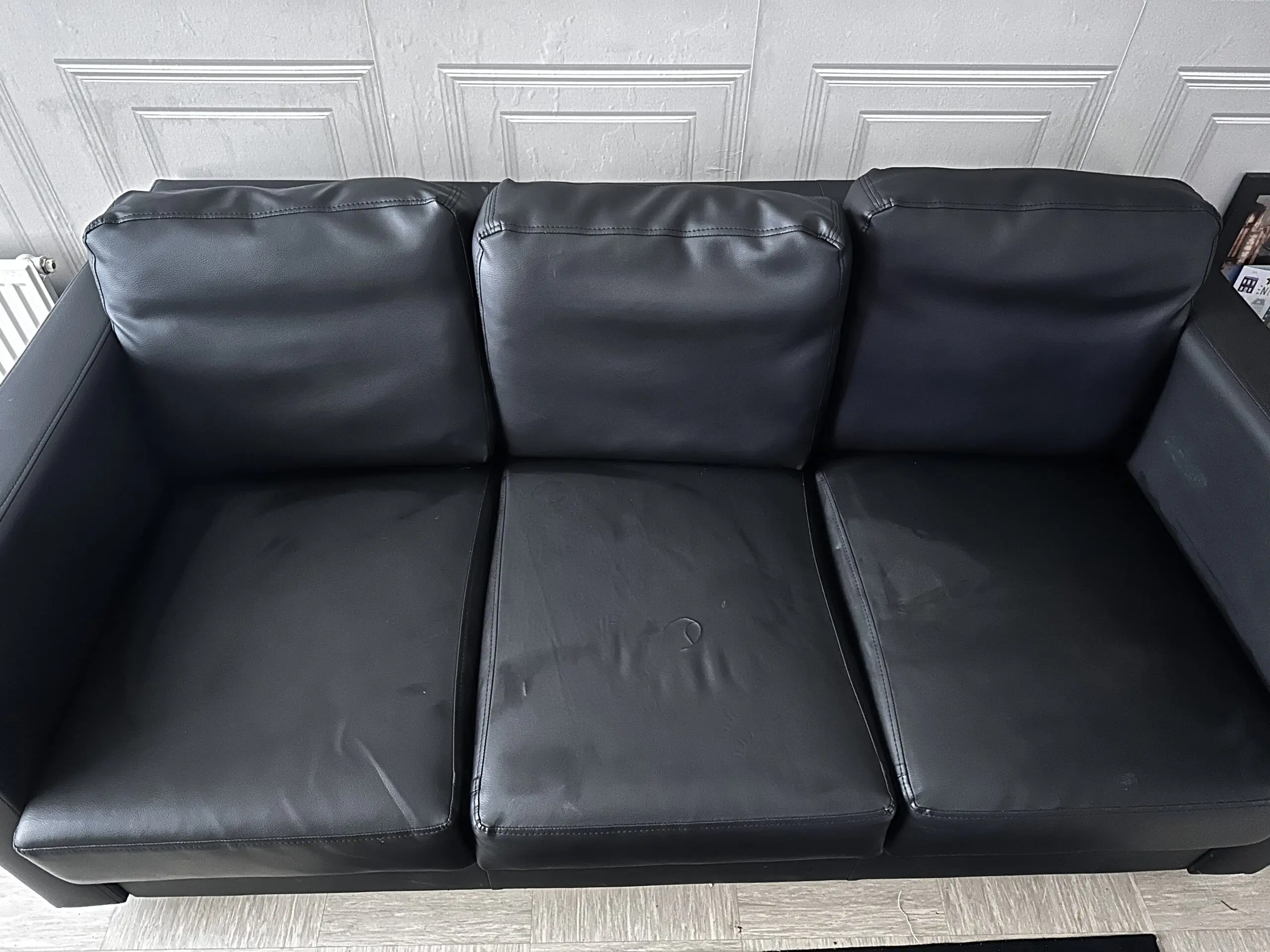 3 seater black leather sofa in great condition has one minor wrinkle other than that nothing is wrong with it owned for a little over a year barely used. Please excuse the photo as this was taken just after being cleaned and conditioned