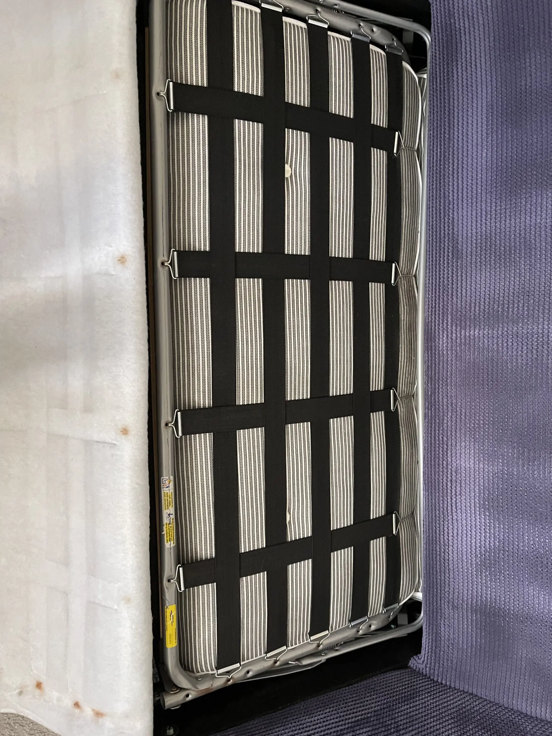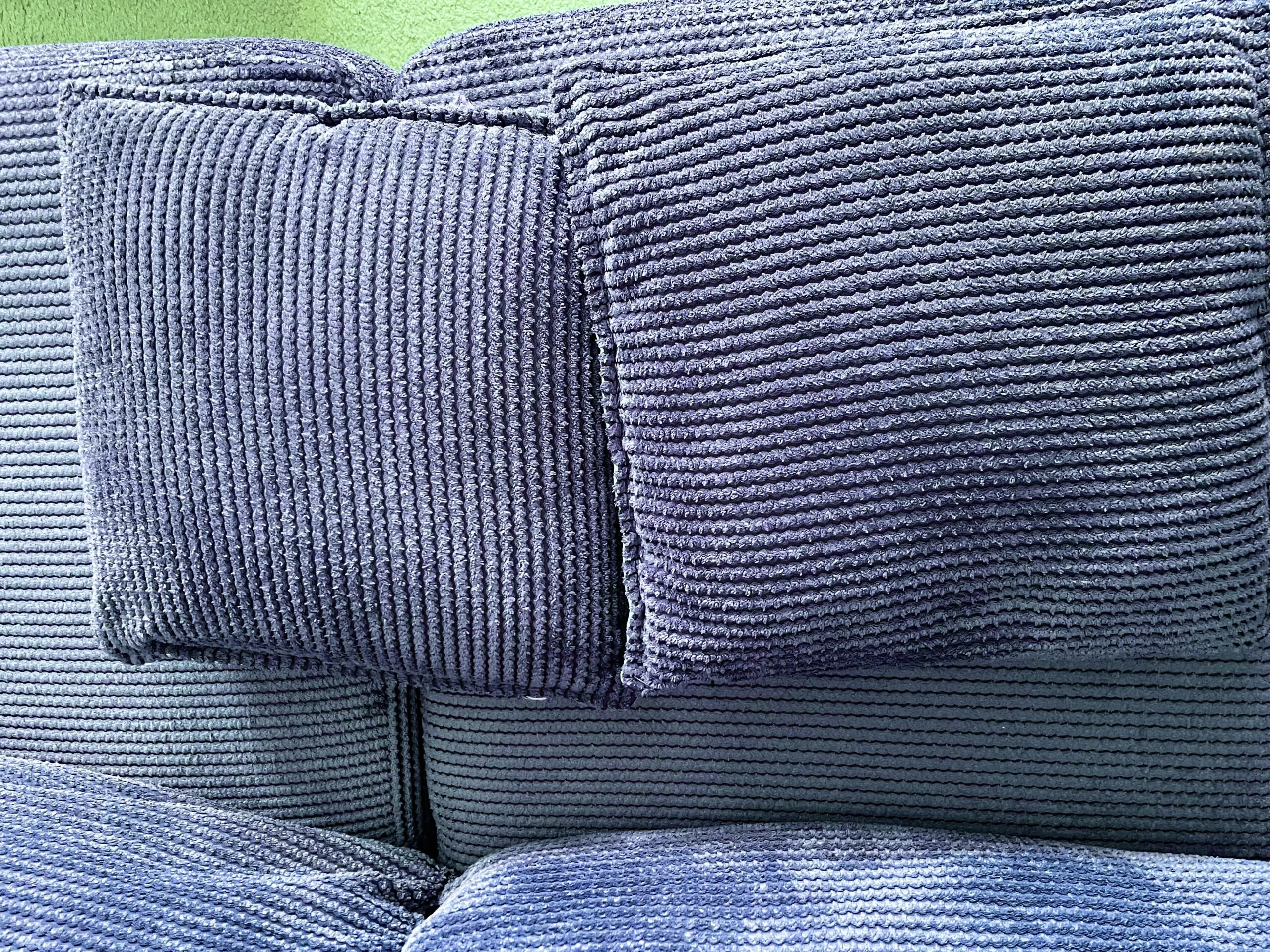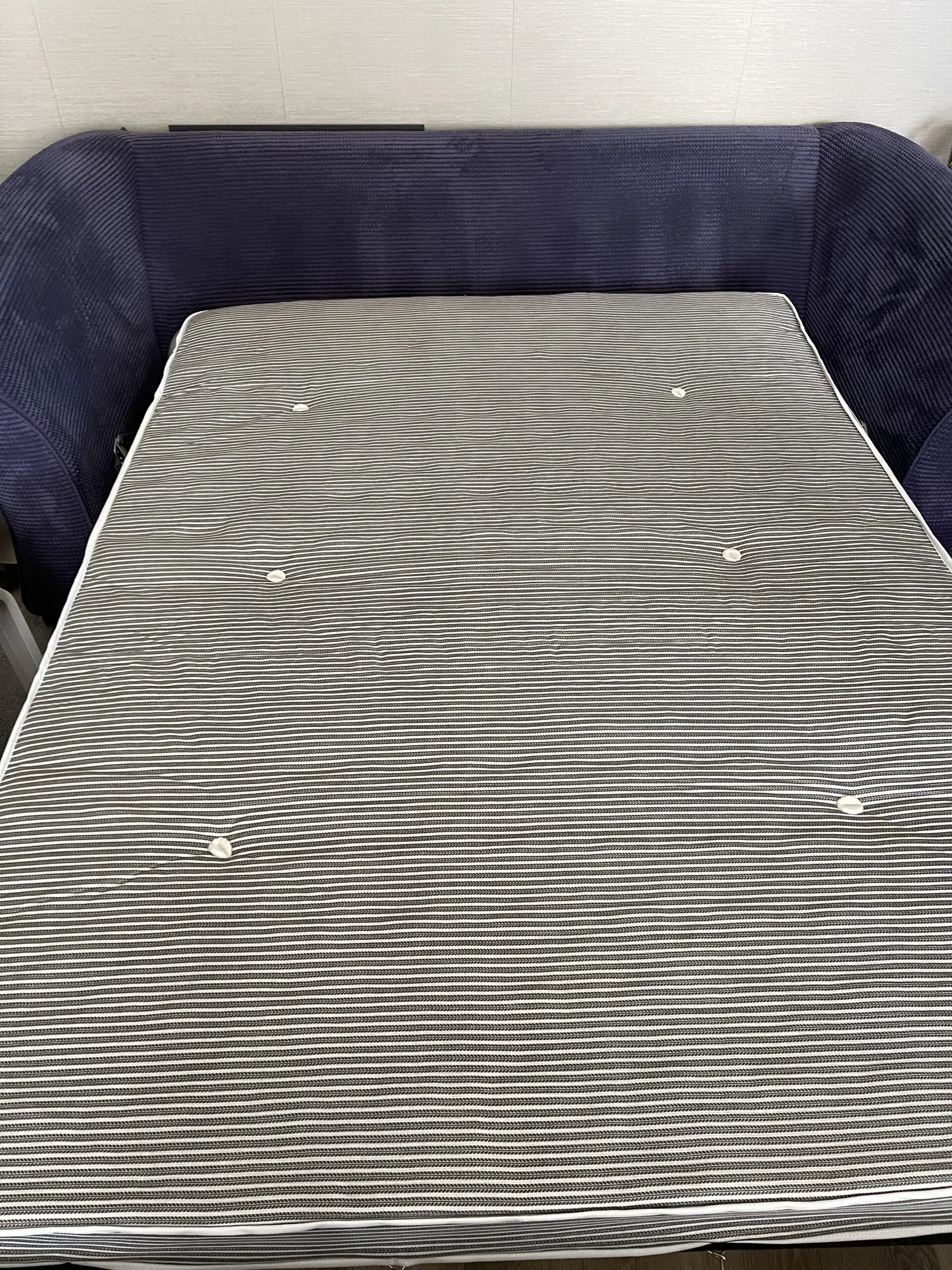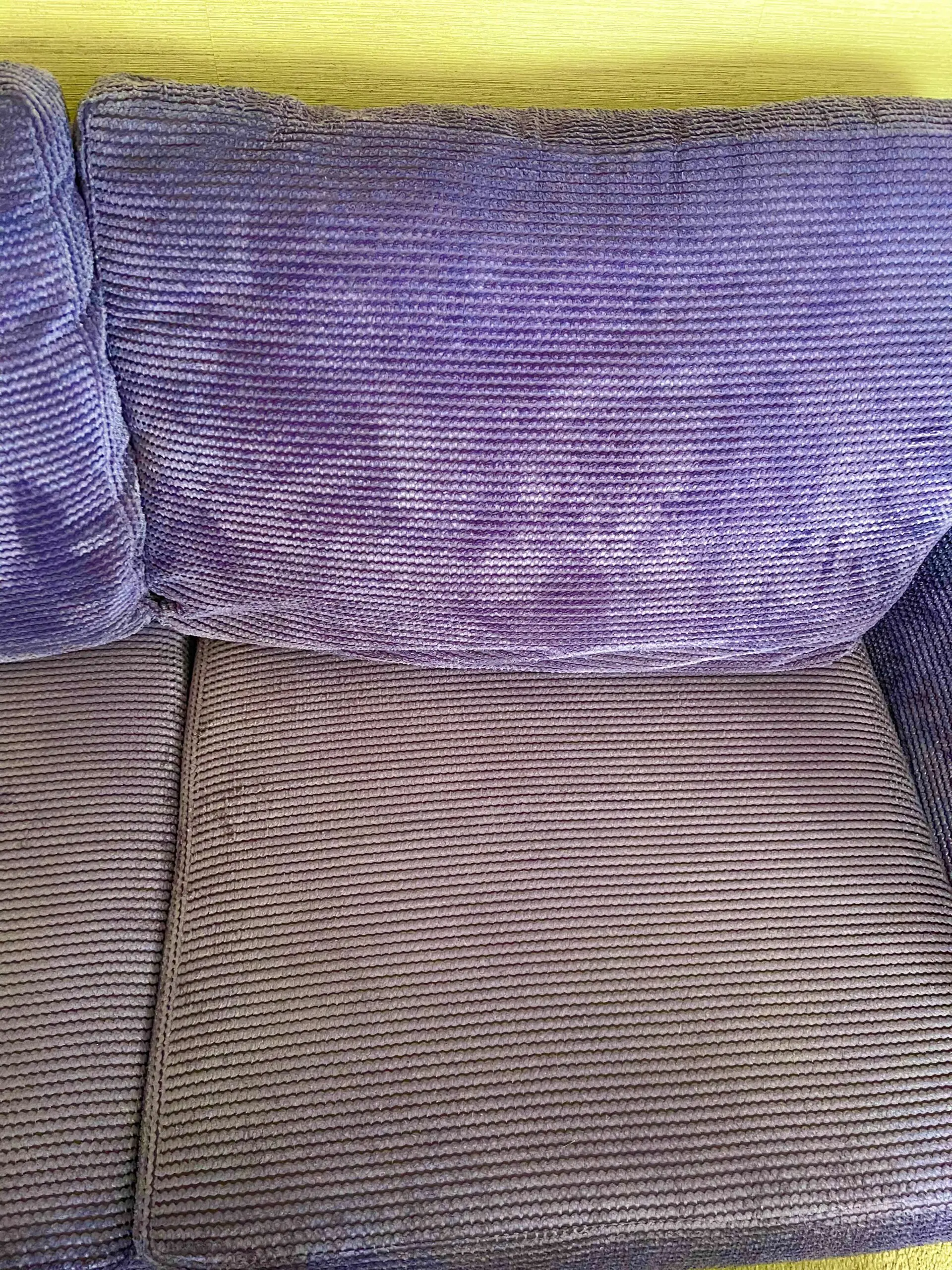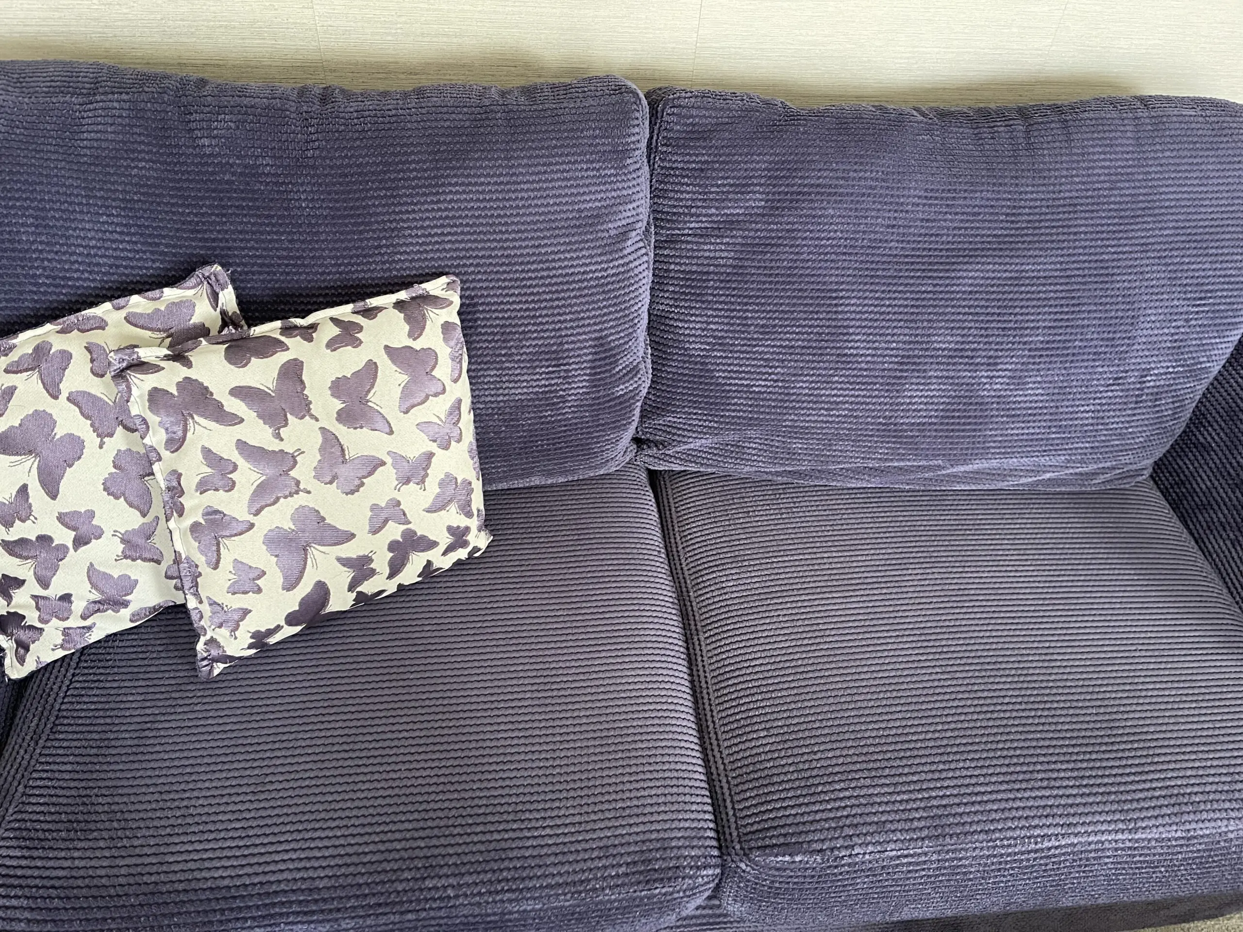 3-seater DFS pull-out sofa bed in great condition. Purple ribbed fabric. Dark feet. Professionally cleaned about once a year. No visible stains or discolouration. Smoke-free home. Can be sold with the footstool.