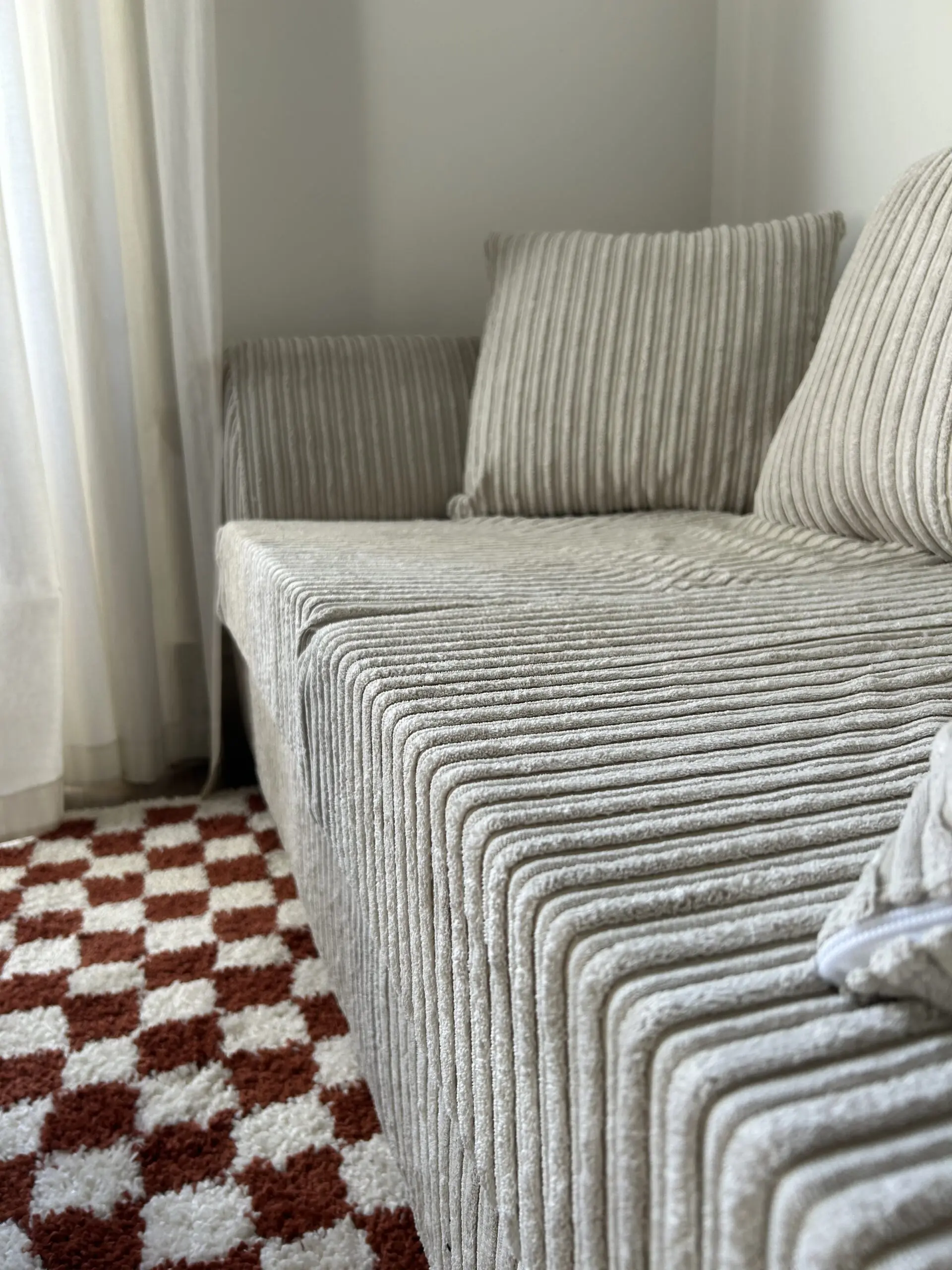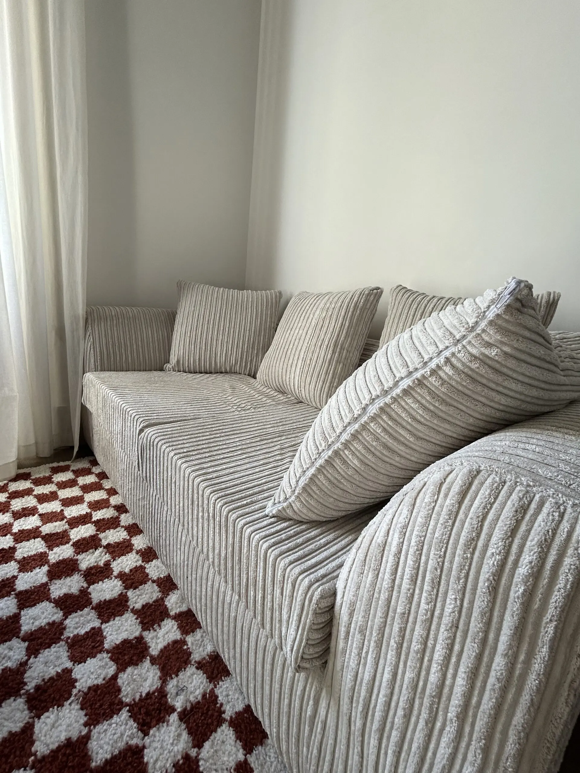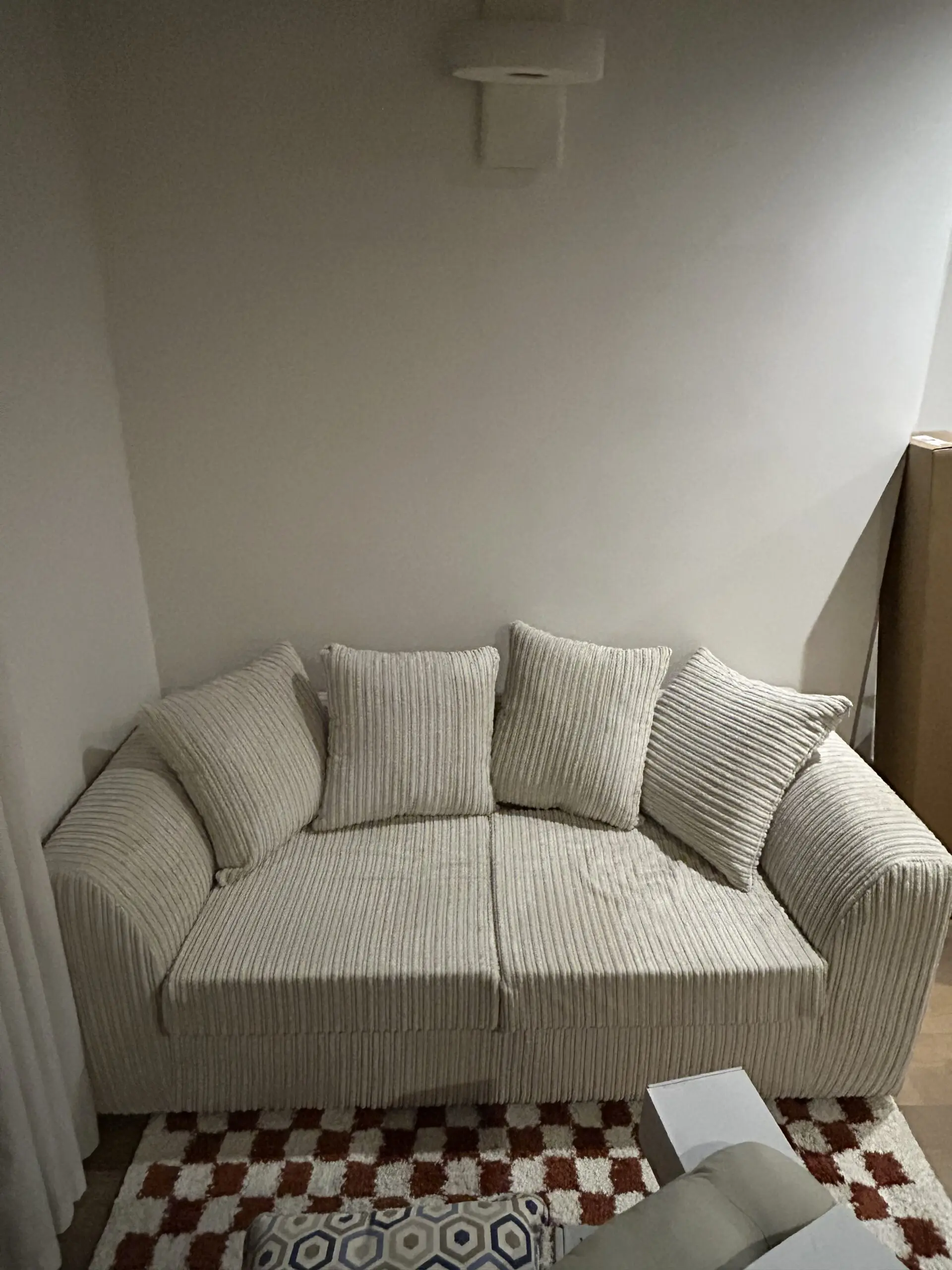 Corduroy material, 3-seater sofa in cream. Bought as a sofa-gap in between home moves so need it gone asap.