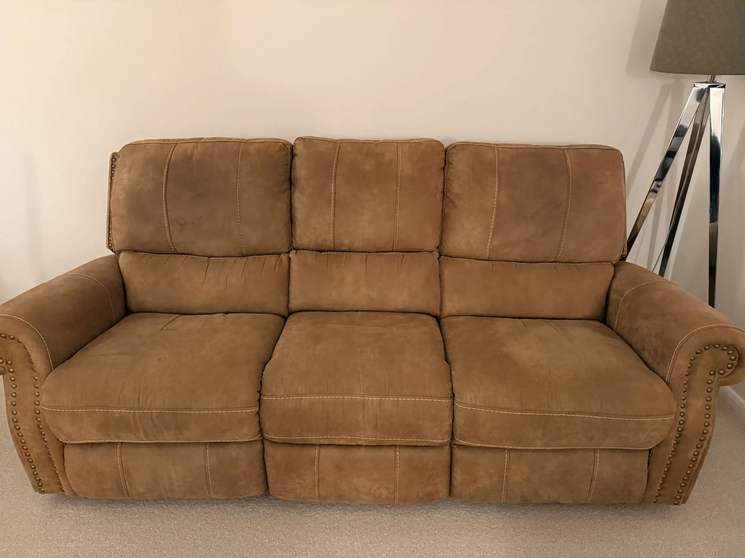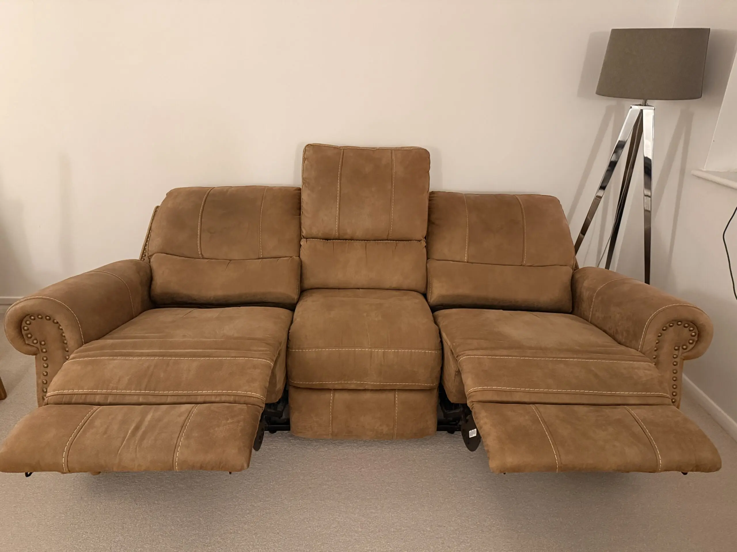 Bring home comfort and style with this 3-seater electric reclining sofa from Oak Furniture Land. Upholstered in a warm tan/biscuit microfiber-style fabric, it offers a soft, suede-like feel that suits most living room decors.