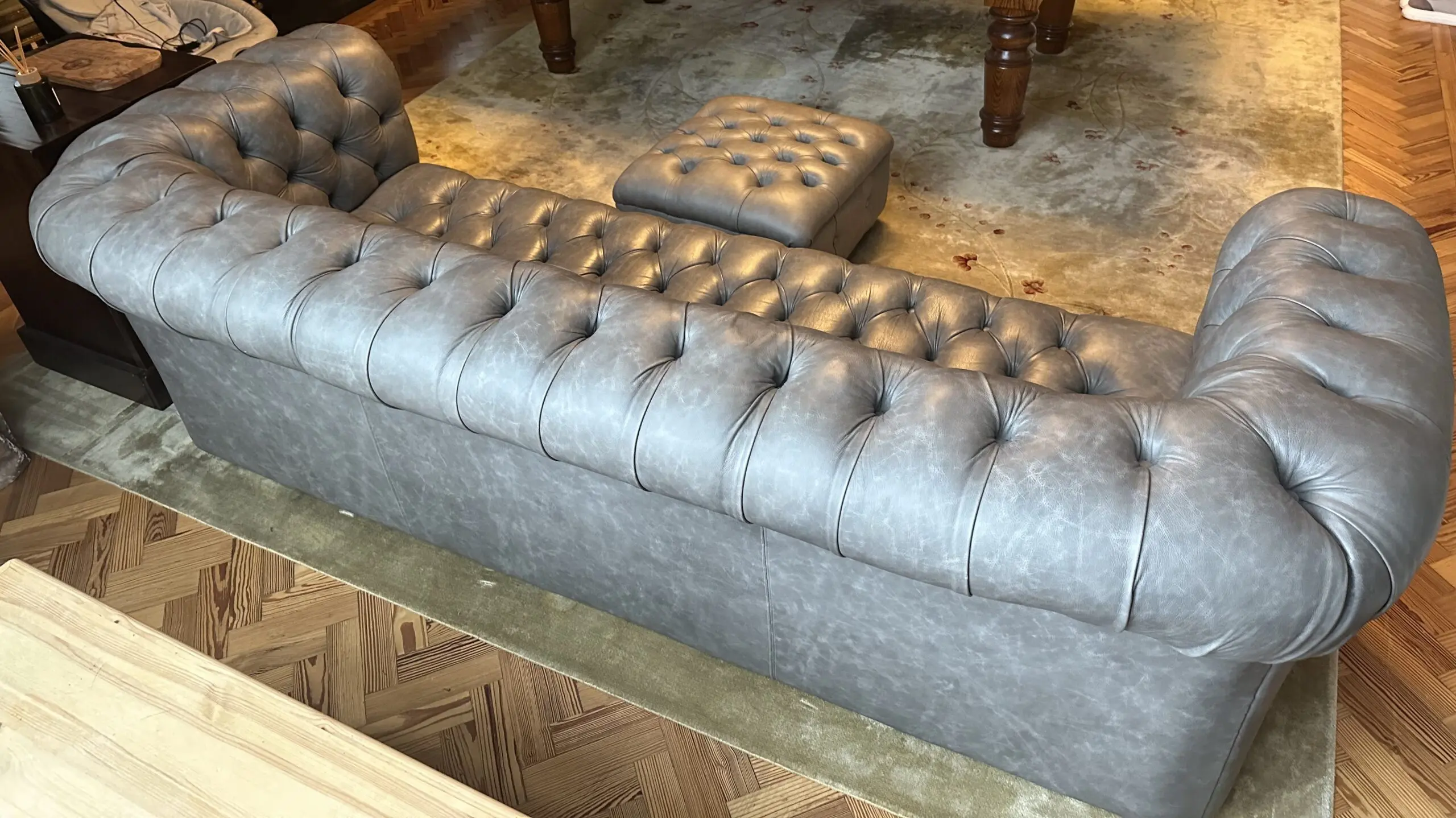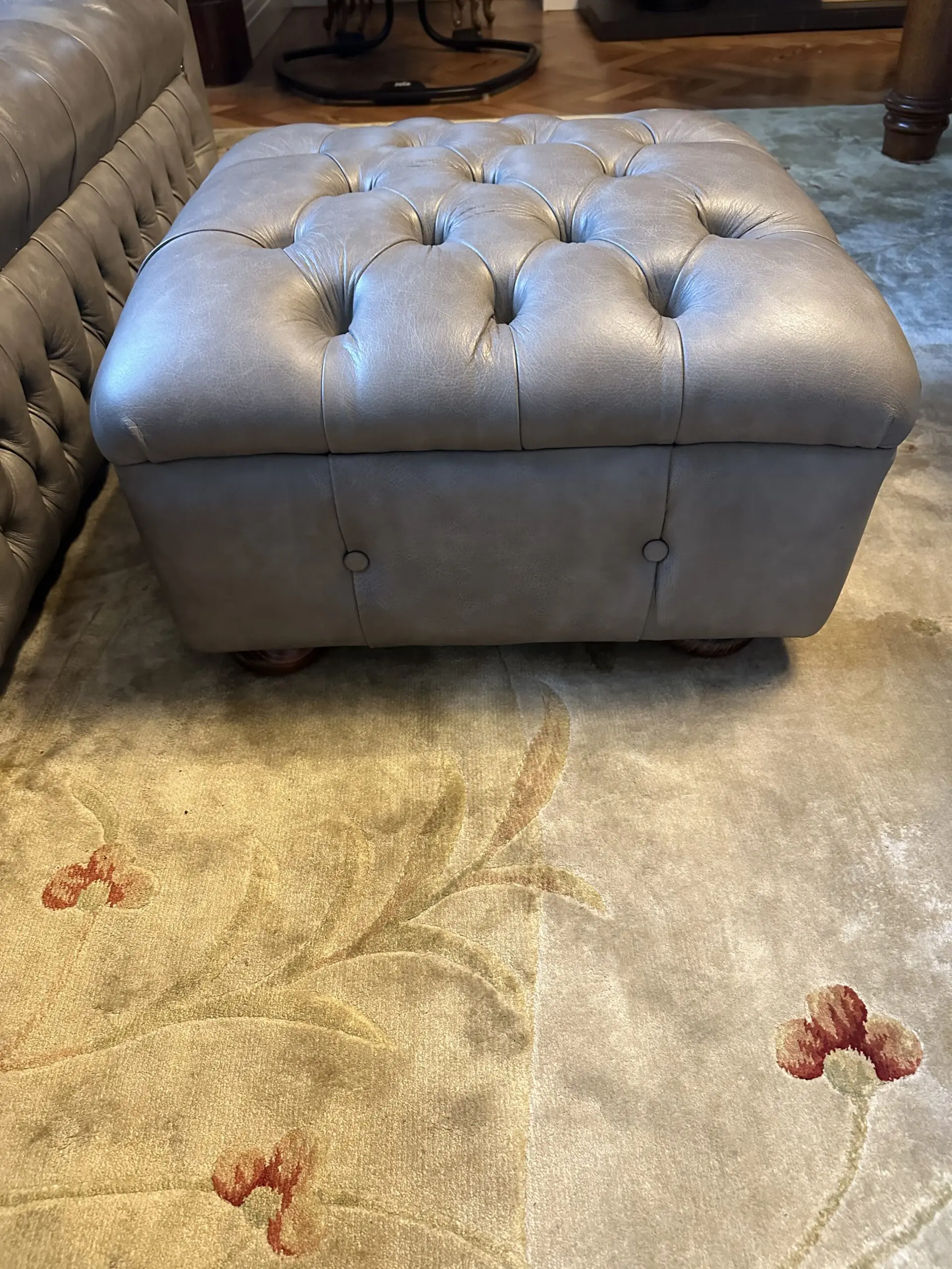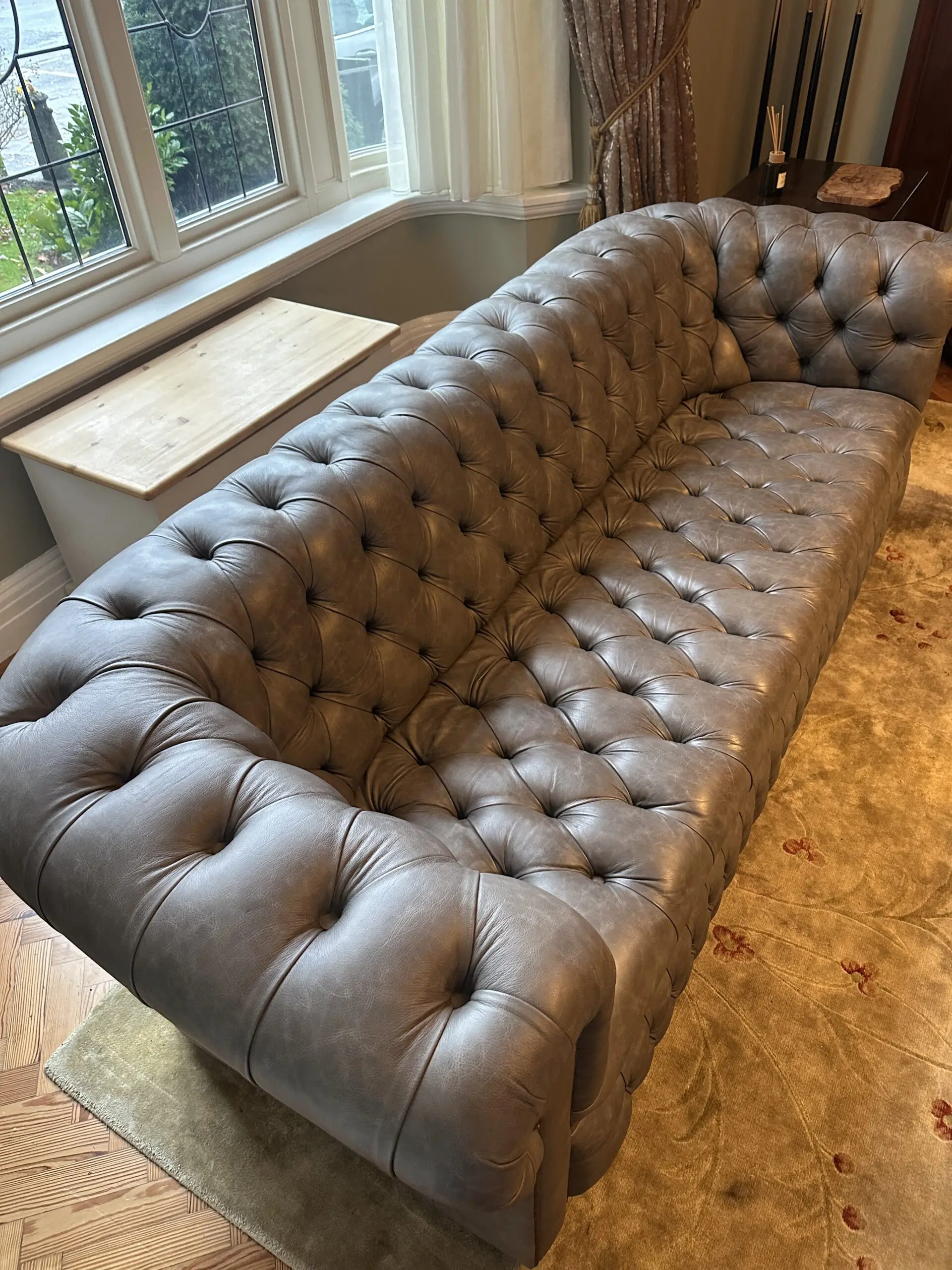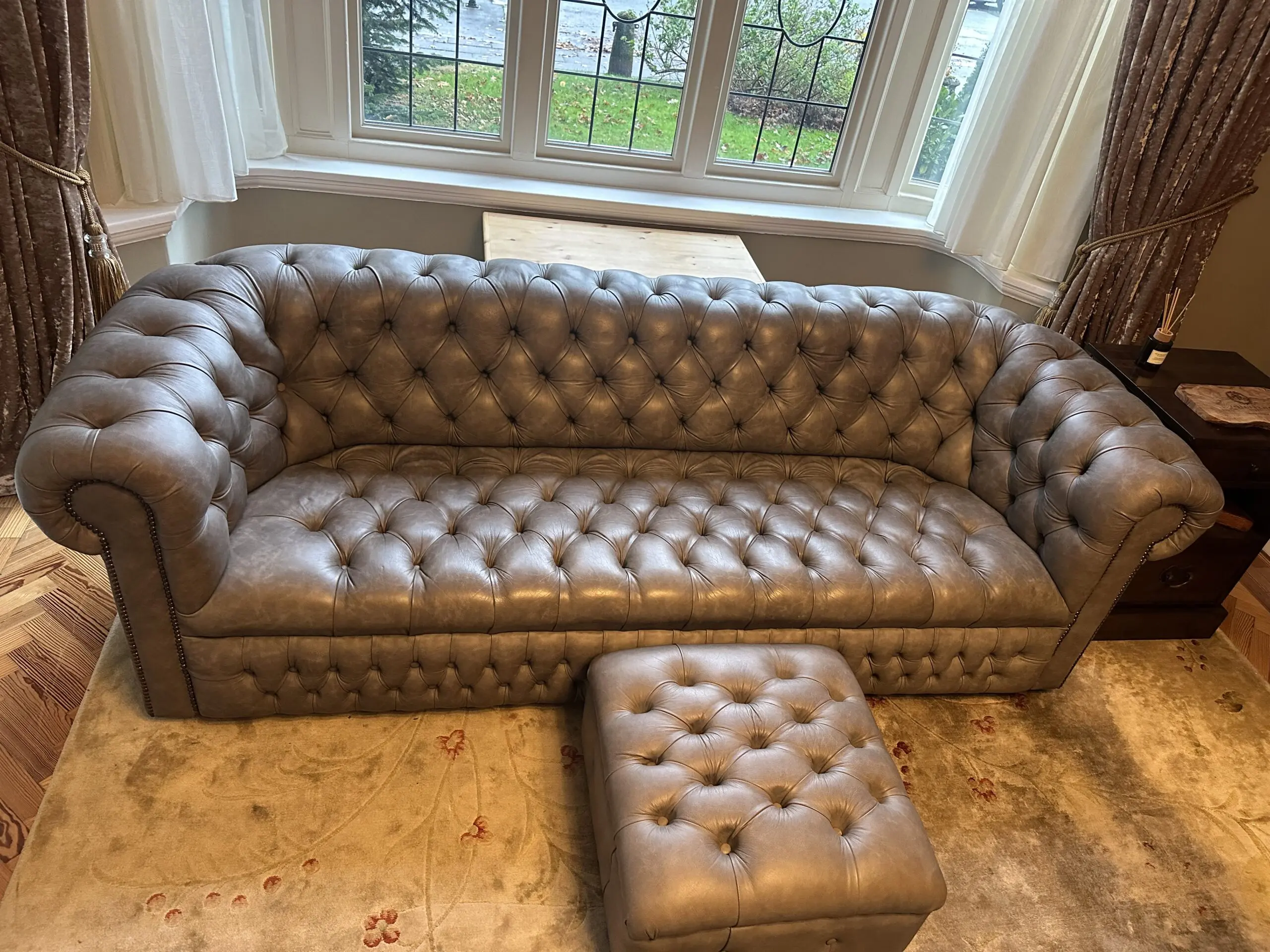 3 seater grey leather Chesterfield sofa with deep buttoned detailing, scrolled arms and wooden feet. Listing includes matching footstool.