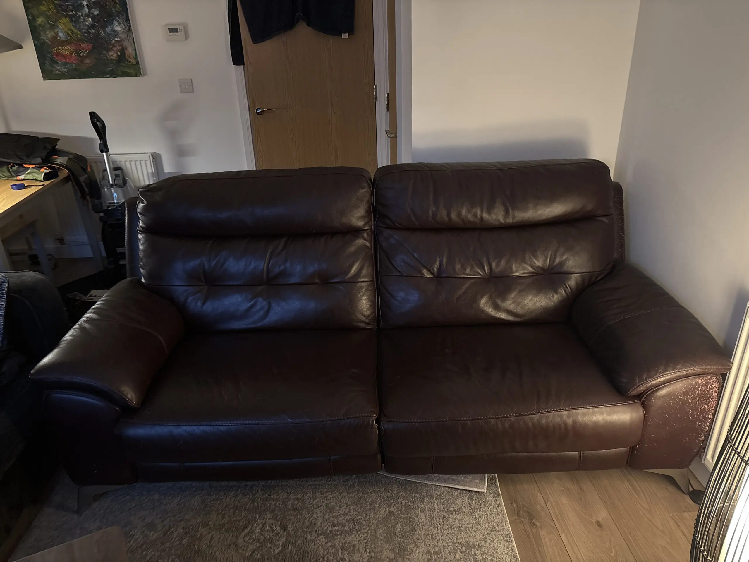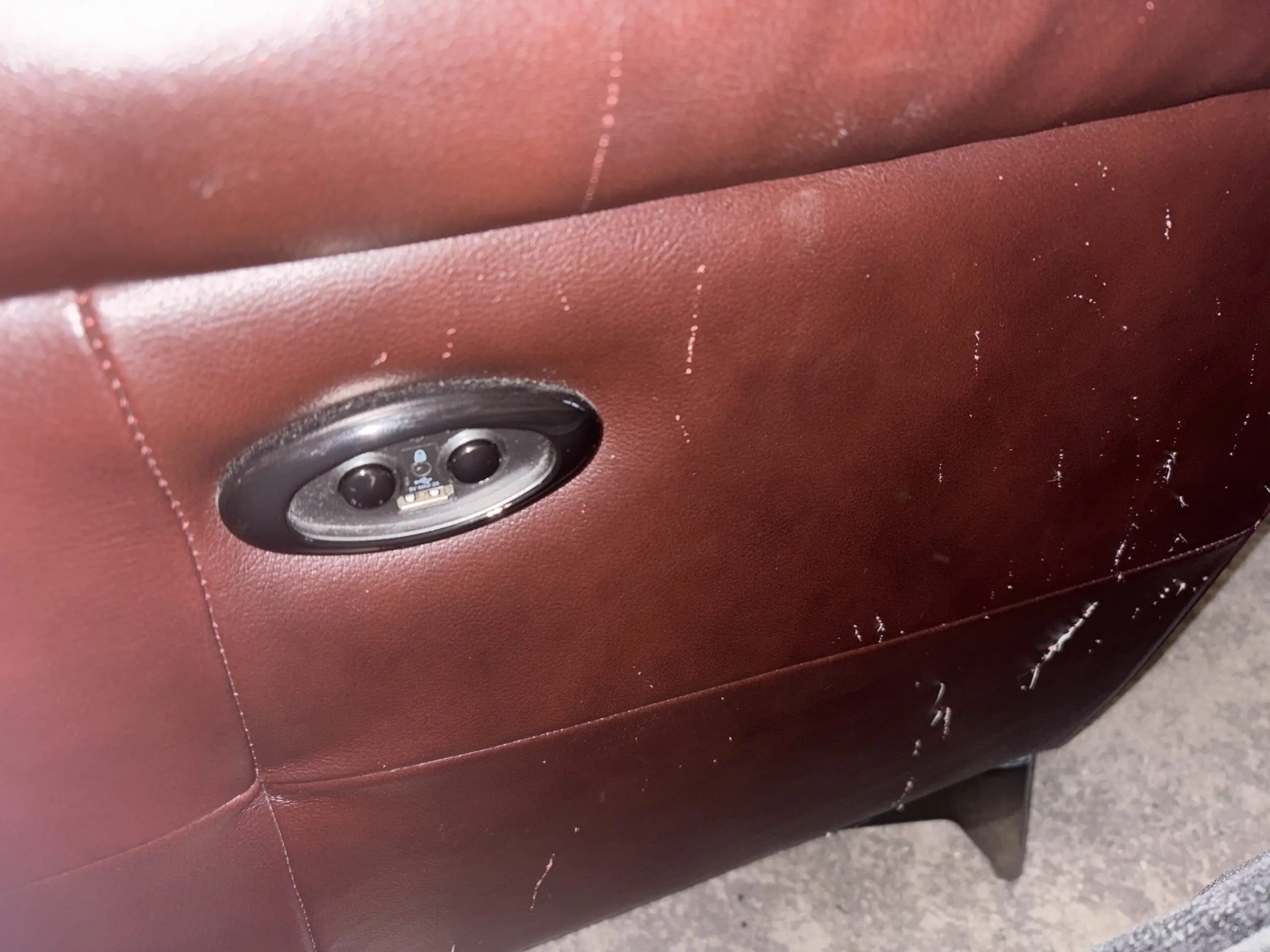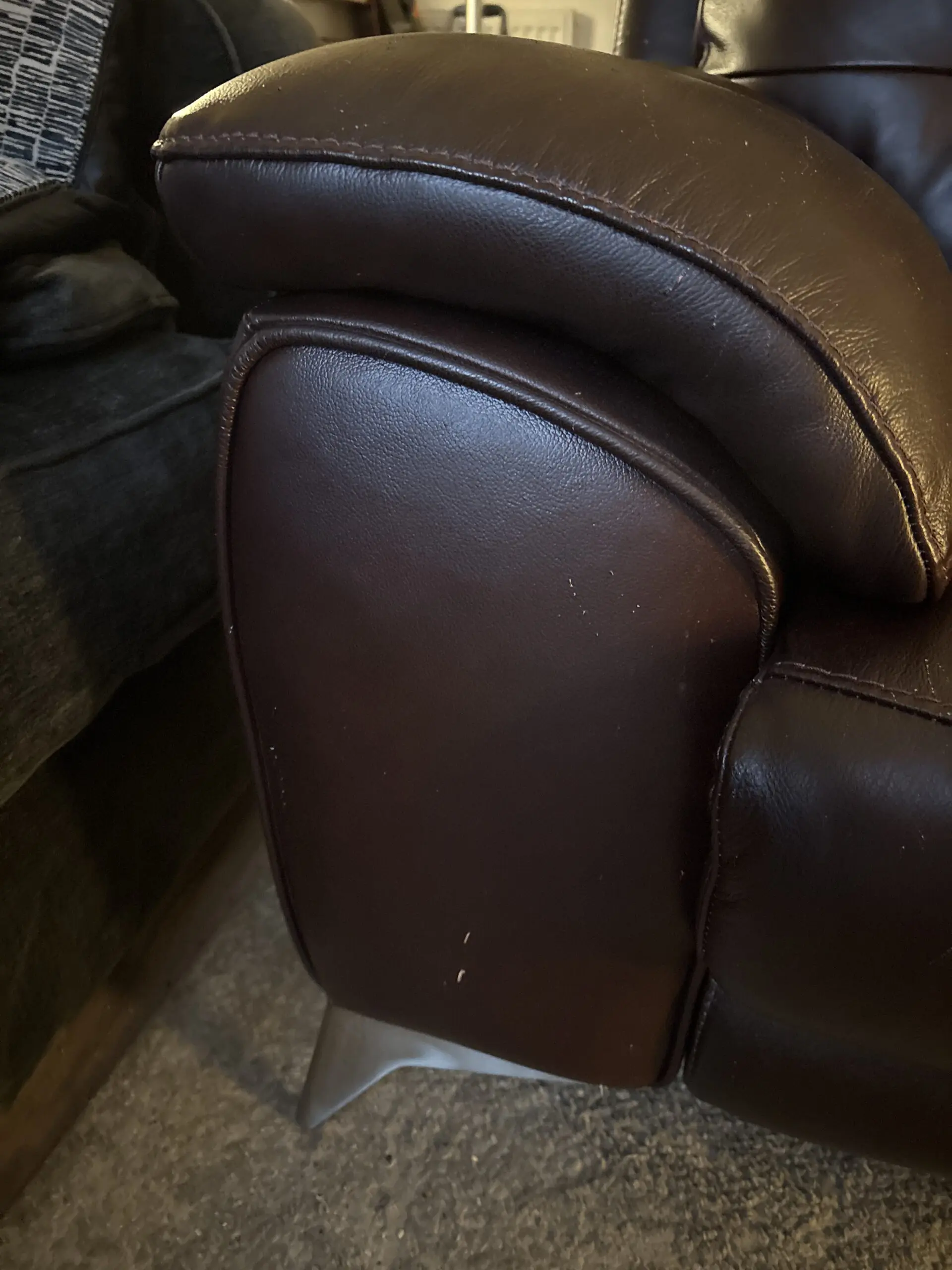 About 3 and a half years old. Seats are still good. Recliner still works well. Has cat scratch marks on sides and back.