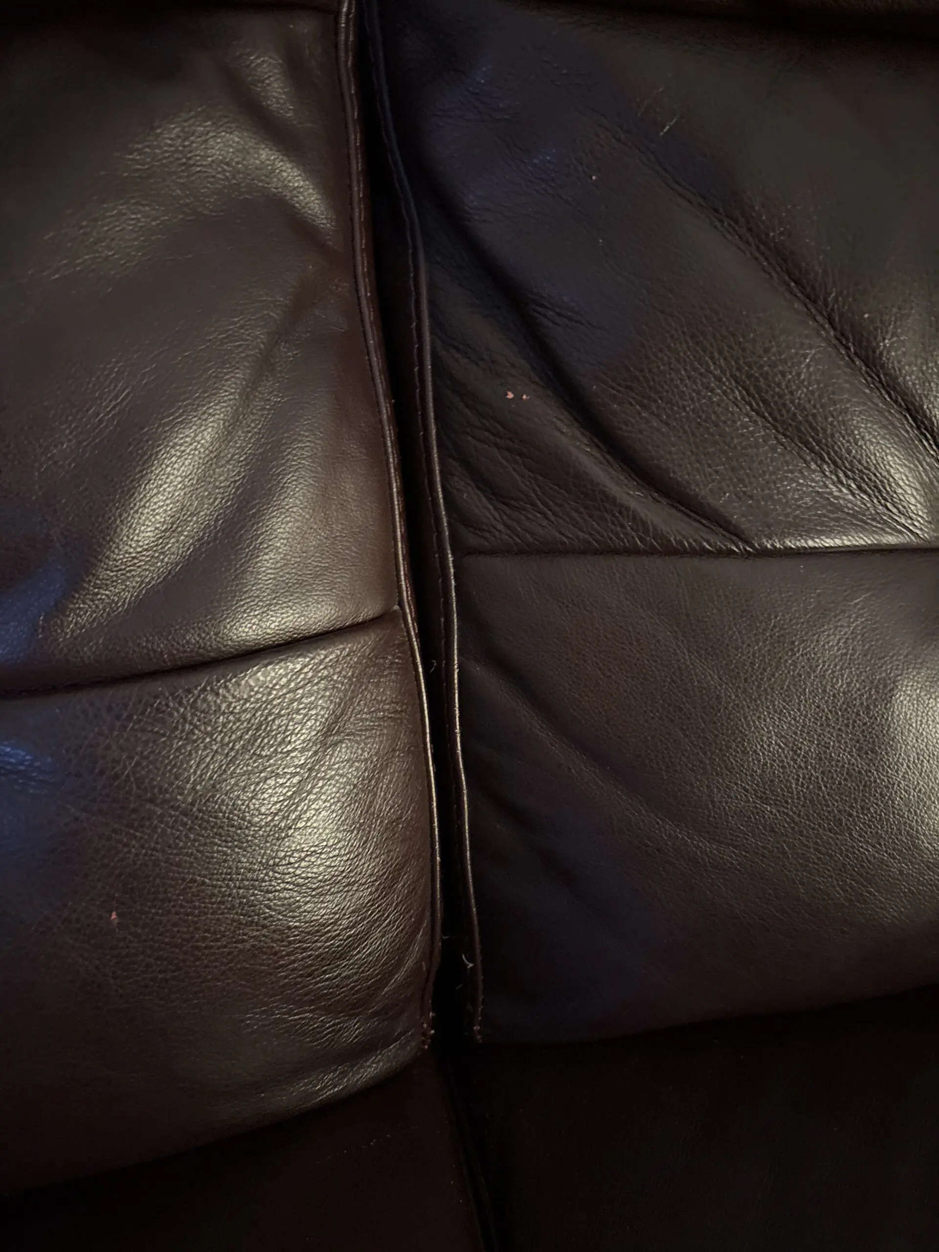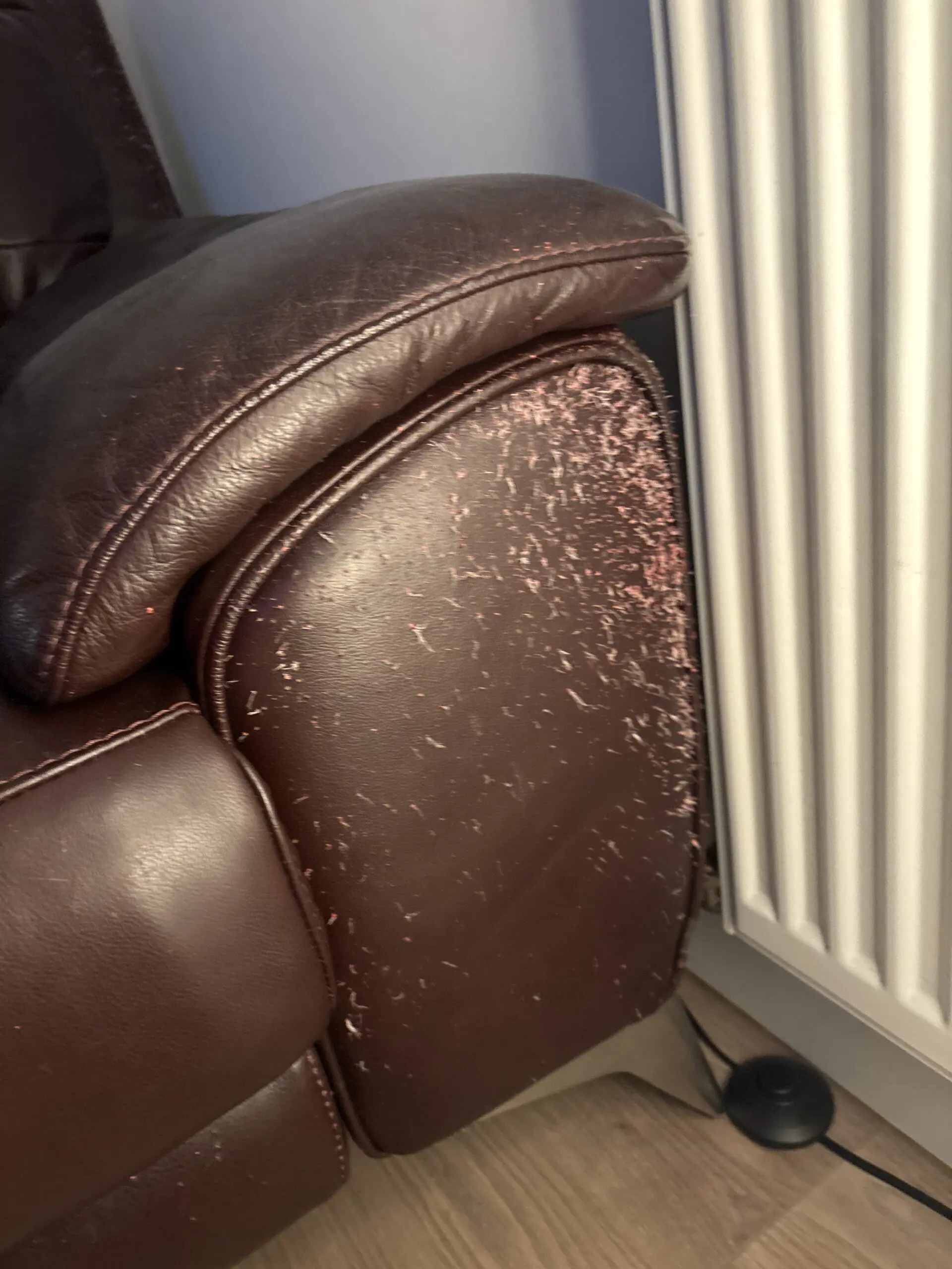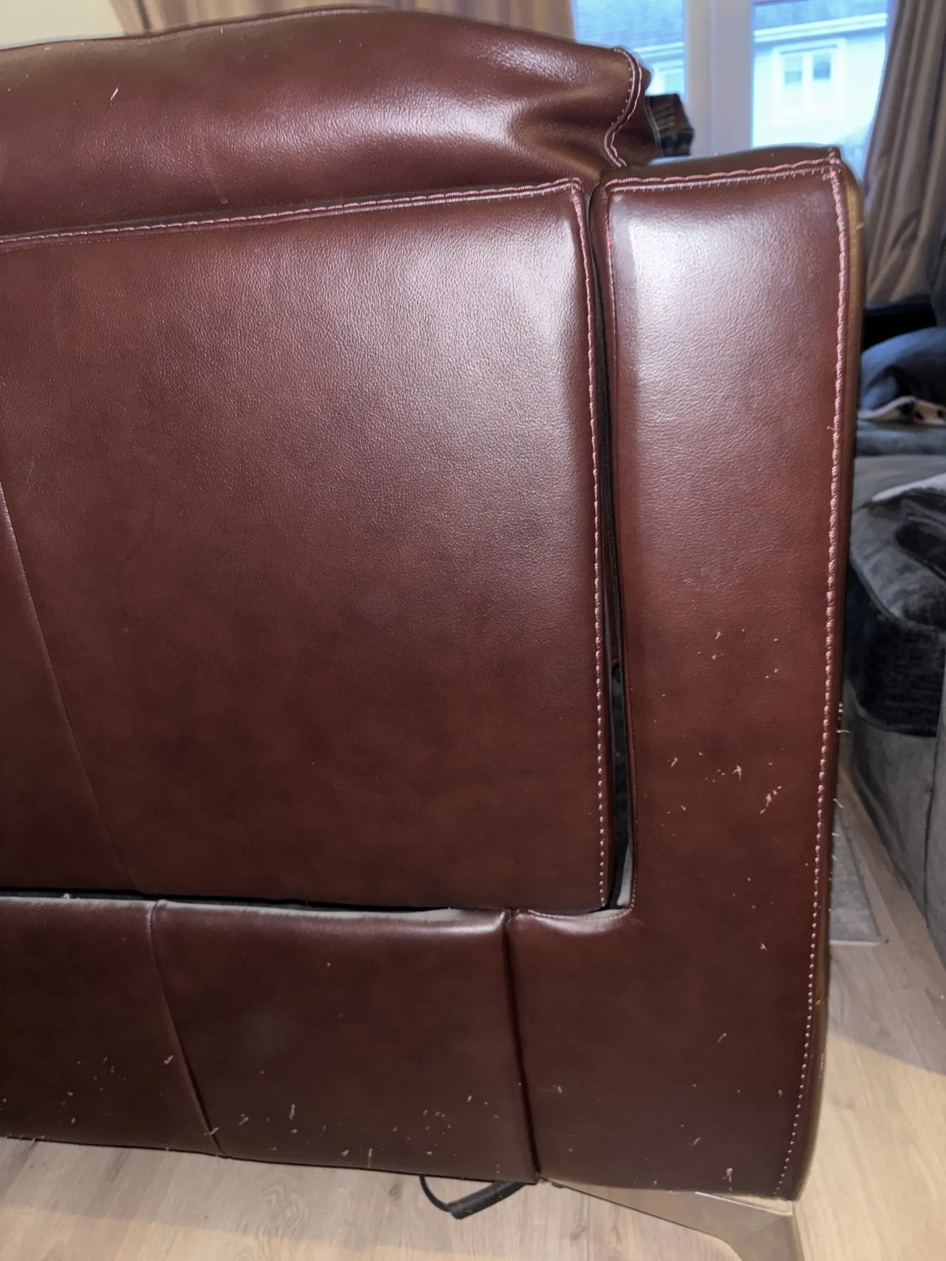 About 3 and a half years old. Seats are still good. Recliner still works well. Has cat scratch marks on sides and back.