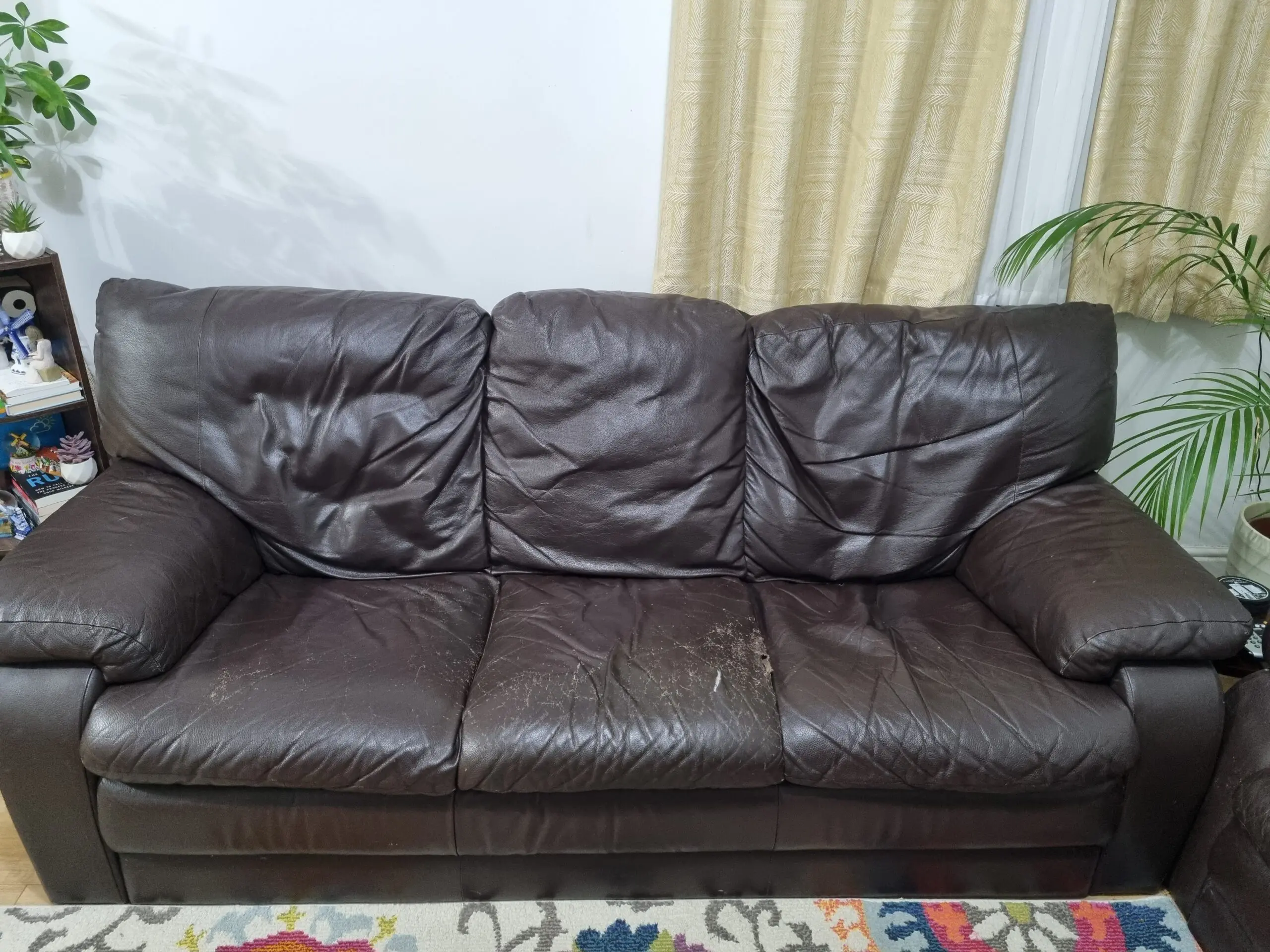 Dark brown leather sofa. 20 yrs old. Comfortable and functional. Wear and tear is the reason for disposal.