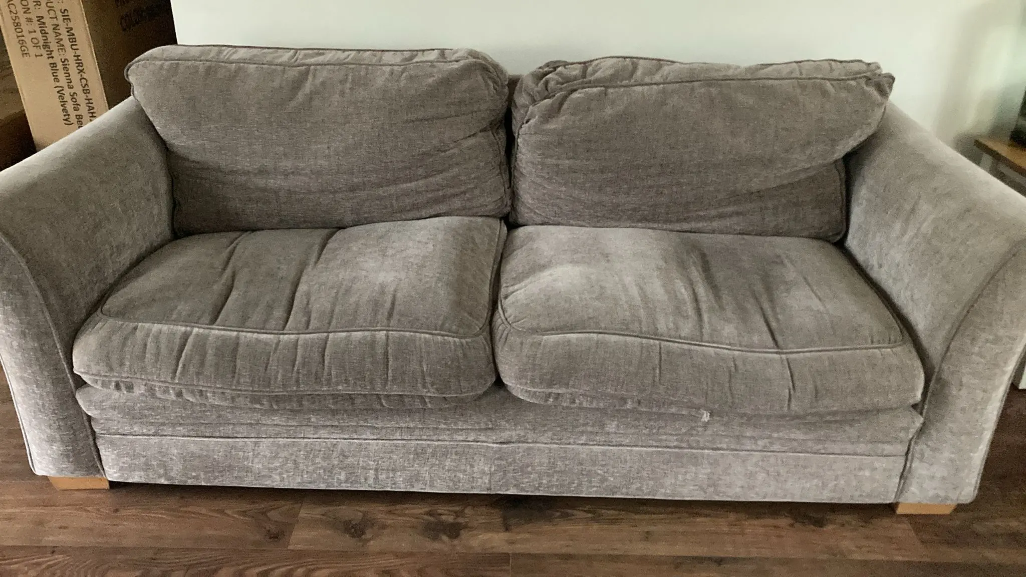 3 seater sofa. Slight grey on one of the cushions – could be sown up
