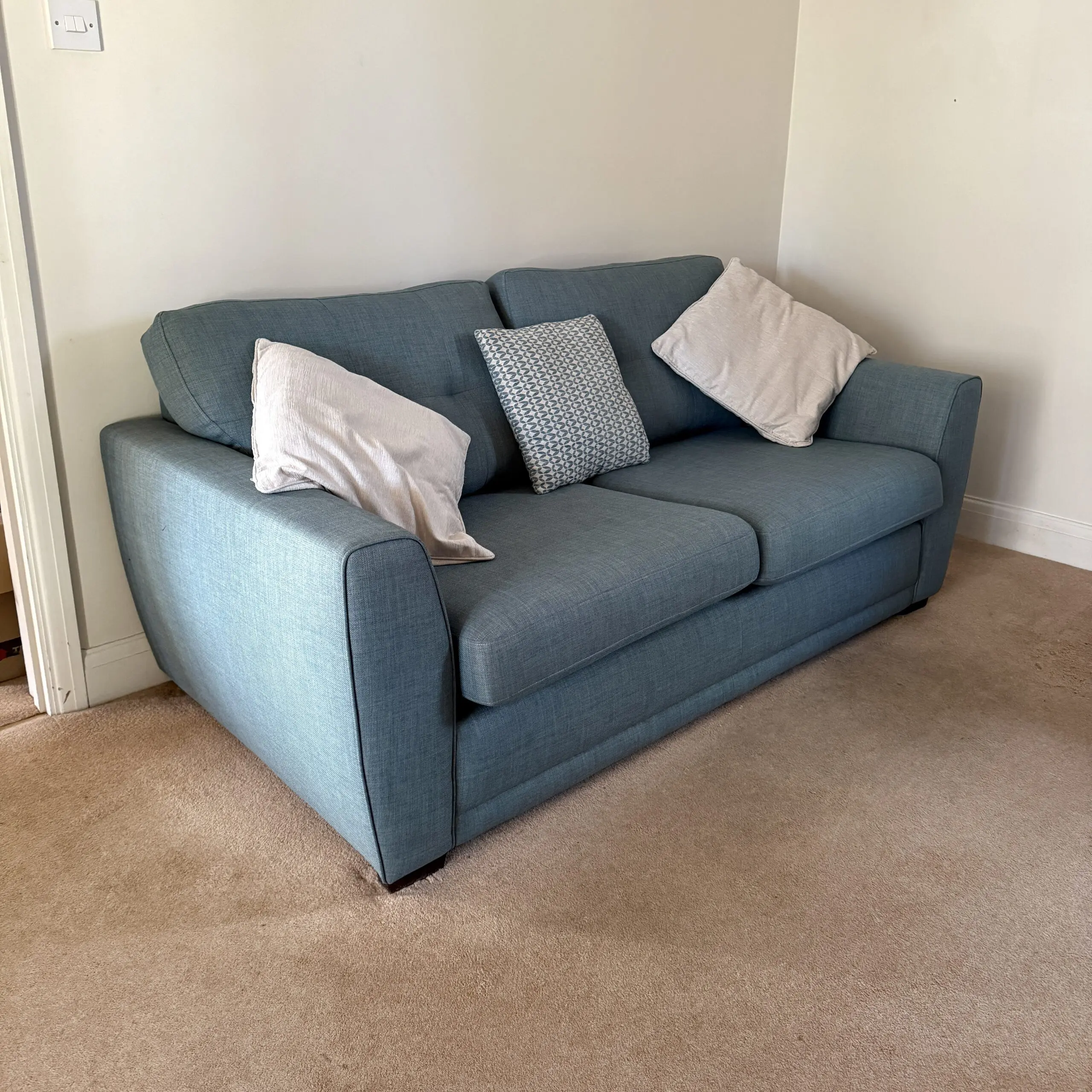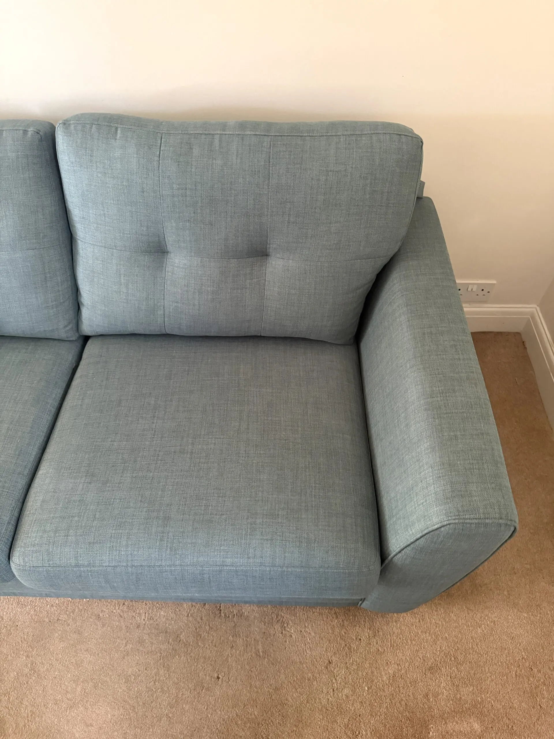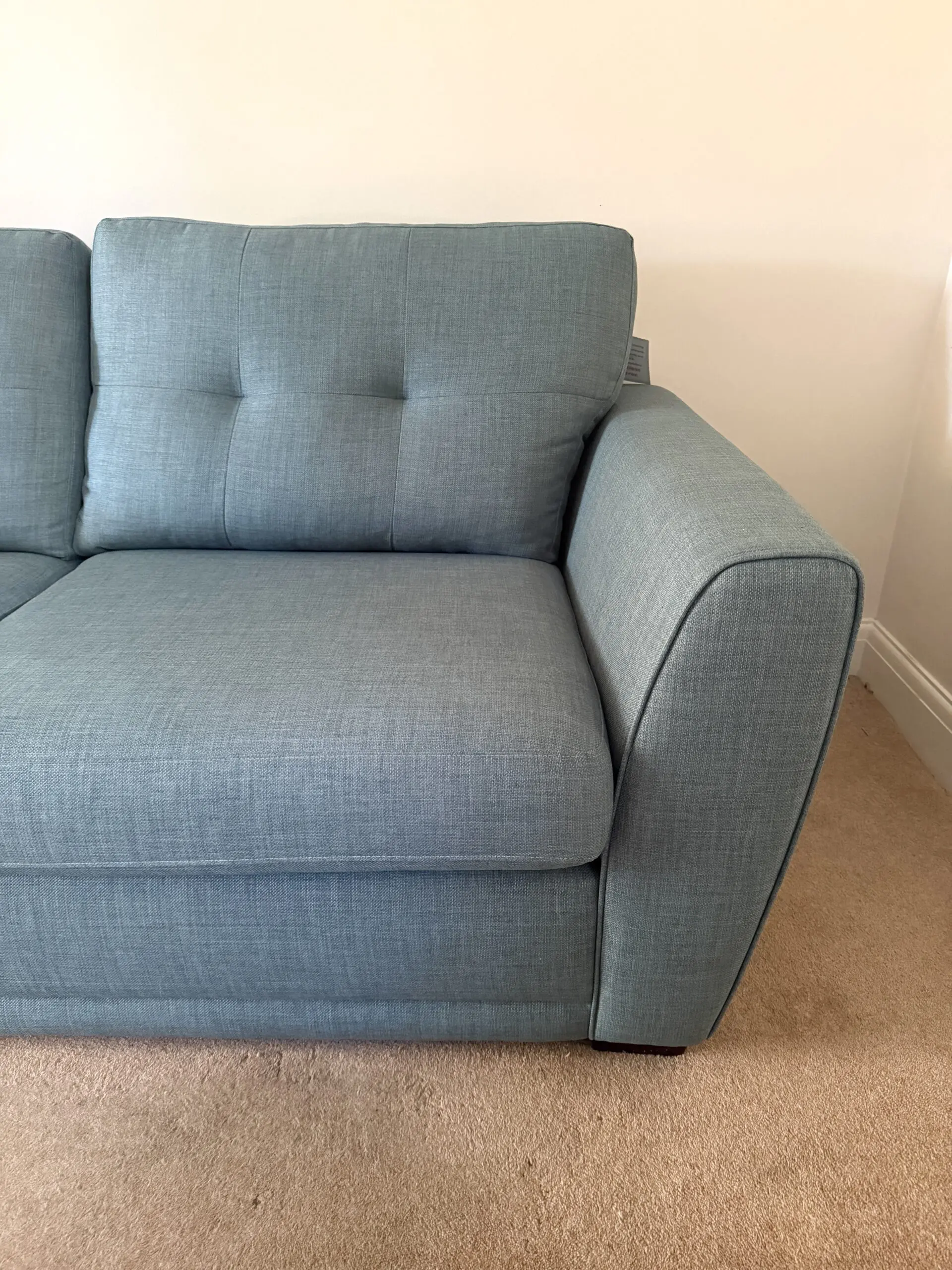 This lovely three seater sofa was purchased from DFS in January 2023 and has minimal use. The Kian sofa has a flat weave fabric in sky and is in great original condition. A matching two seater sofa is available on a separate listing.