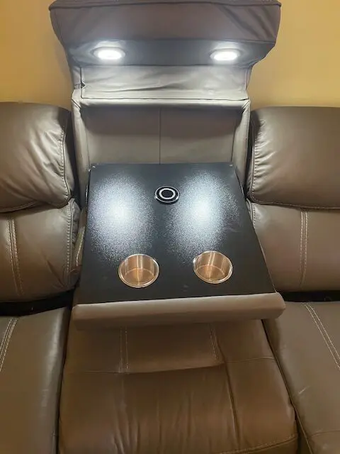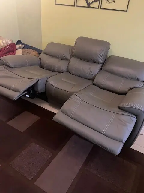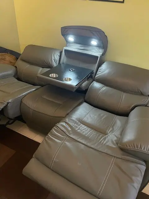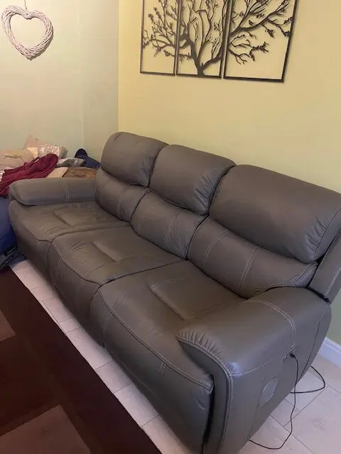 This is a 3 seater TechSofa in grey leather with Bluetooth speakers, 2 power recliners, 2 power headrests, recliner position reset, 2 USB charging points, drop down table with two stainless steel cupholders, 2 LED reading lights and a wireless charging point.