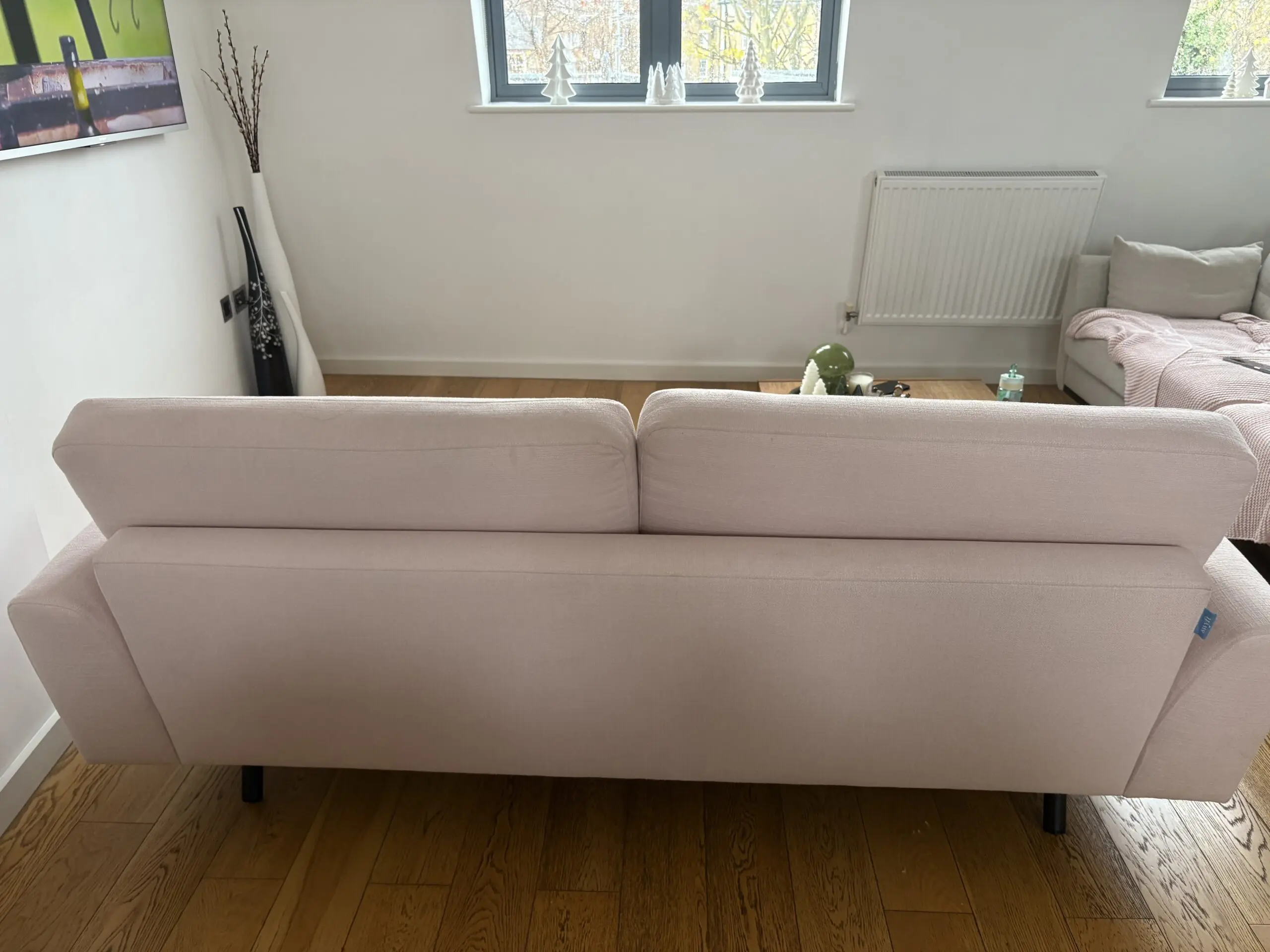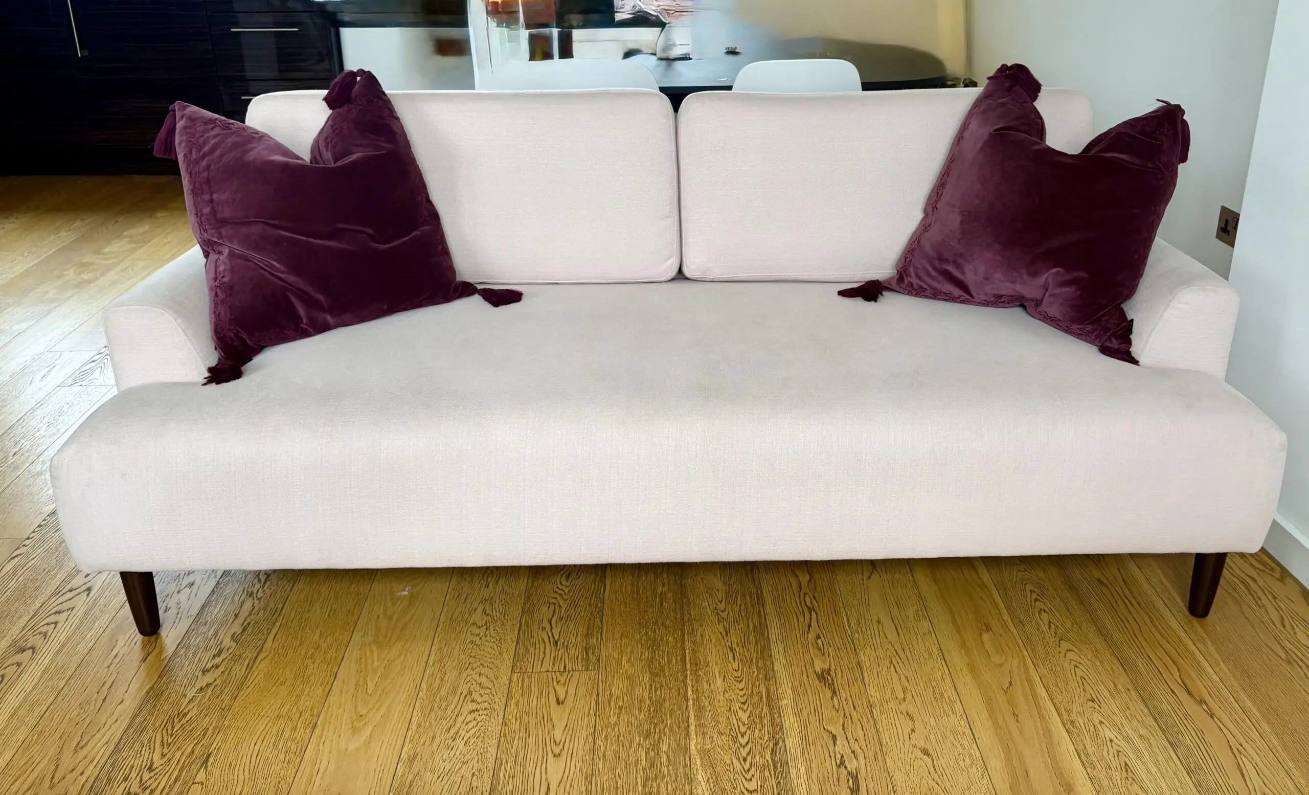 Swift 3 seater sofa in pink linen, hardly. Used only one year old, selling due to relocation. The sofa breaks down into easily transportable sections making it easy to navigate narrow spaces. Cushions not included