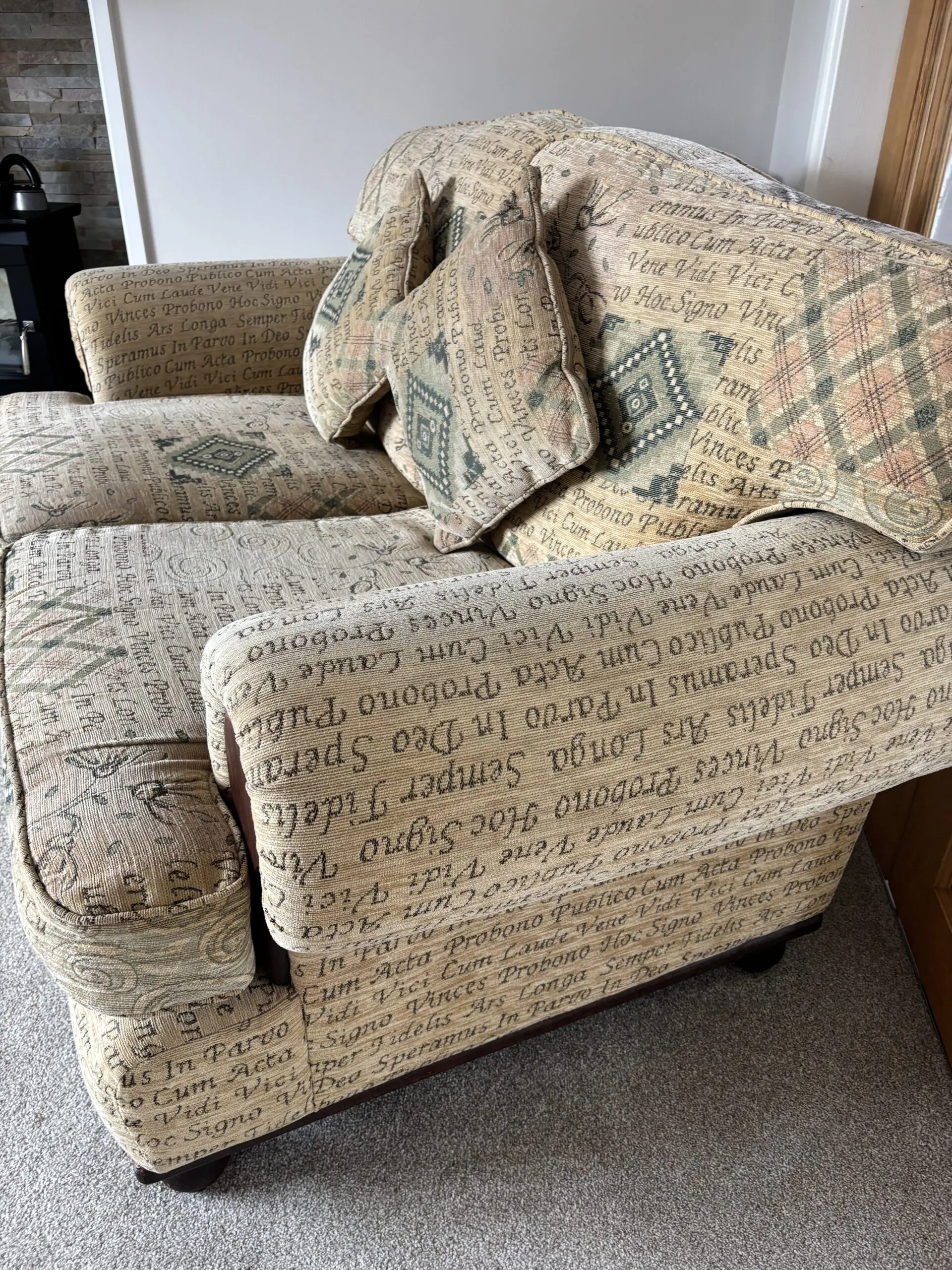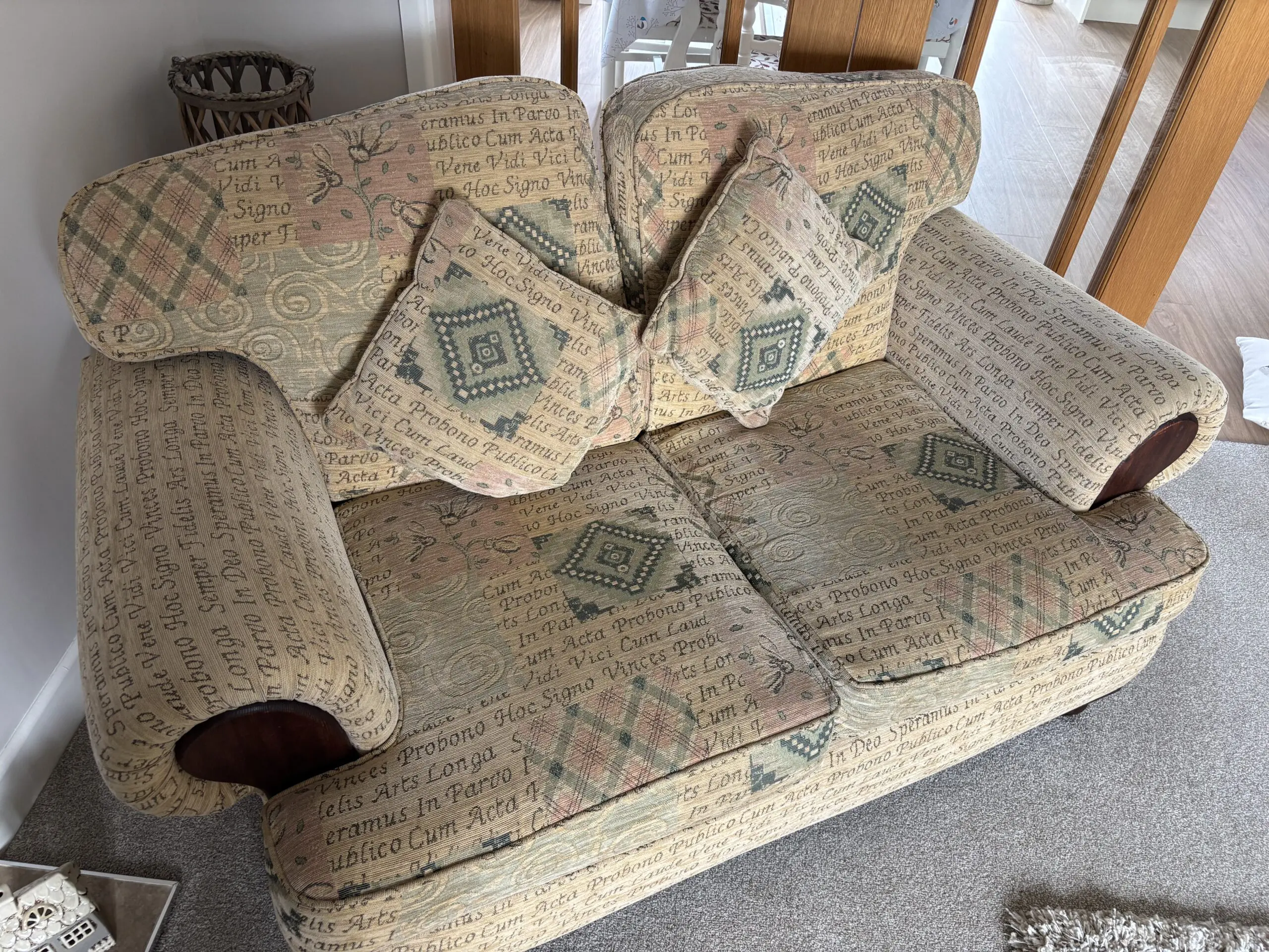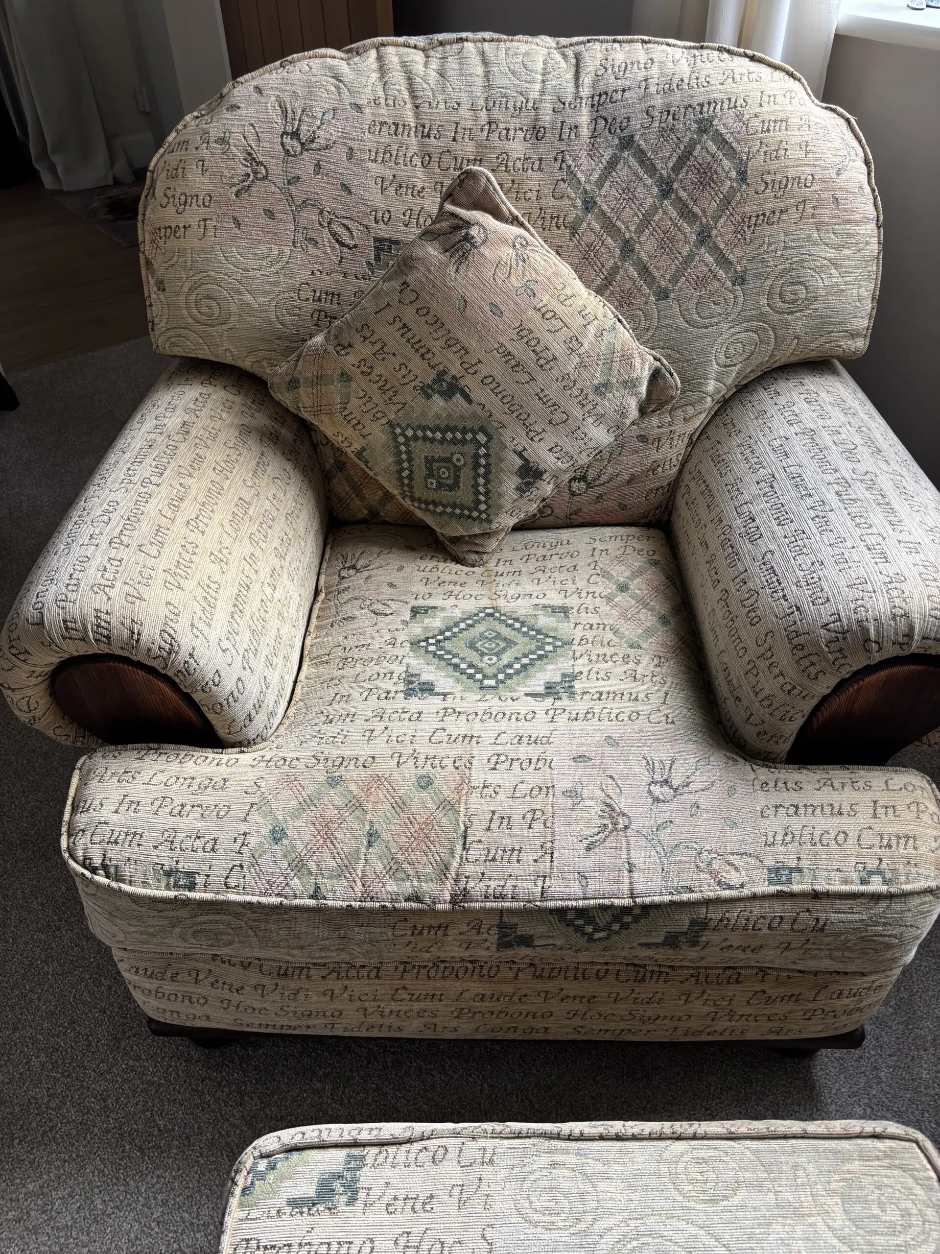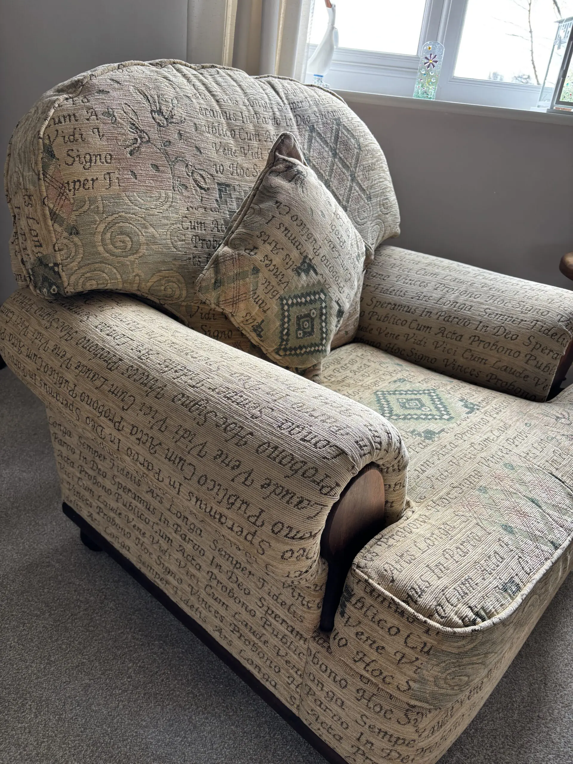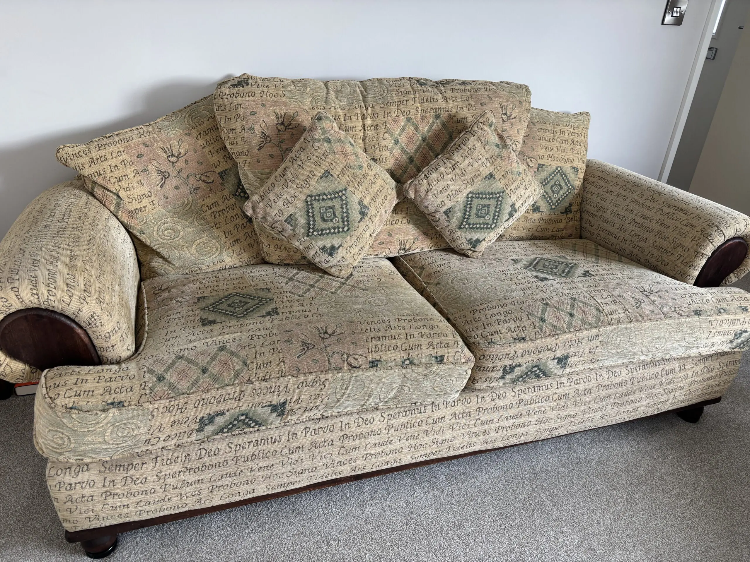 Lovely 4 piece suite in natural colours with wooden feet. Bought from Oldrids & Co.