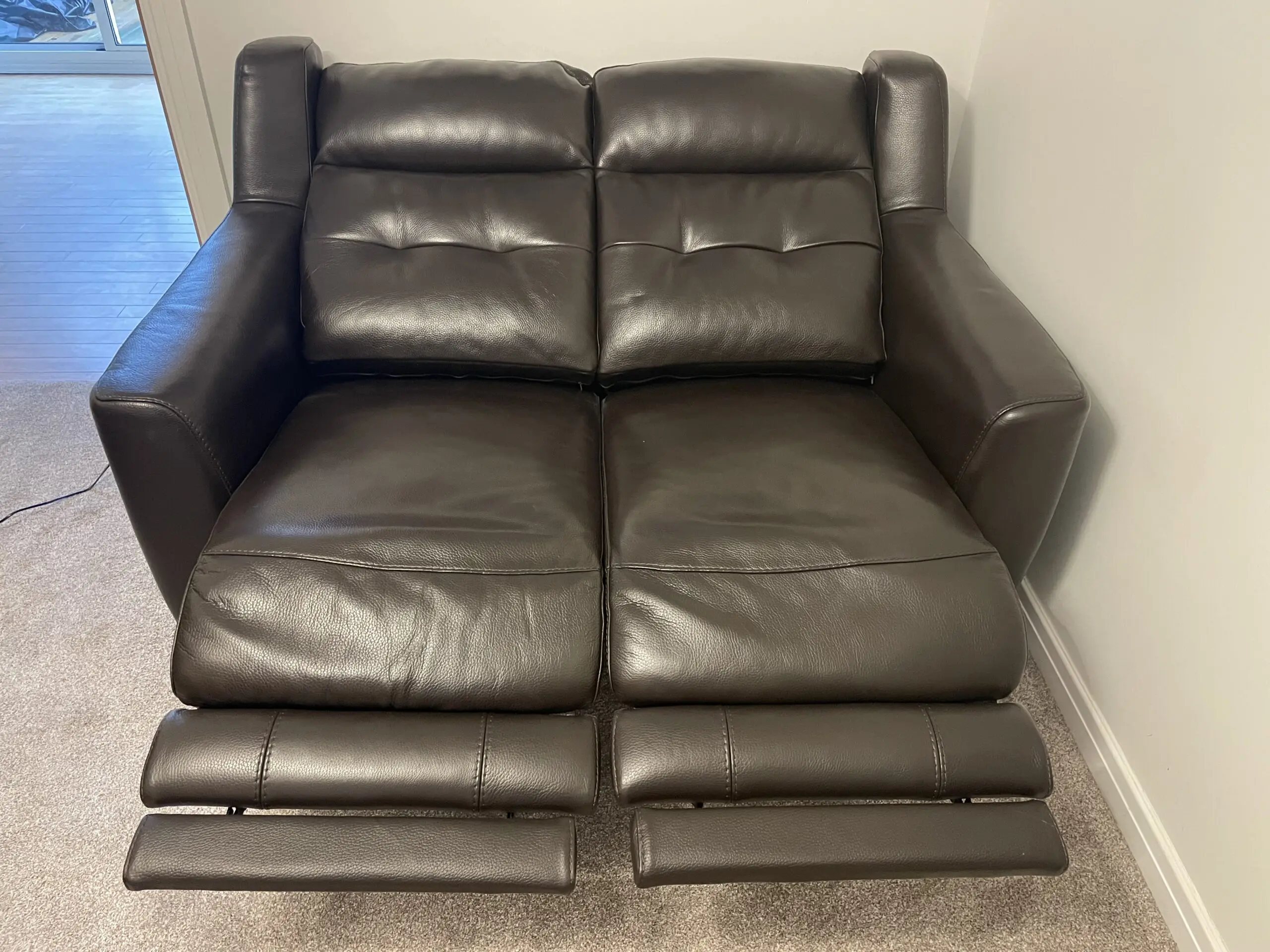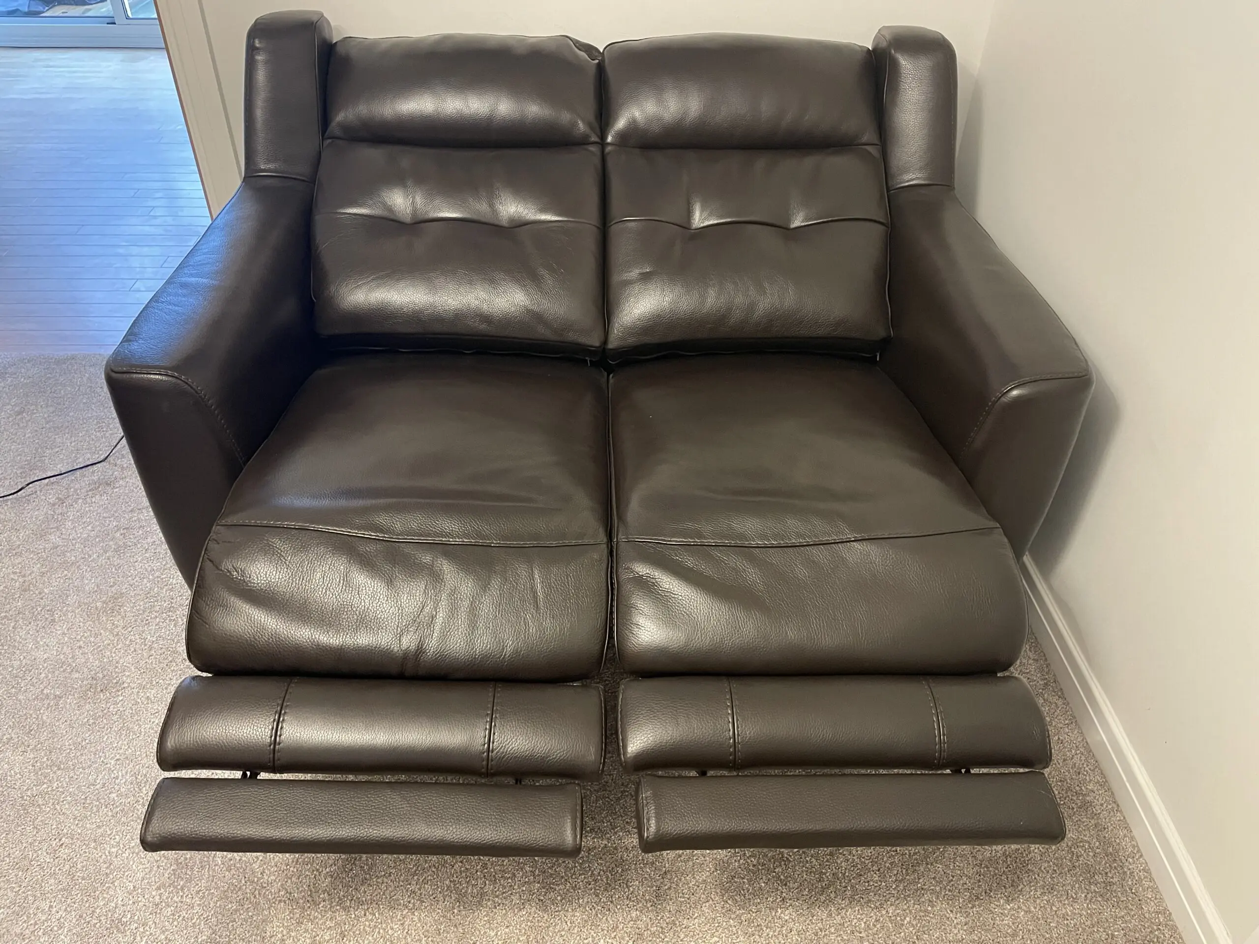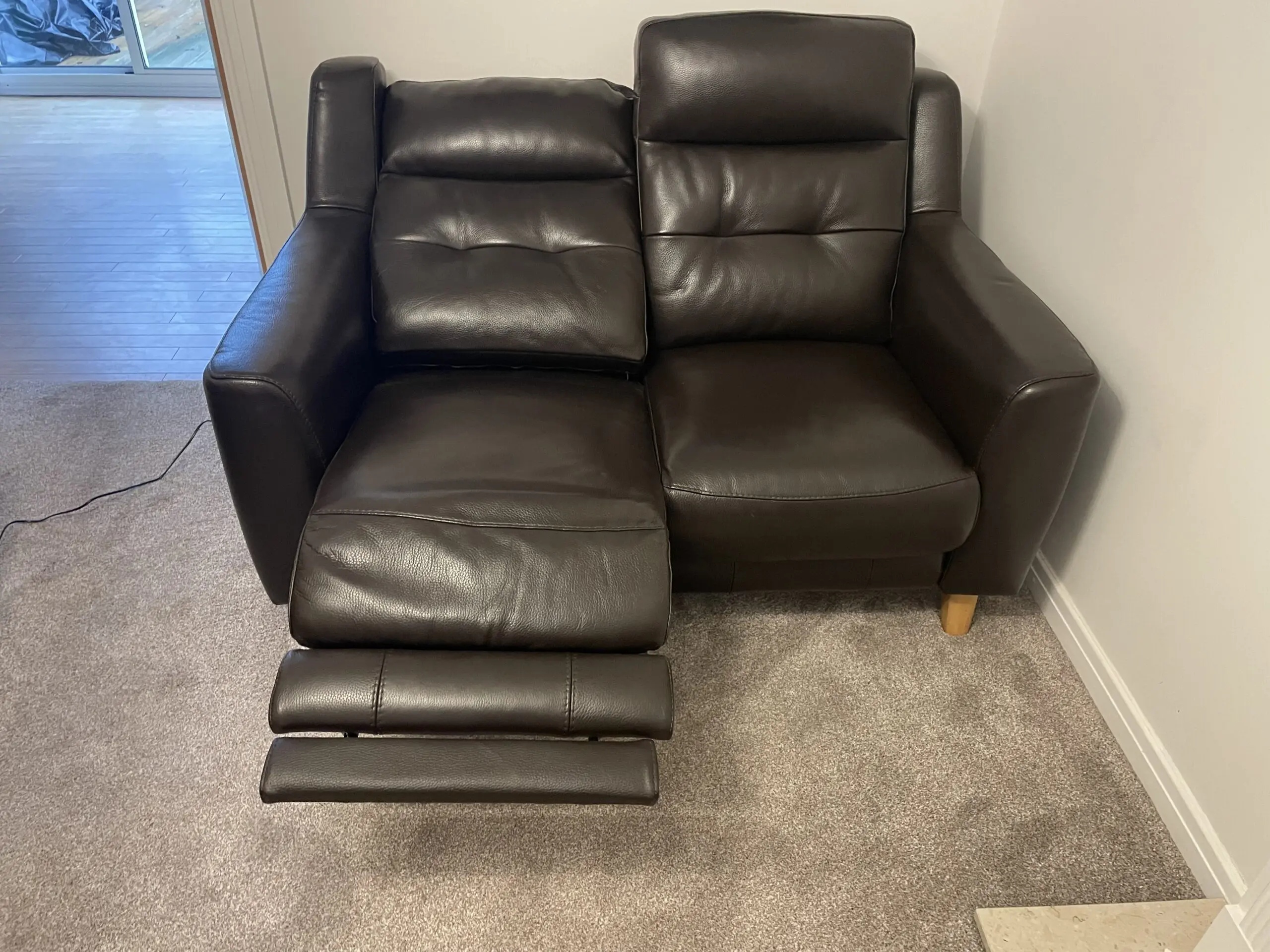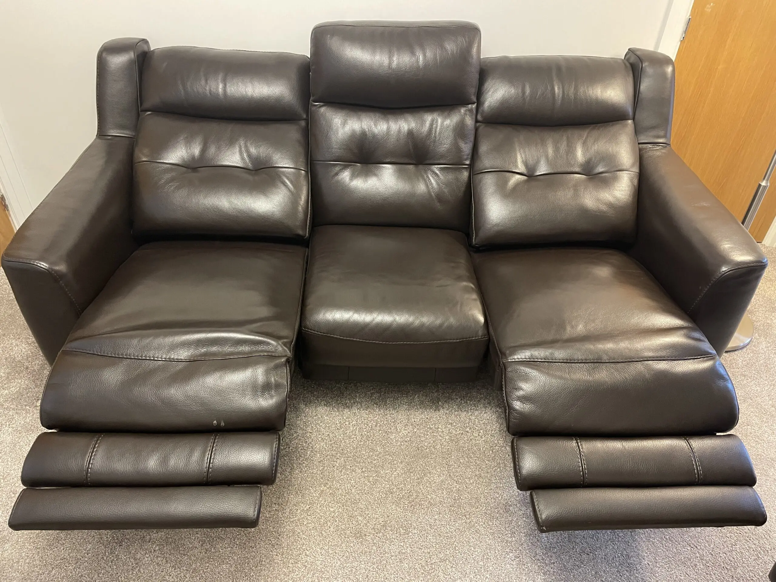 2 nearly new brown leather sofas bought from furniture village but hardly used. Have been out of the country working so they are excellent condition. Both have electric recliner buttons, usb ports and foot rests. Originally £3500 when bought.