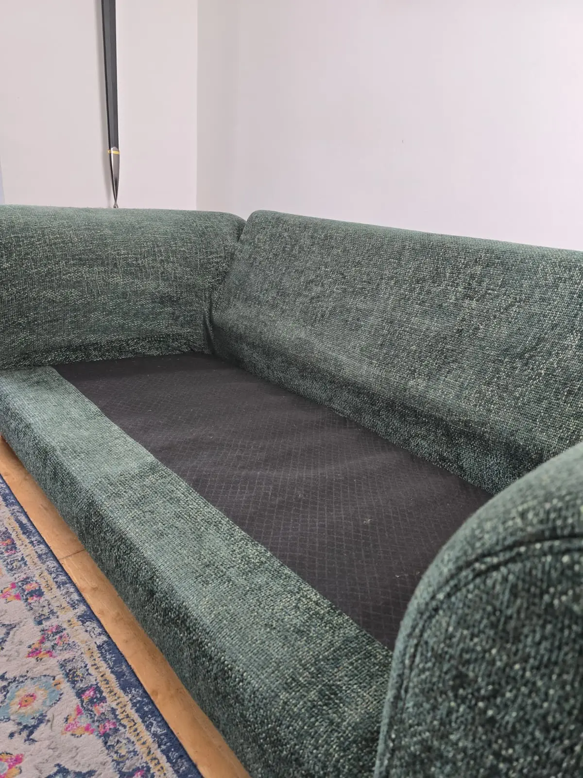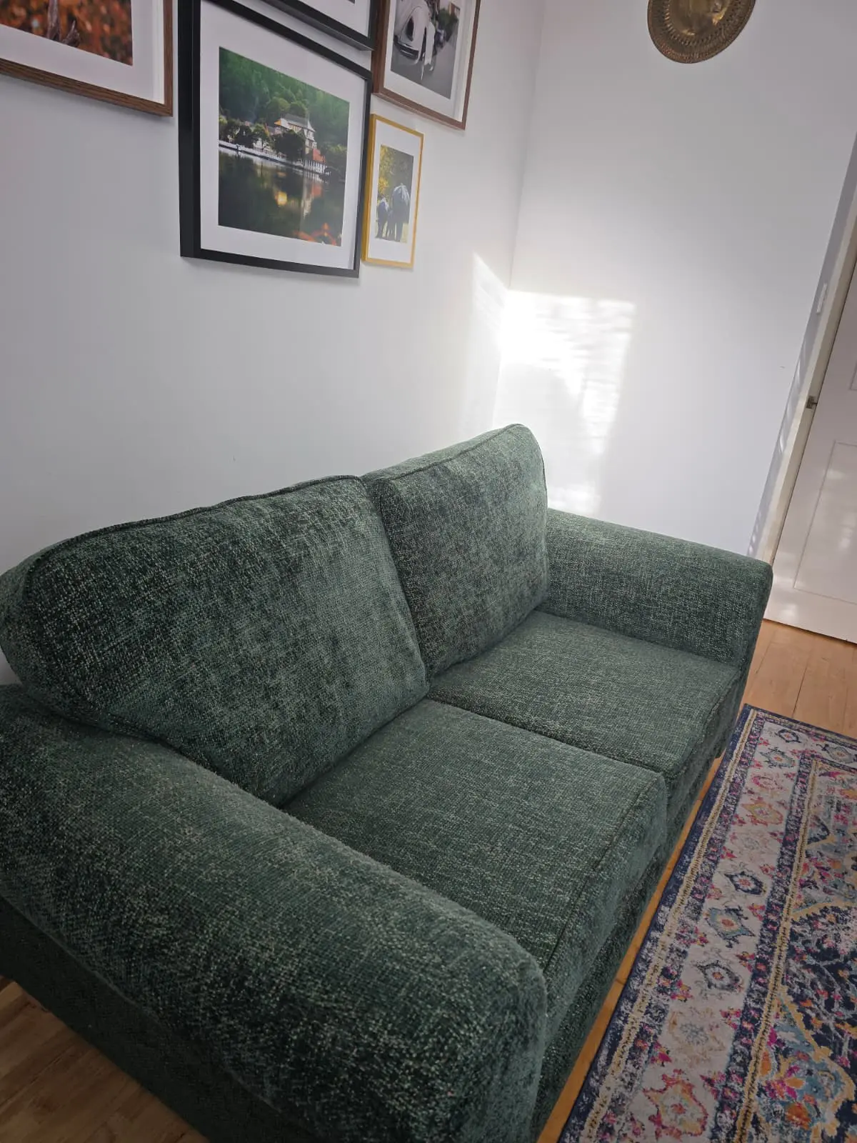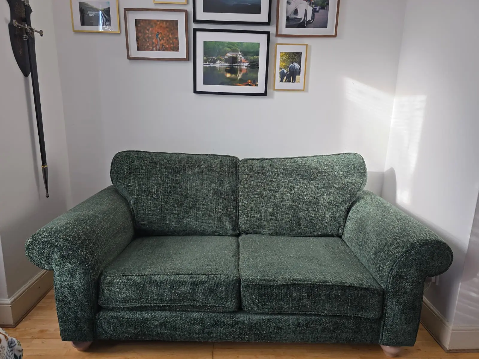 Sofa from the Abakus Direct Ingrid range, in very good condition and carefully used for approx: two years. Beautiful green colour that works well with most room settings. Comfortable and inviting, with a deep foam seat, fibre-filled back cushions, and two matching toss pillows. Upholstered in a soft braided chenille fabric, it’s both stylish and cosy. Ideal for everyday living without looking worn.