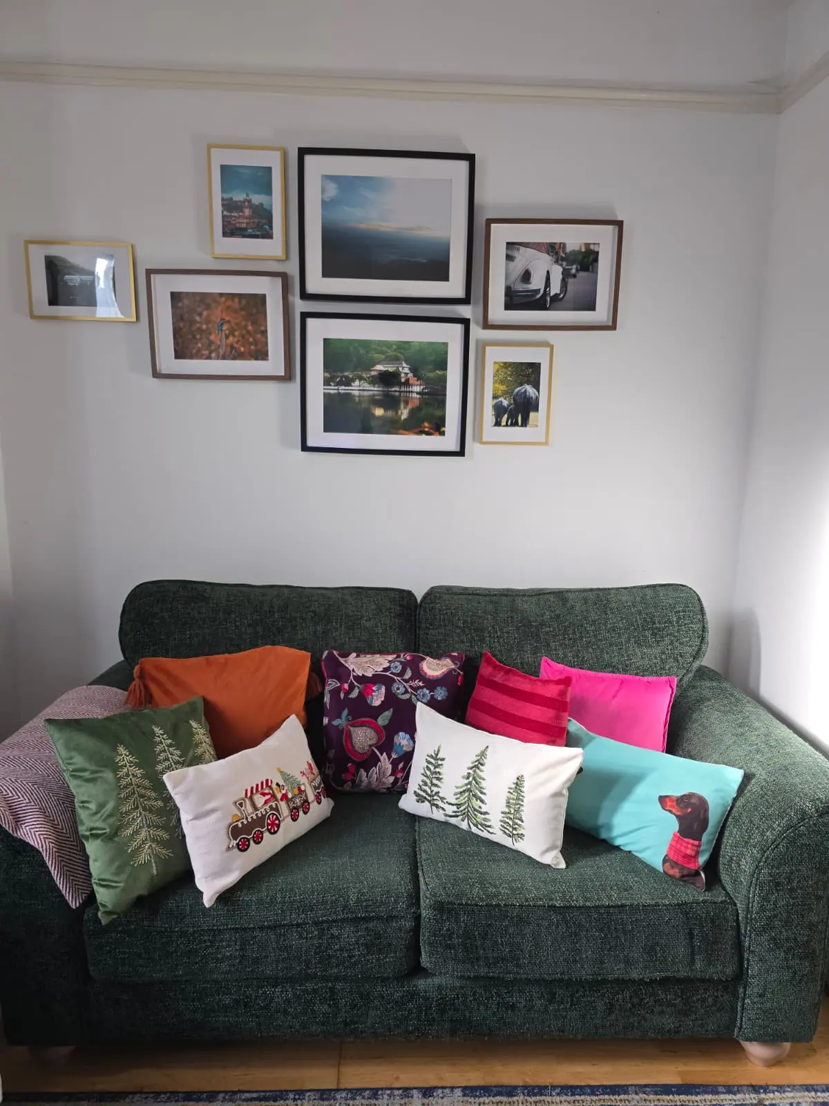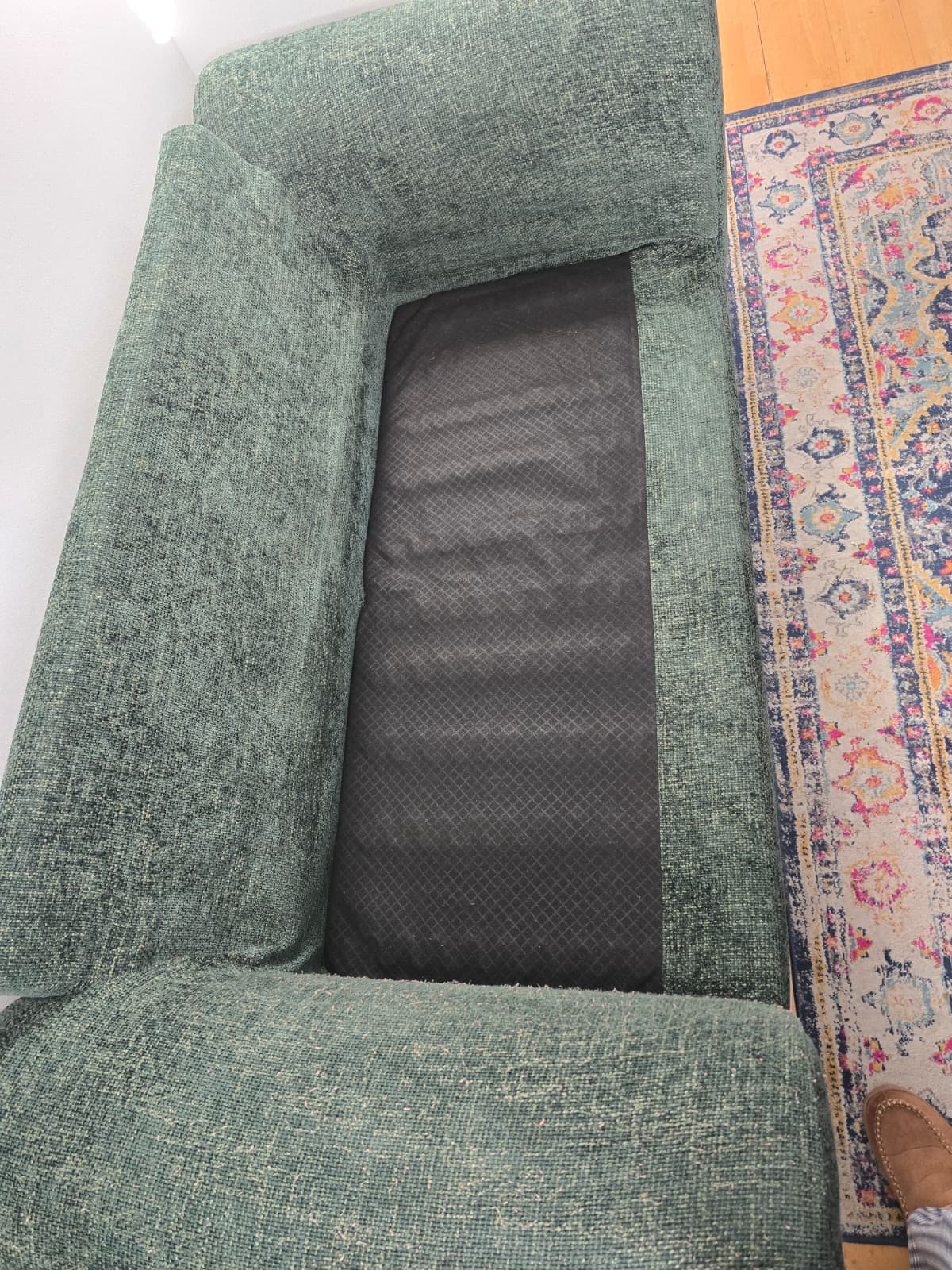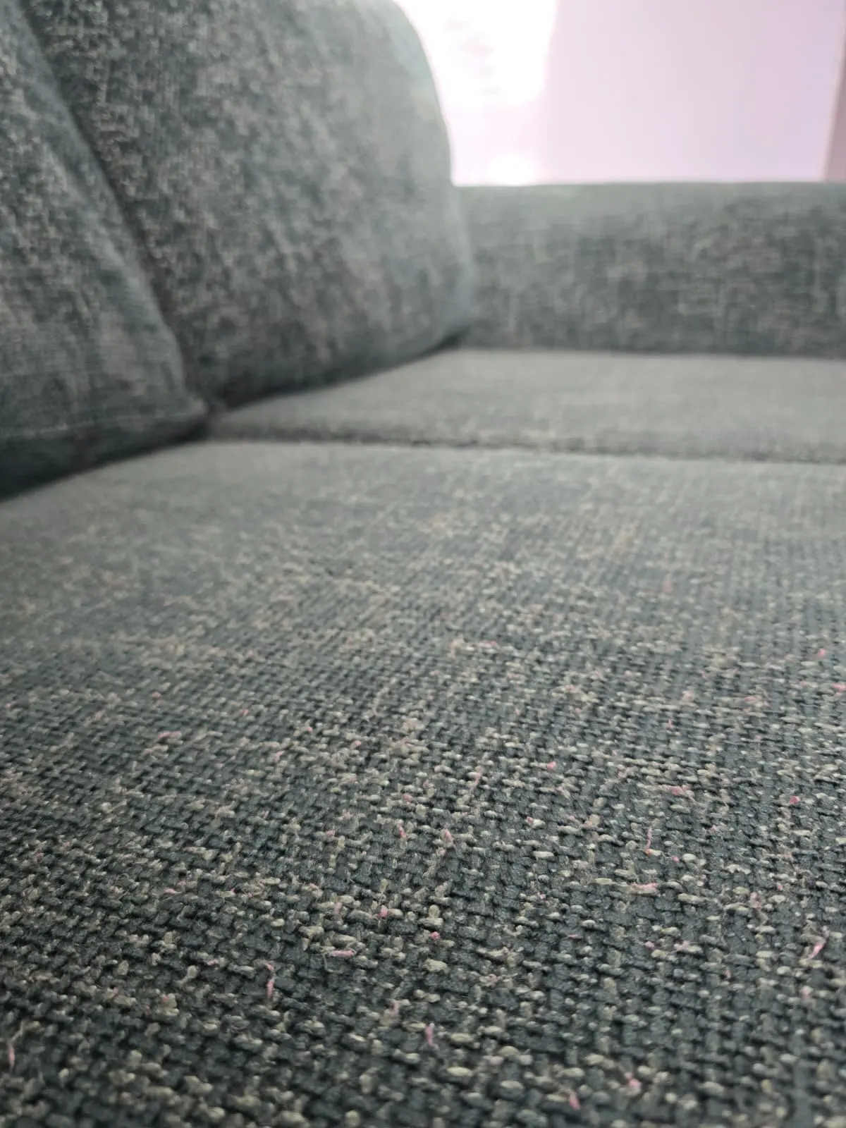 Sofa from the Abakus Direct Ingrid range, in very good condition and carefully used for approx: two years. Beautiful green colour that works well with most room settings. Comfortable and inviting, with a deep foam seat, fibre-filled back cushions, and two matching toss pillows. Upholstered in a soft braided chenille fabric, it’s both stylish and cosy. Ideal for everyday living without looking worn.