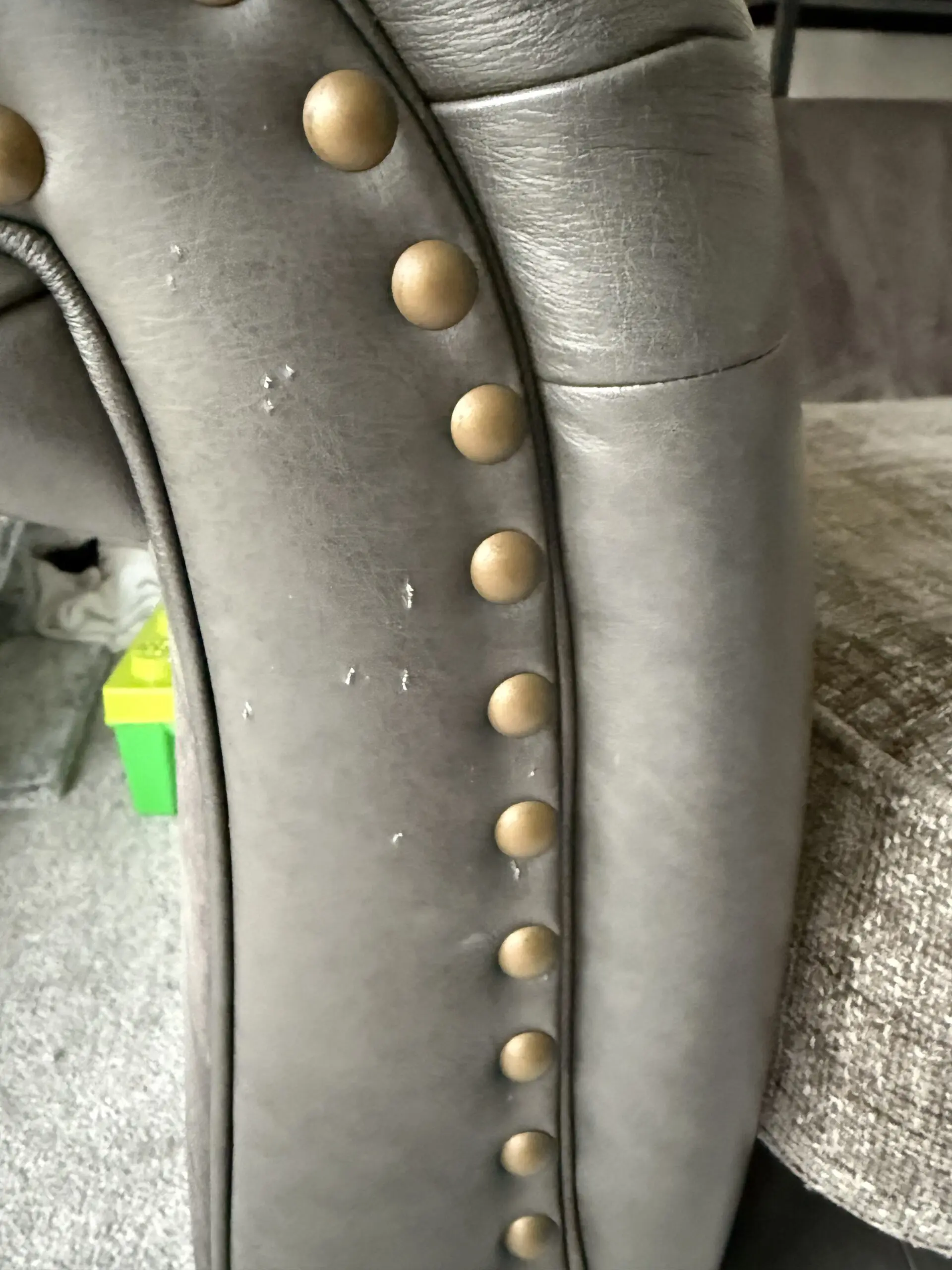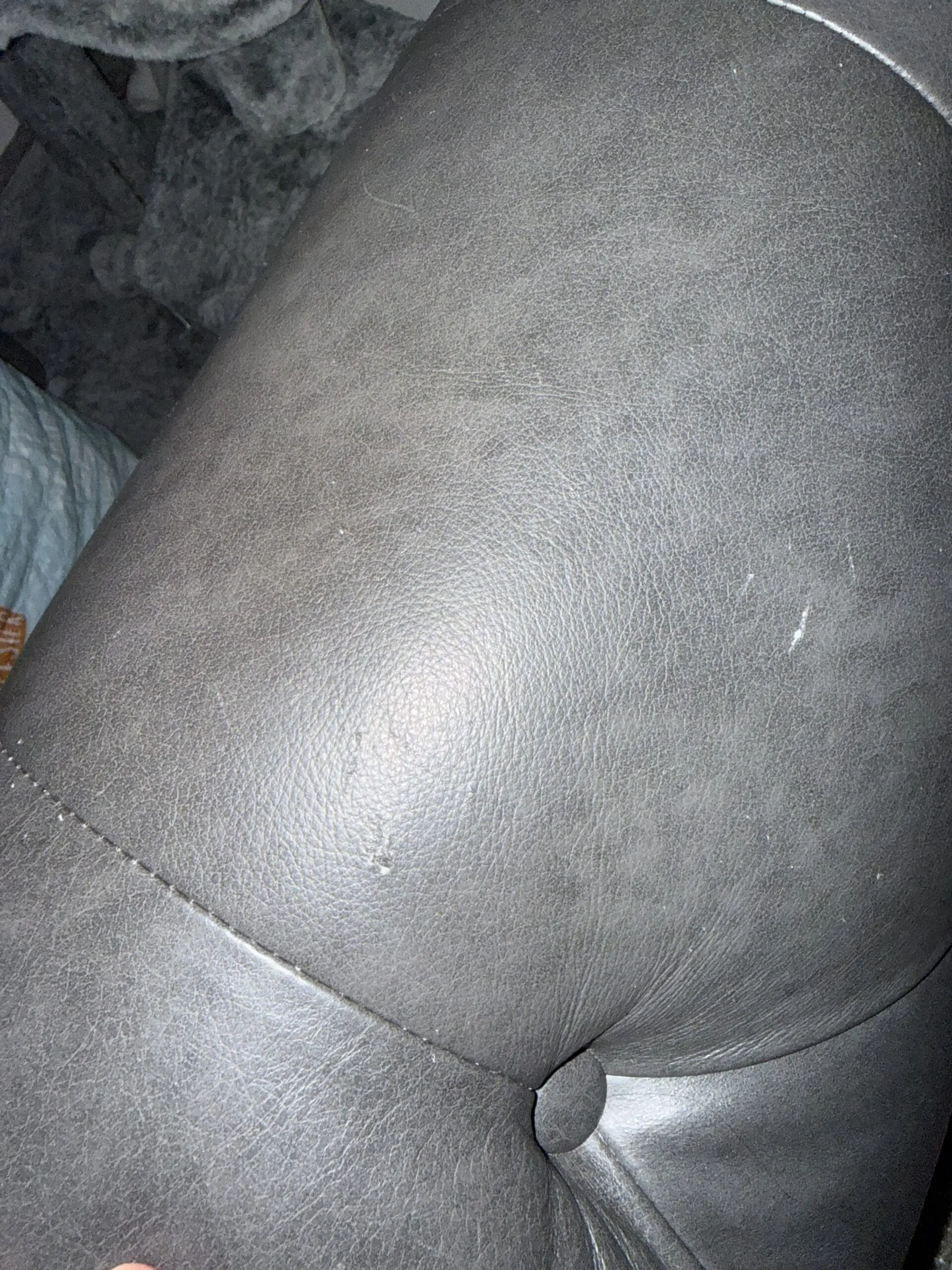 Used for one year. Has had two small scratches on right arm and one on the front of the arm. Shown in pictures. Not notable and could be filled with a leather treatment. No stains or marks. Smoke free home. Was used in a home with cats but was covered with a blanket and has been steam cleaned and fabric washed down.