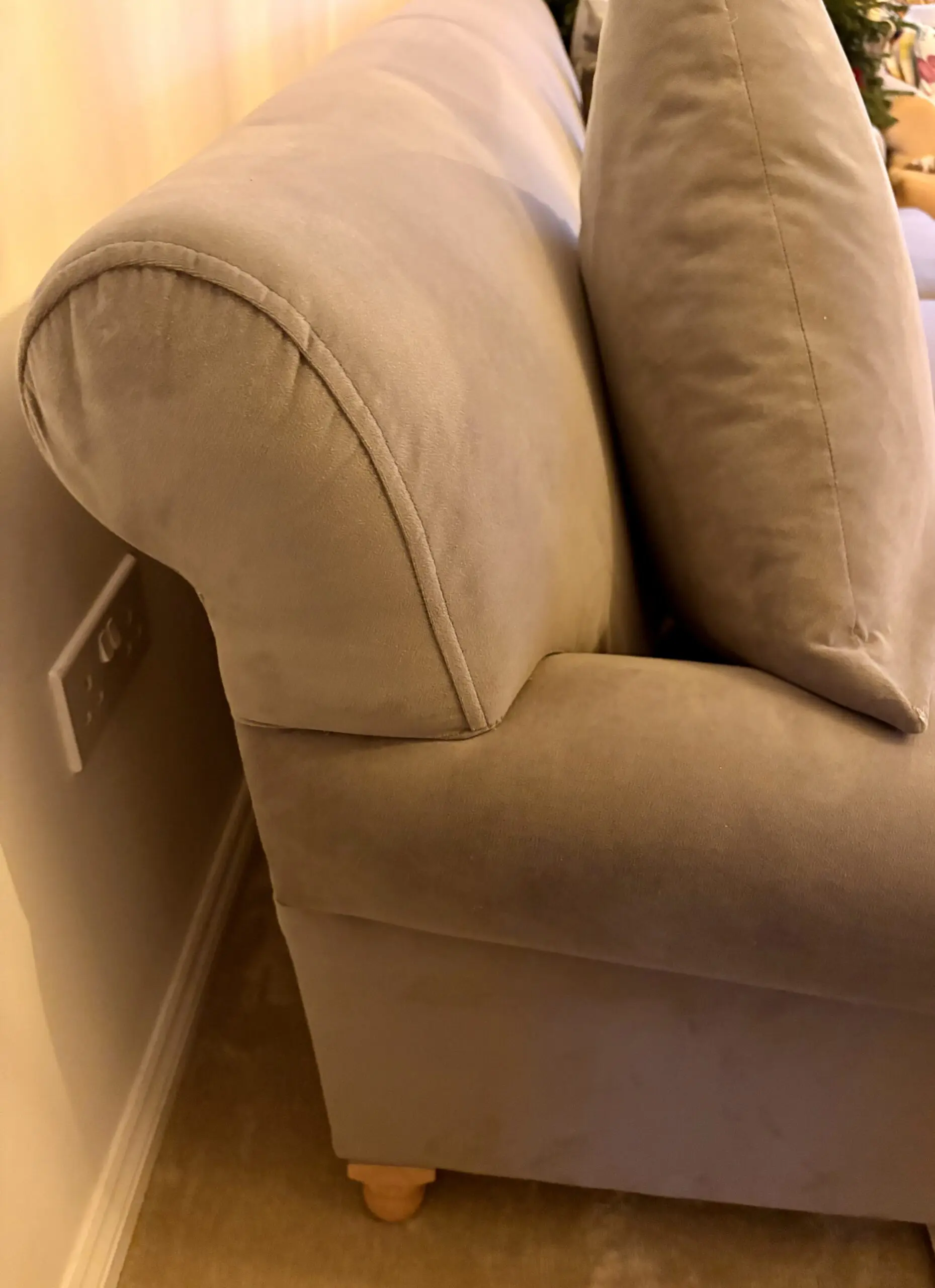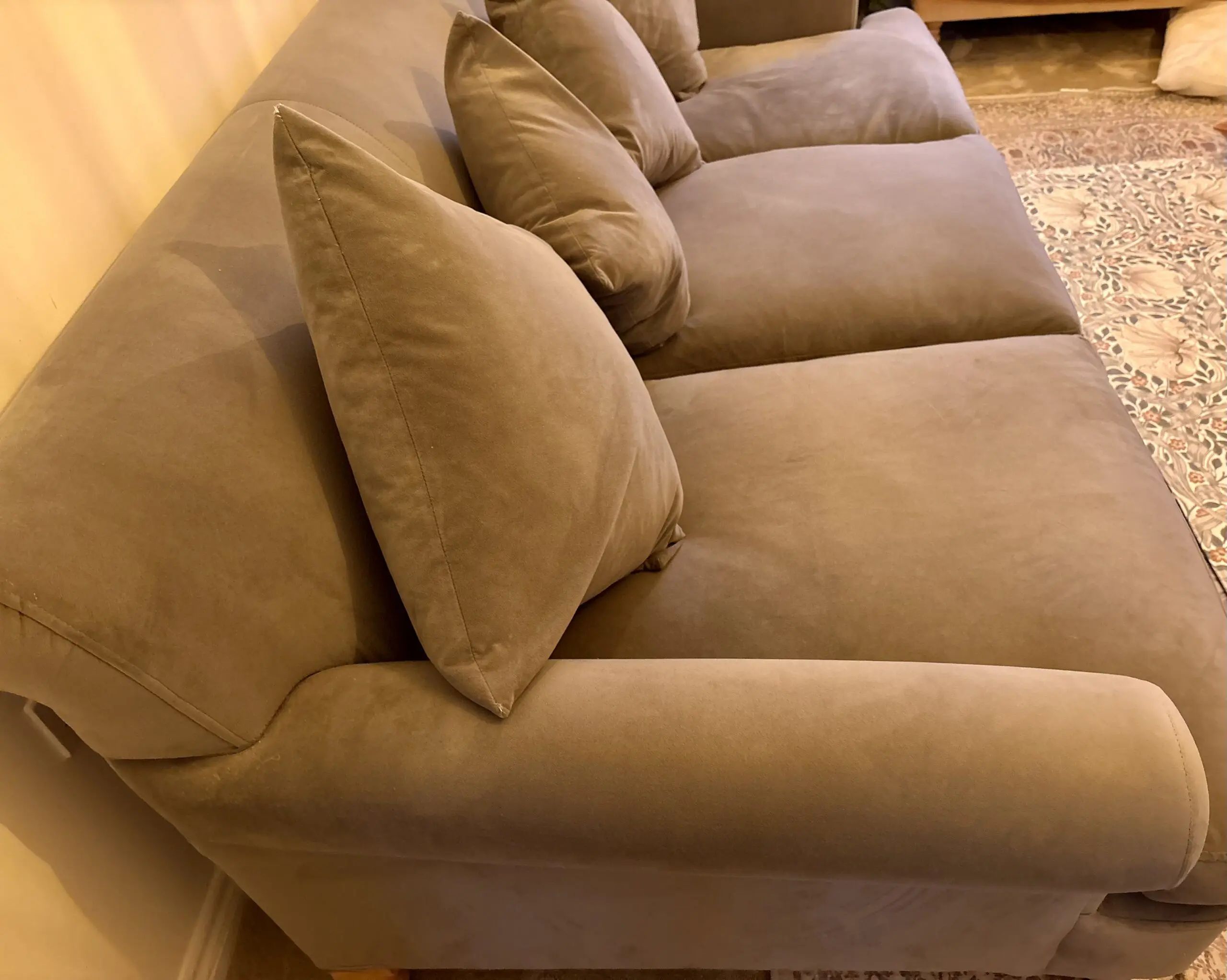Beautiful grey velvet Arlo & Jacob Cartwright sofa. Includes 4 matching scatter cushions. Has additional stain guard on the fabric. Very comfy, deep-seated sofa. Only selling due to a change in decor. Will accept offers.