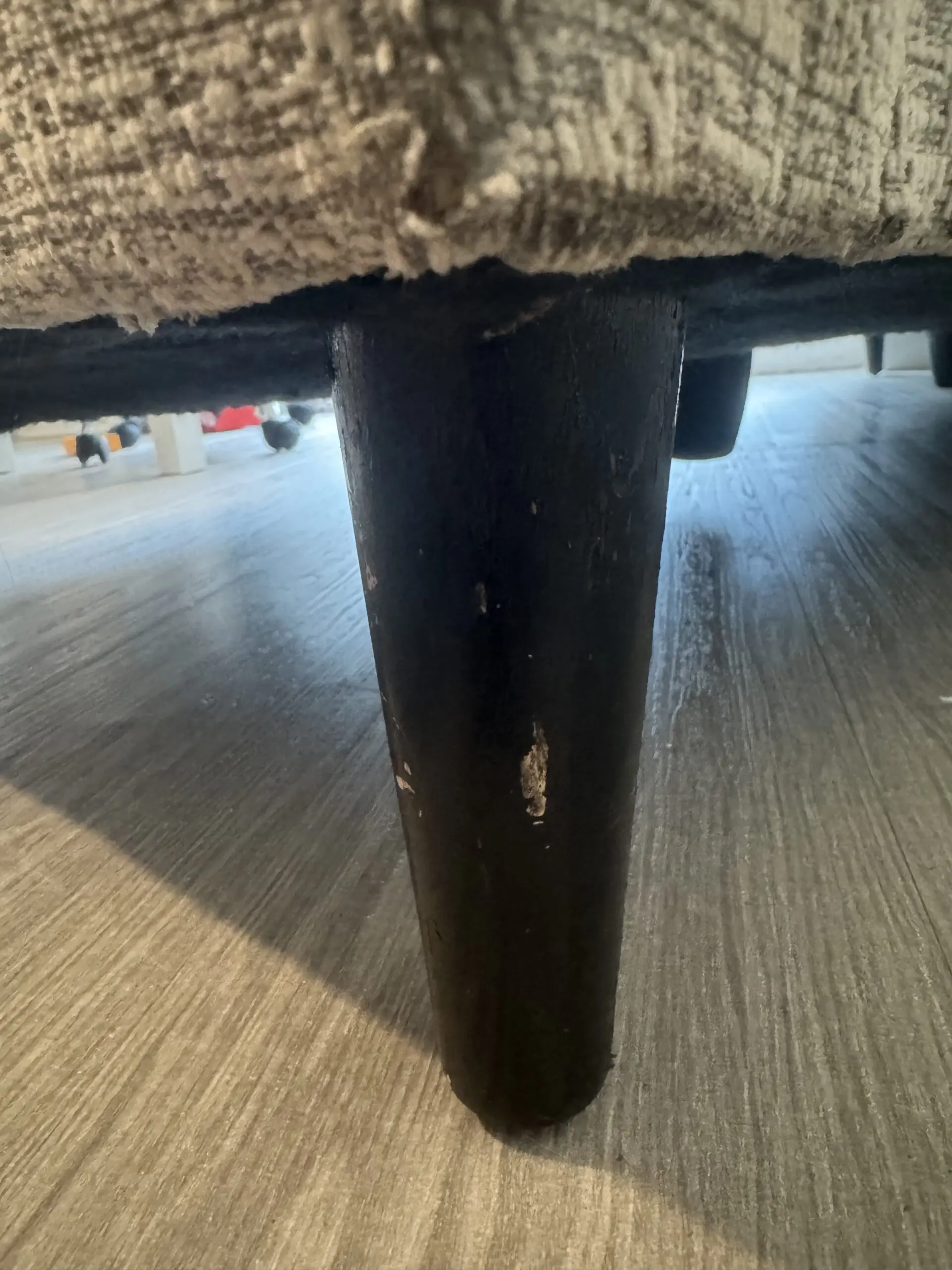 • the legs are very slightly scratched, and aren’t the original legs either, and the middle leg is shorter (not matching) so it doesn’t touch ground, but isn’t a stability issue. You can buy 6 replacement legs online, just match the screw-size – we just never got around to it