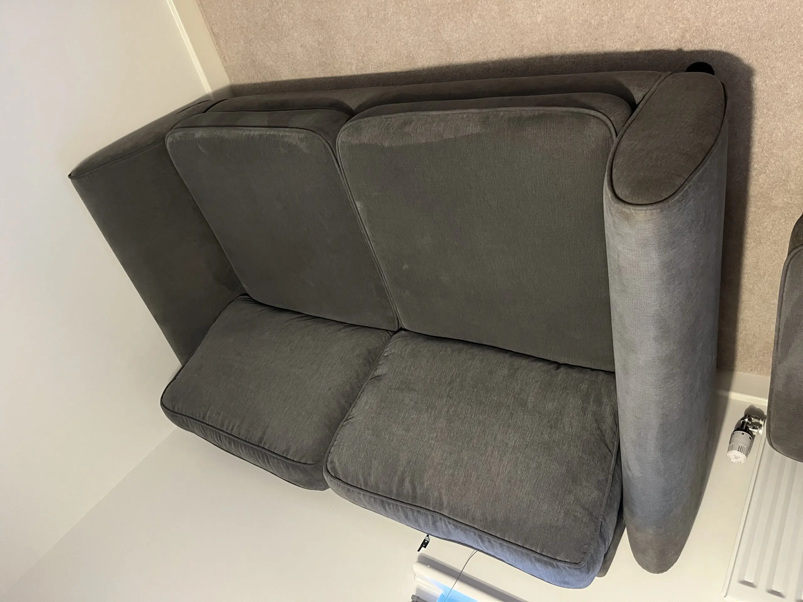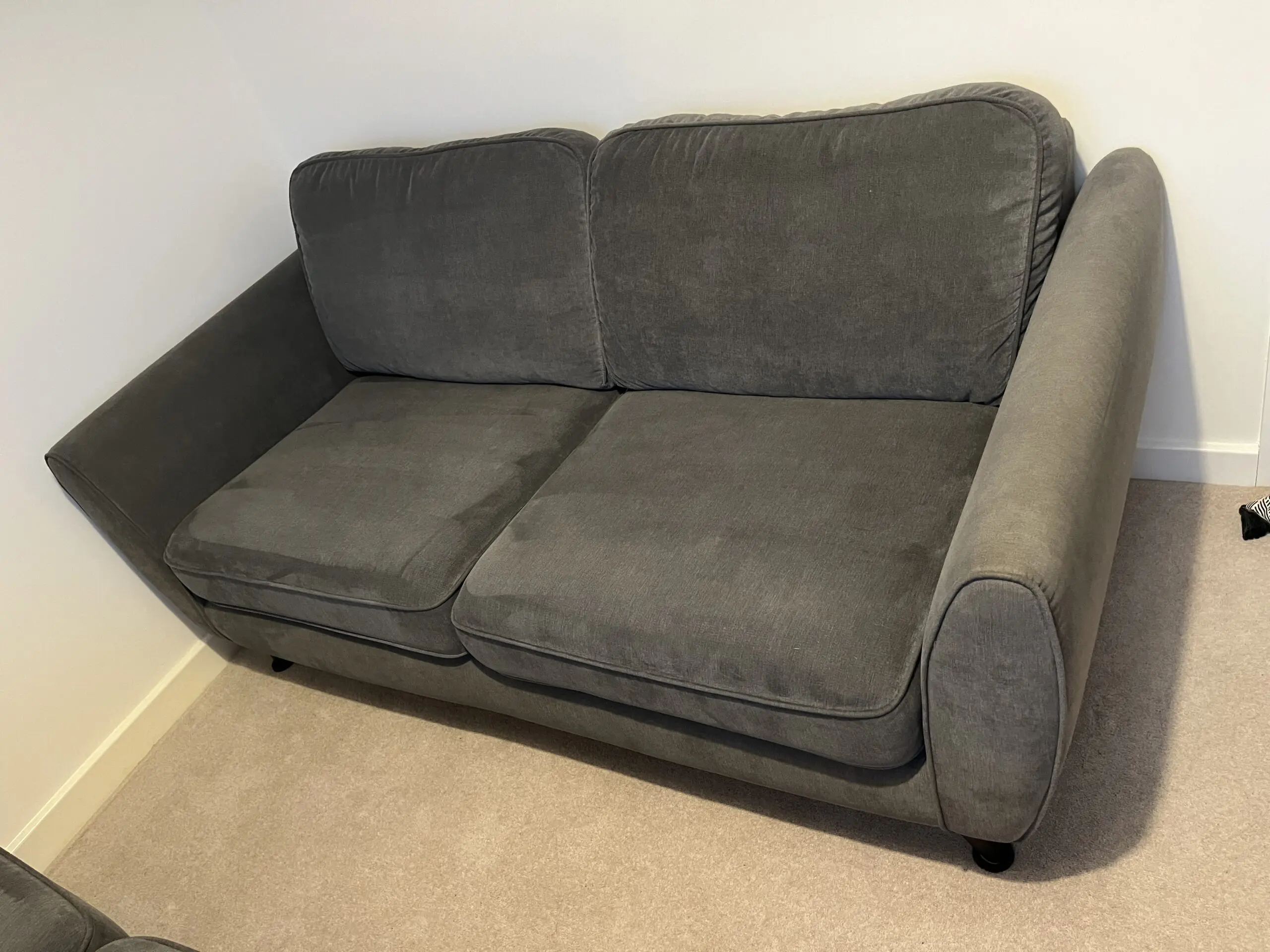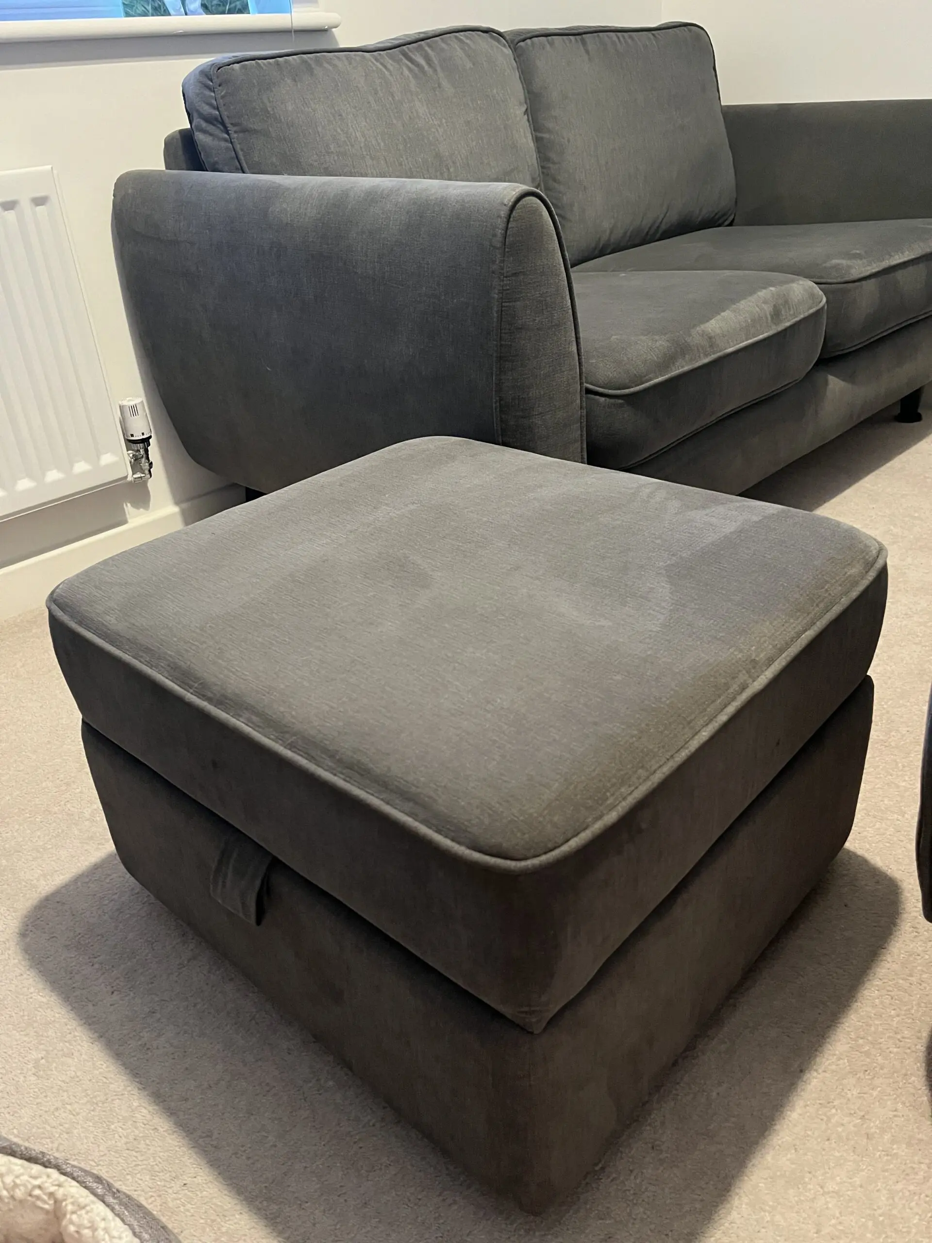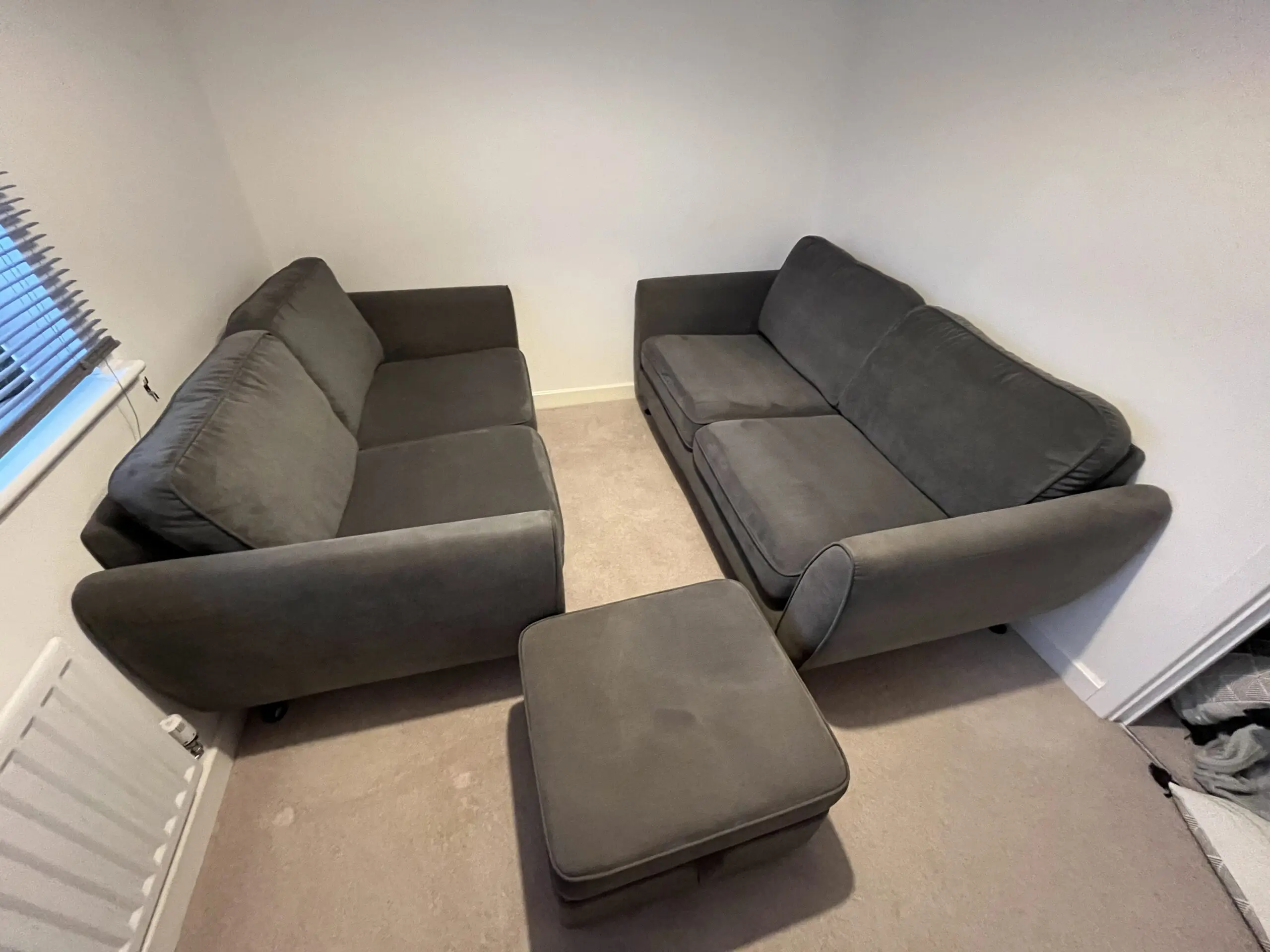 One 2 seater sofa. One 3 seater sofa. One footstool with storage. Dark grey colour. Suede material. Black wooden legs. Very well looked after.
