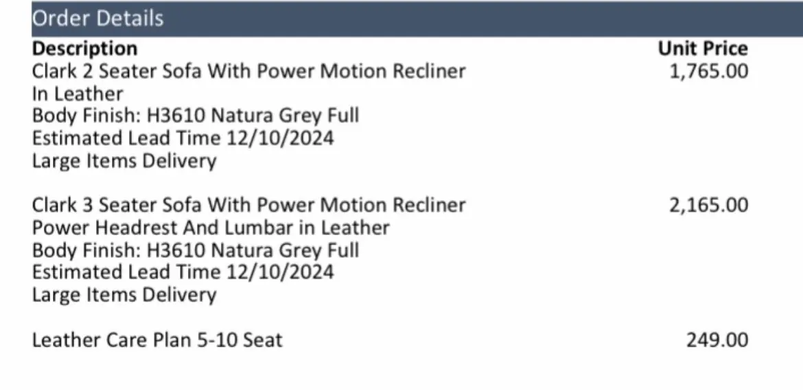 From start to finish this company was amazing. We were unsure about choosing online without trying first so took a chance. We are thrilled with our choice . Delivery was great was in touch with sofalistic all the way. They were fabulous thank you
