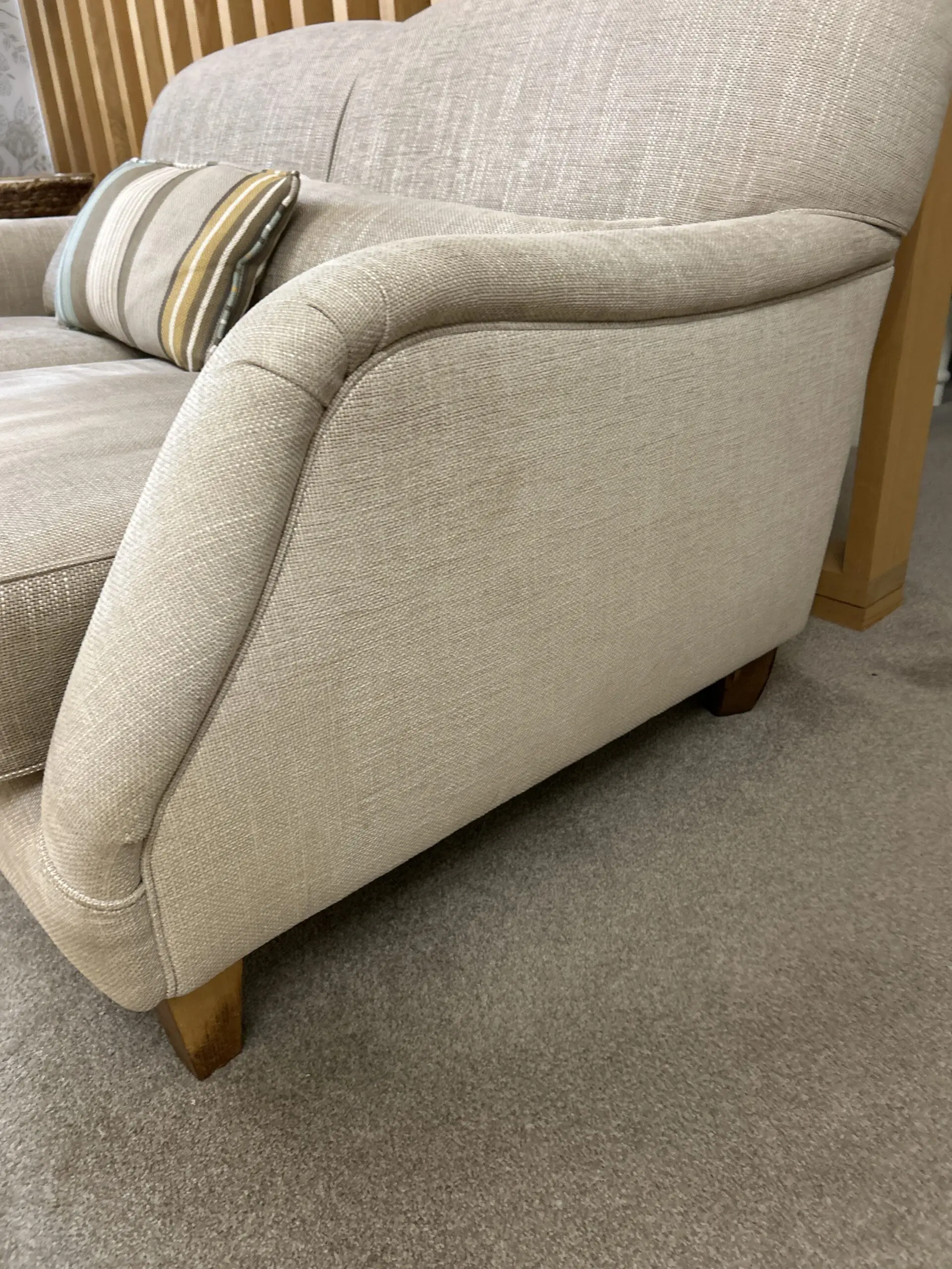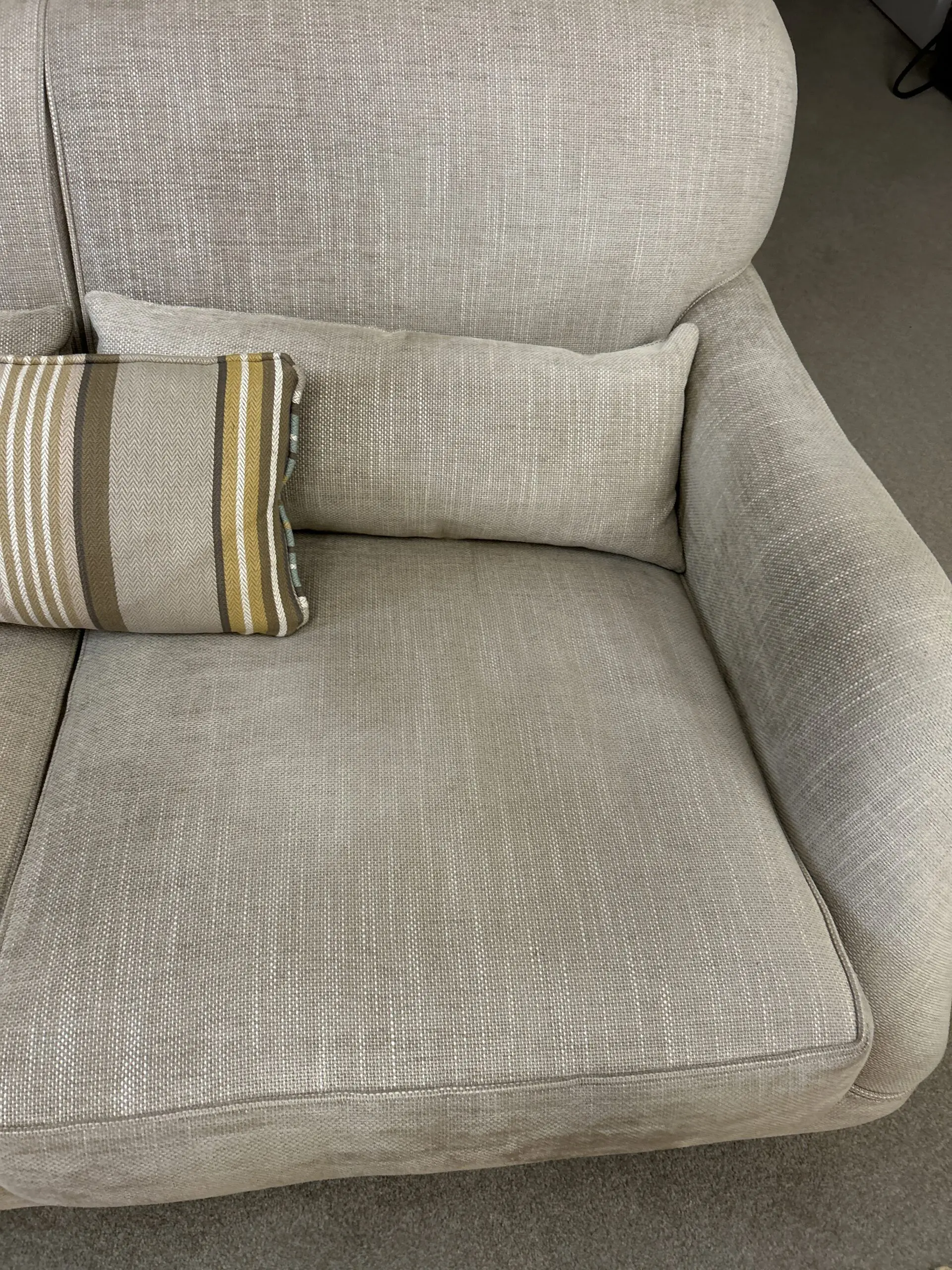 Manufactured less than a year ago to order in a beautiful tweed fabric for durability and easy cleaning. House move forces sale. Extremely comfortable. Luxury item made to last.