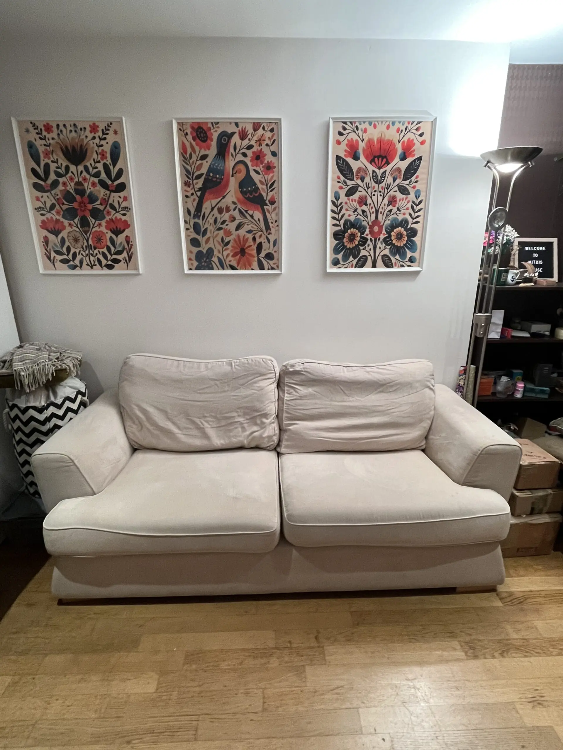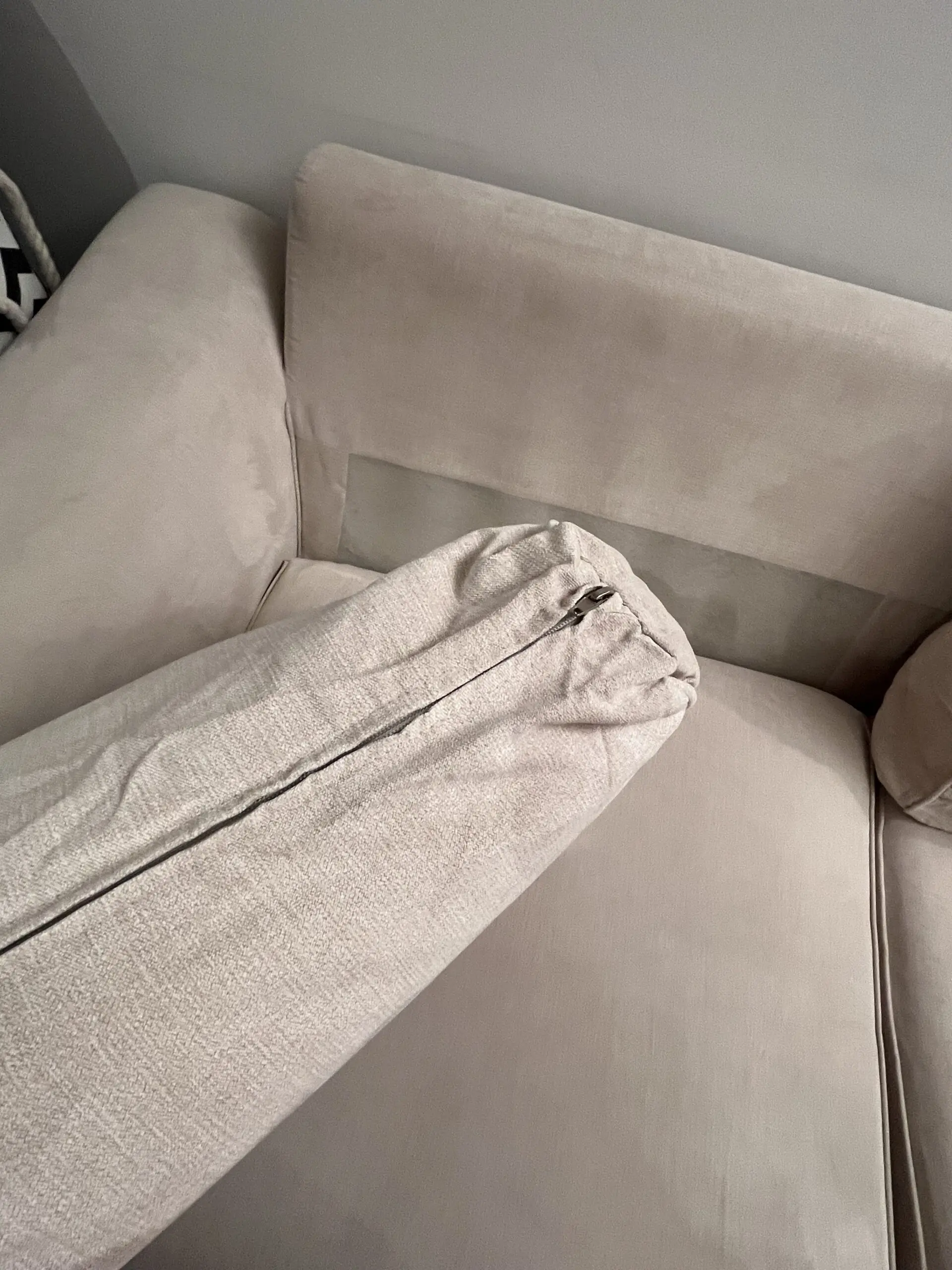 Super comfy sofa. 3 seats. Can be washed in the washing machine. Cushions have zippers and the body cover has velcro underneath.