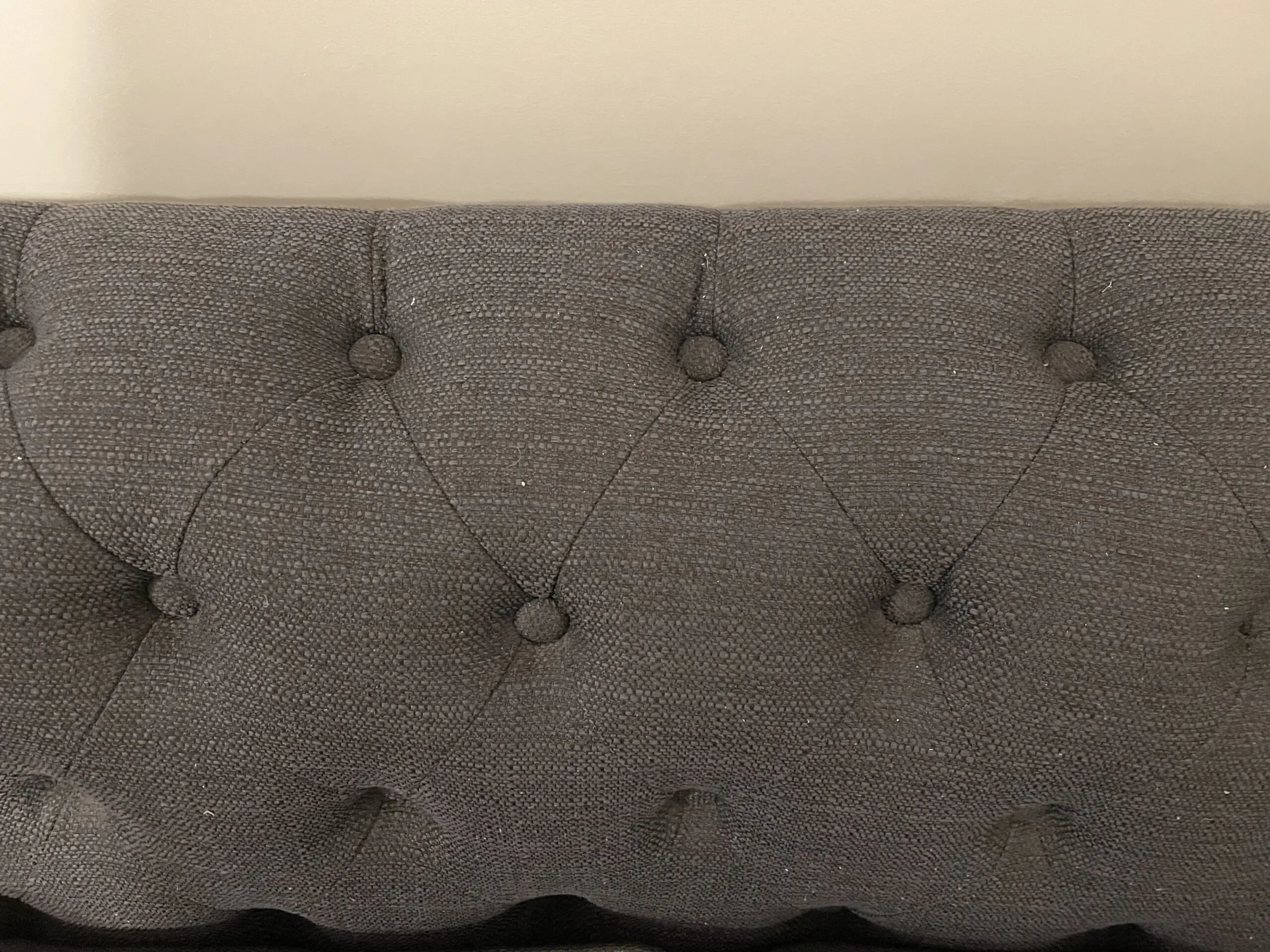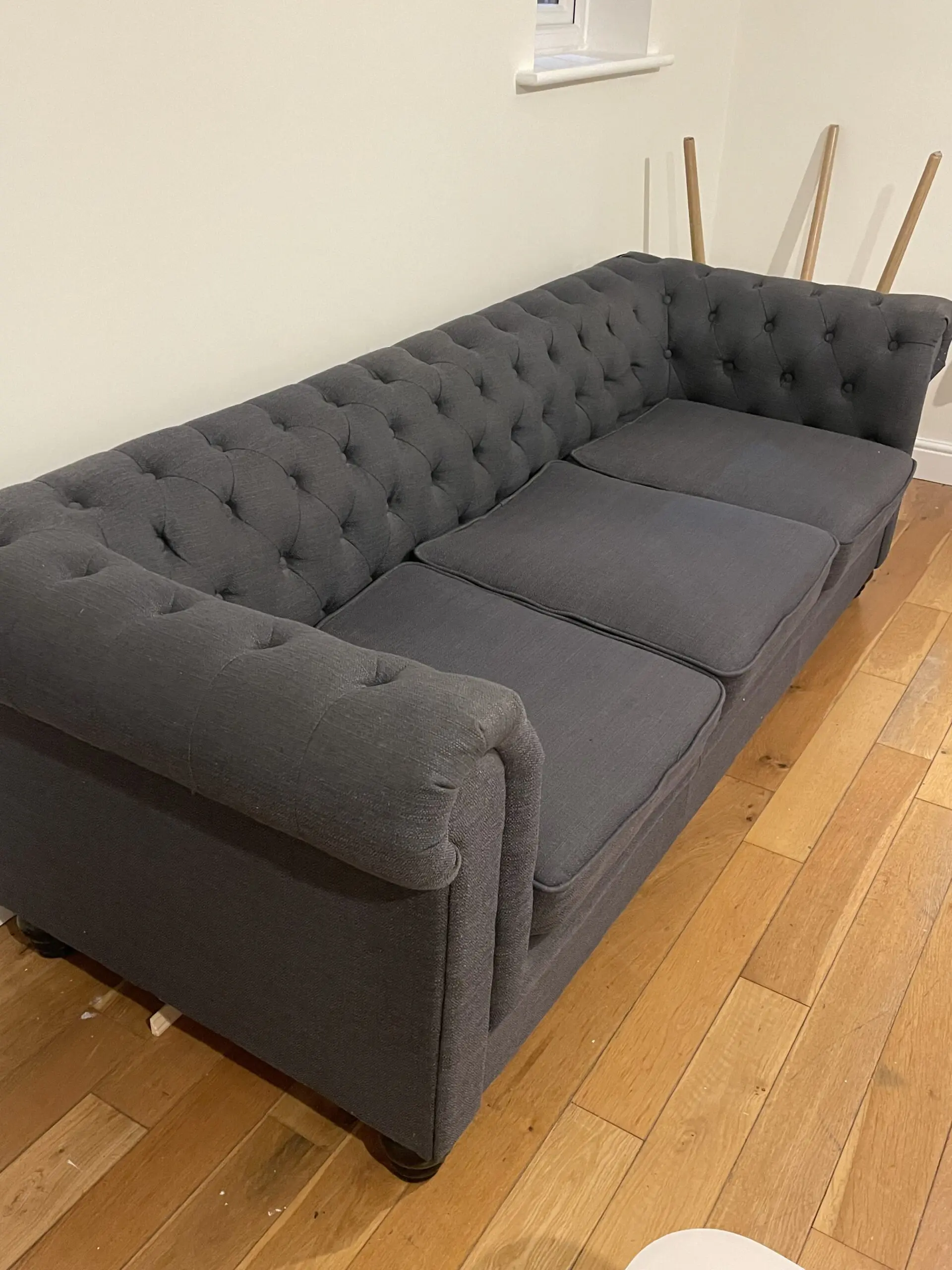 This stylish 3-seater sofa combines classic Chesterfield design elements with modern comfort, featuring an eye-catching button-tufted back and rolled arms. The generous seating provides comfortable space for three people, making it perfect for family living rooms or entertaining guests. The traditional styling with contemporary proportions means it works well in both period and modern homes. Built on sturdy wooden legs with a solid frame, this sofa offers both style and durability for everyday use.