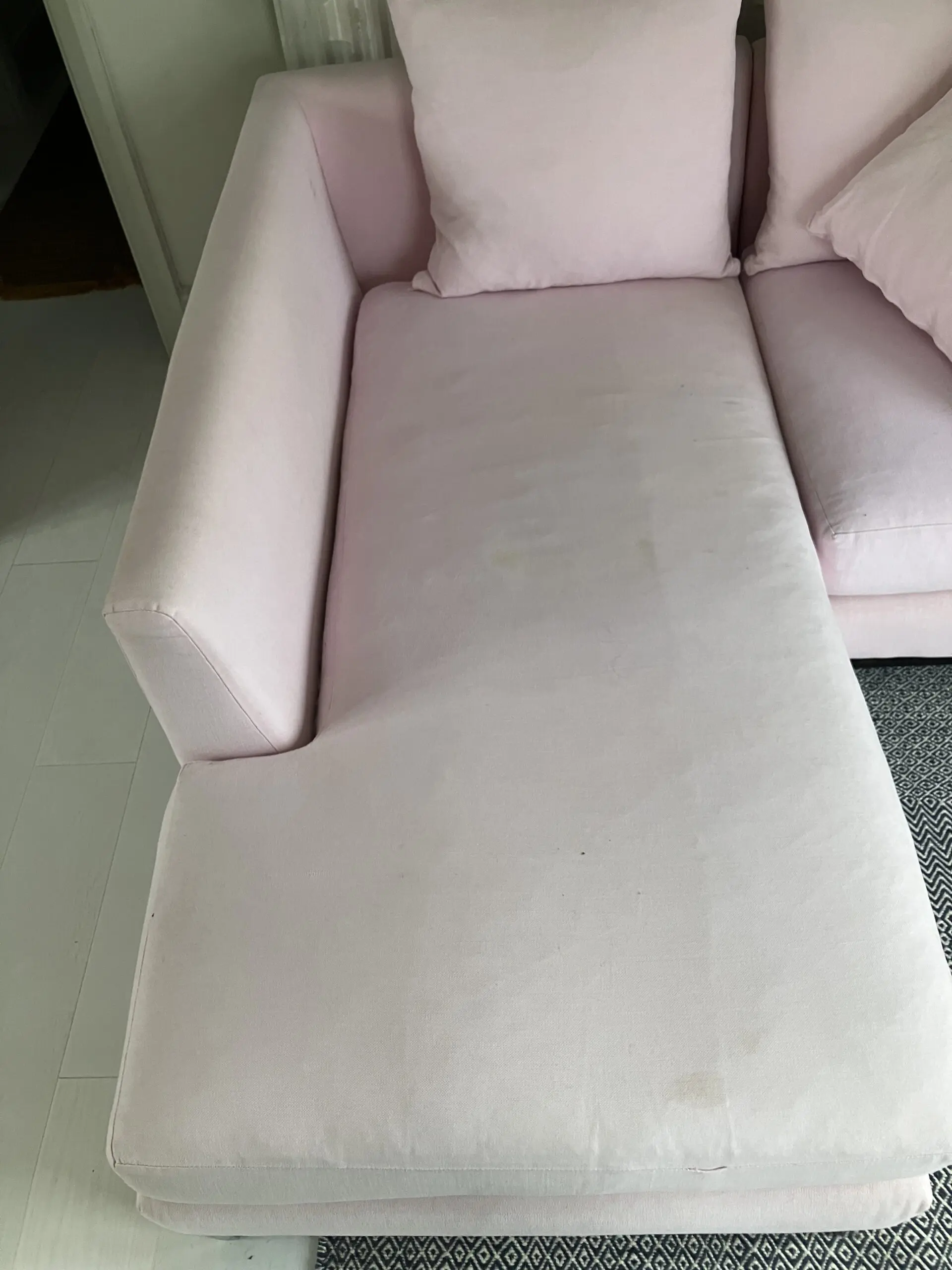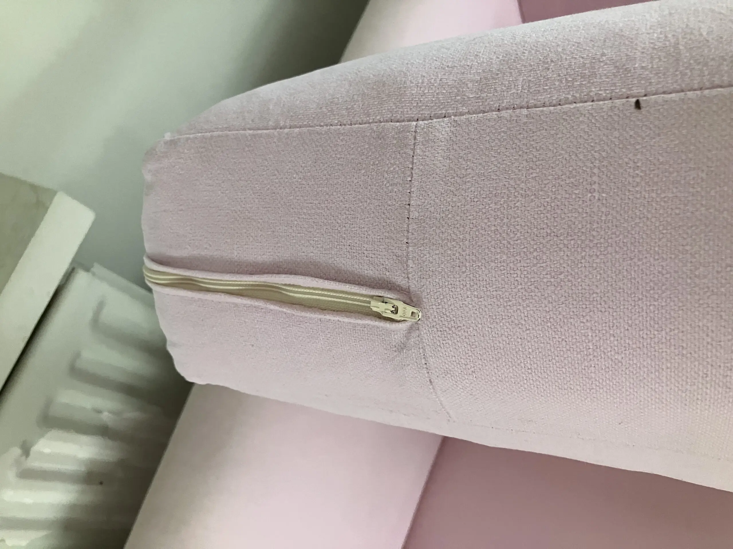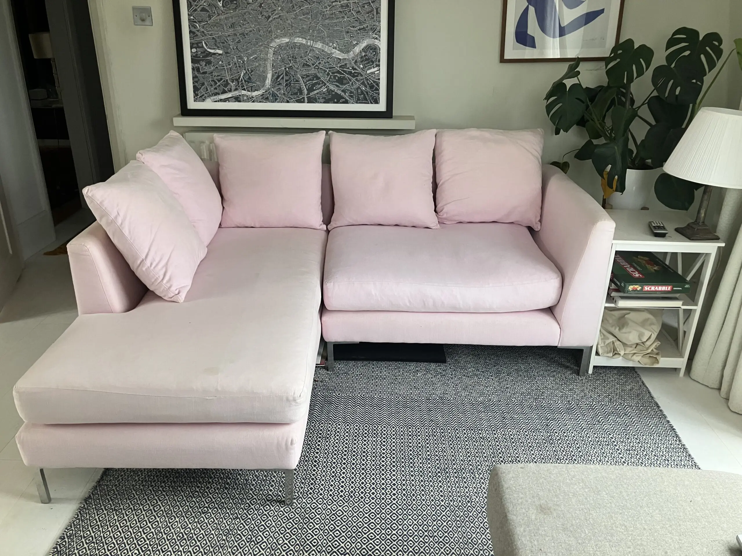 Bespoke three seater upholstered in 100% cotton pink linen (premium Roma fabric). It’s upholstered, with loose cushions. The back cushions (5 x 50cm square) are a mix of 2 x feathers and 3 x foam and the seat cushions (one is 95cm x 70cm and the chaise seat cushion is 143cm x 65cm, and the end of it is 83cm wide and both are 12cm deep) are feathers. The sofa is 190cm long, 70cm high and the chaise measures 116cm. It was hand sewn and is fantastically comfortable and stylish. There is gentle wear, no tears. The feet are chrome. The seat and the chaise are separate not one long piece. I’m throwing in two green velvet cushions!