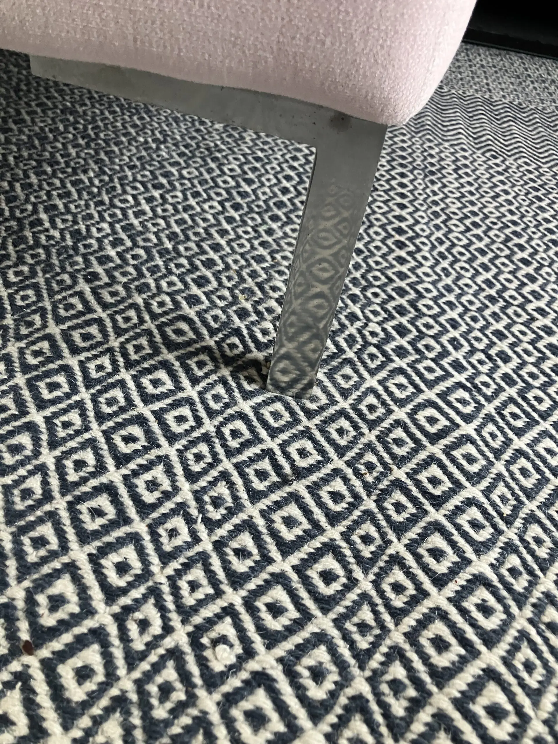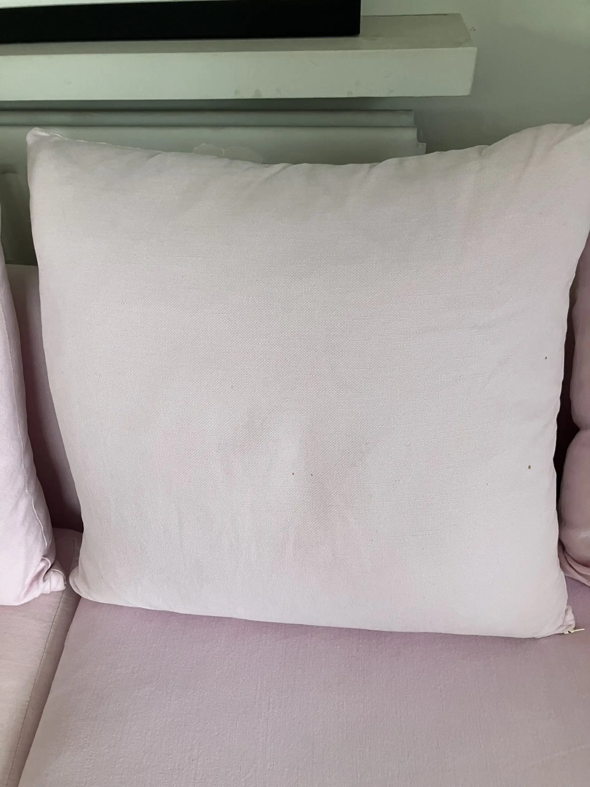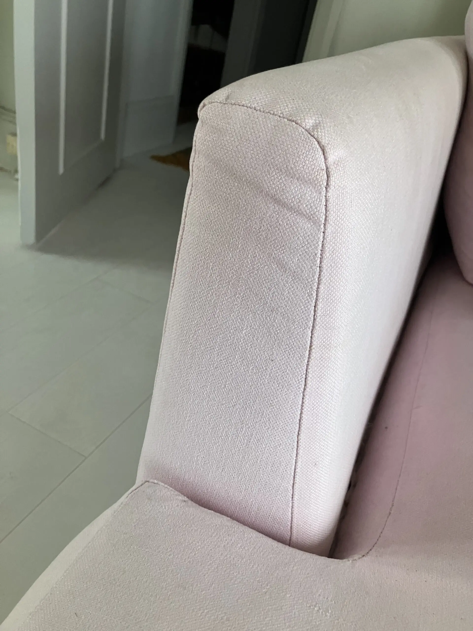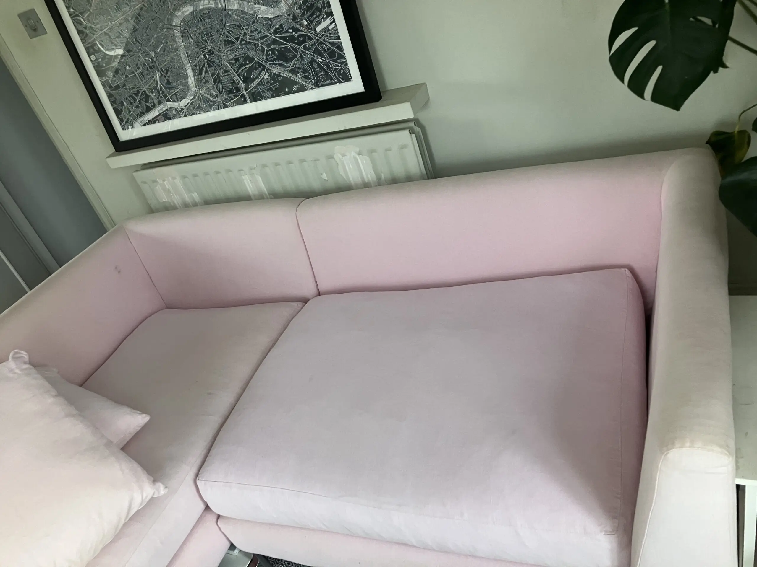 Bespoke three seater upholstered in 100% cotton pink linen (premium Roma fabric). It’s upholstered, with loose cushions. The back cushions (5 x 50cm square) are a mix of 2 x feathers and 3 x foam and the seat cushions (one is 95cm x 70cm and the chaise seat cushion is 143cm x 65cm, and the end of it is 83cm wide and both are 12cm deep) are feathers. The sofa is 190cm long, 70cm high and the chaise measures 116cm. It was hand sewn and is fantastically comfortable and stylish. There is gentle wear, no tears. The feet are chrome. The seat and the chaise are separate not one long piece. I’m throwing in two green velvet cushions!