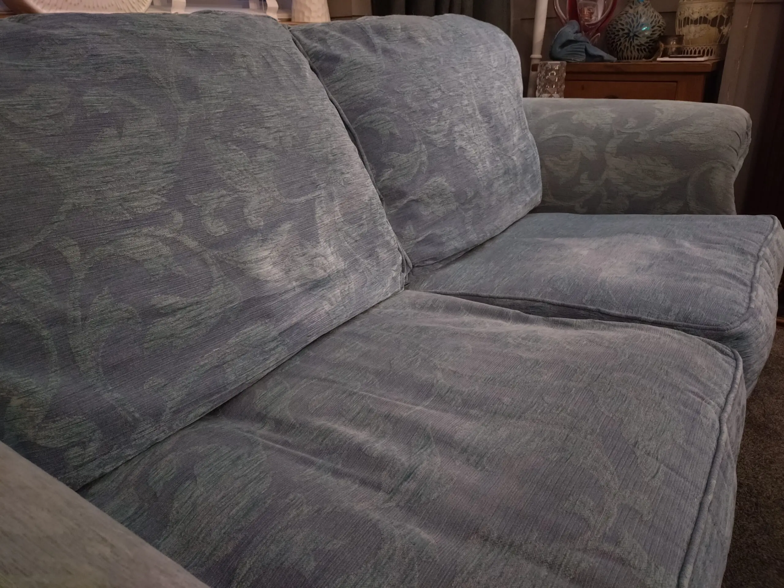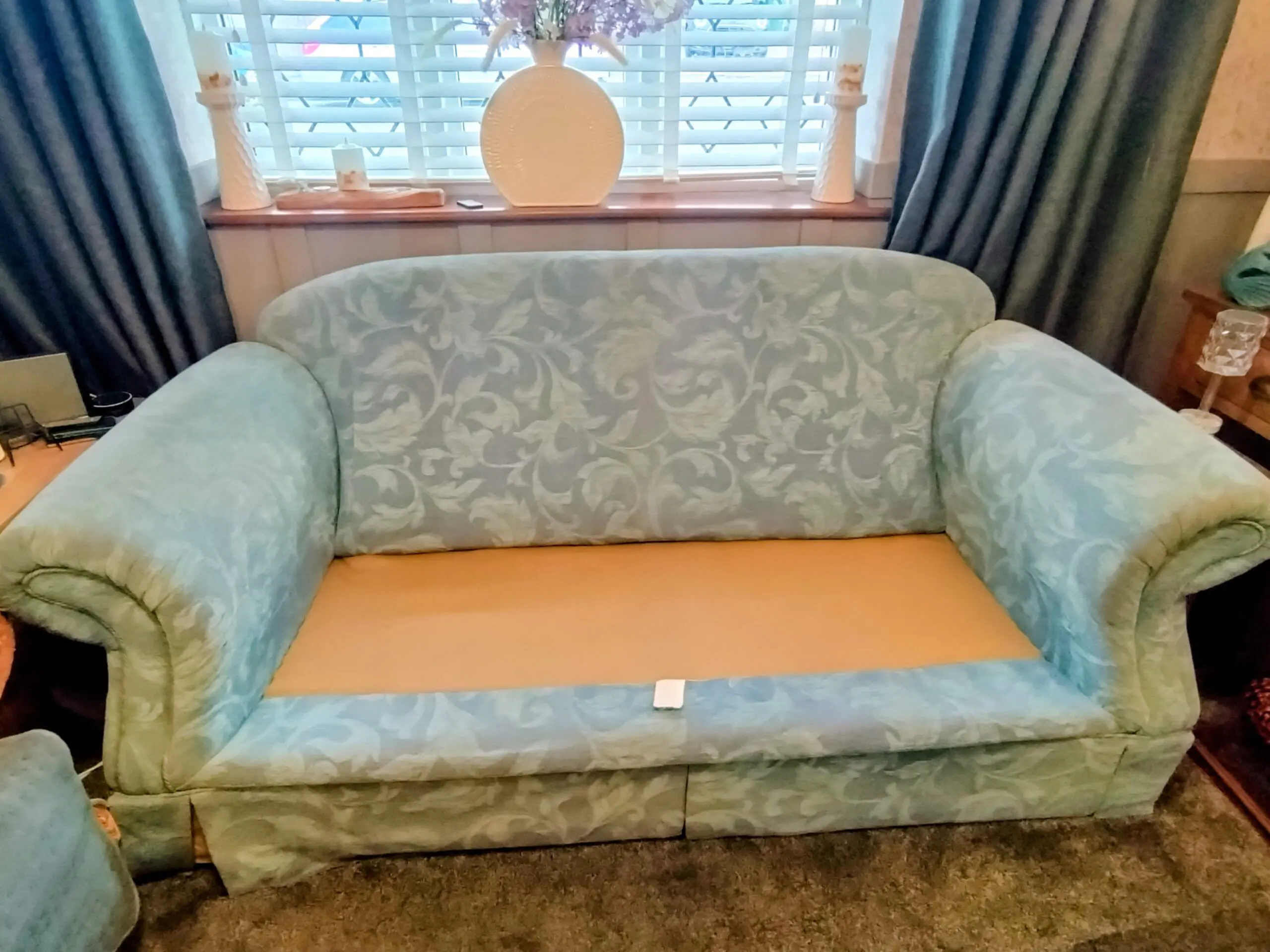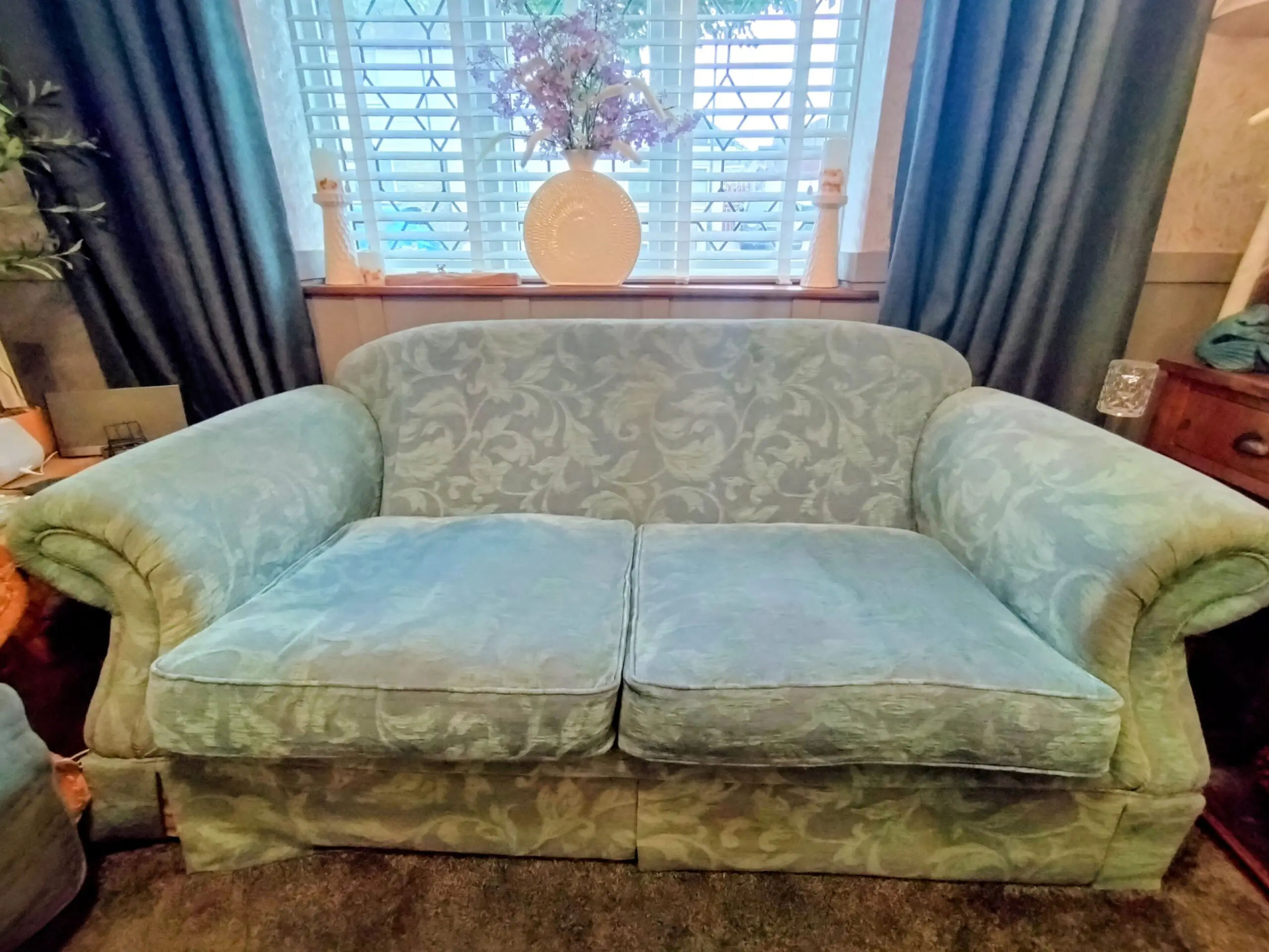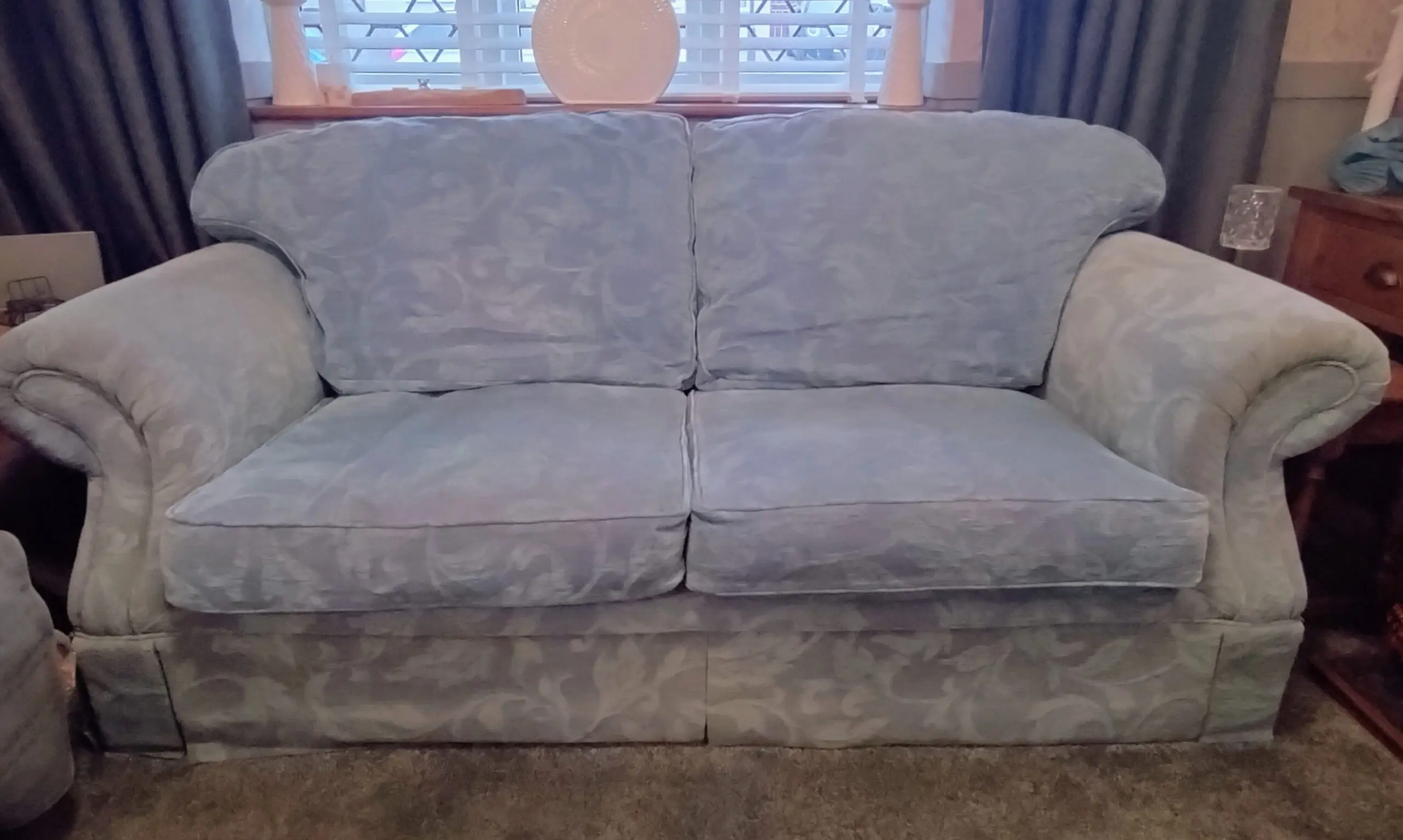 Blue three seater sofa with a leaf style pattern. Solid wooden frame with a good spring base. Originally from John Lewis for £1800. Still in great condition. Really comfortable with soft cushions. Removable and washable cushion covers. From a smoke free home. Collection only. Open to offers.