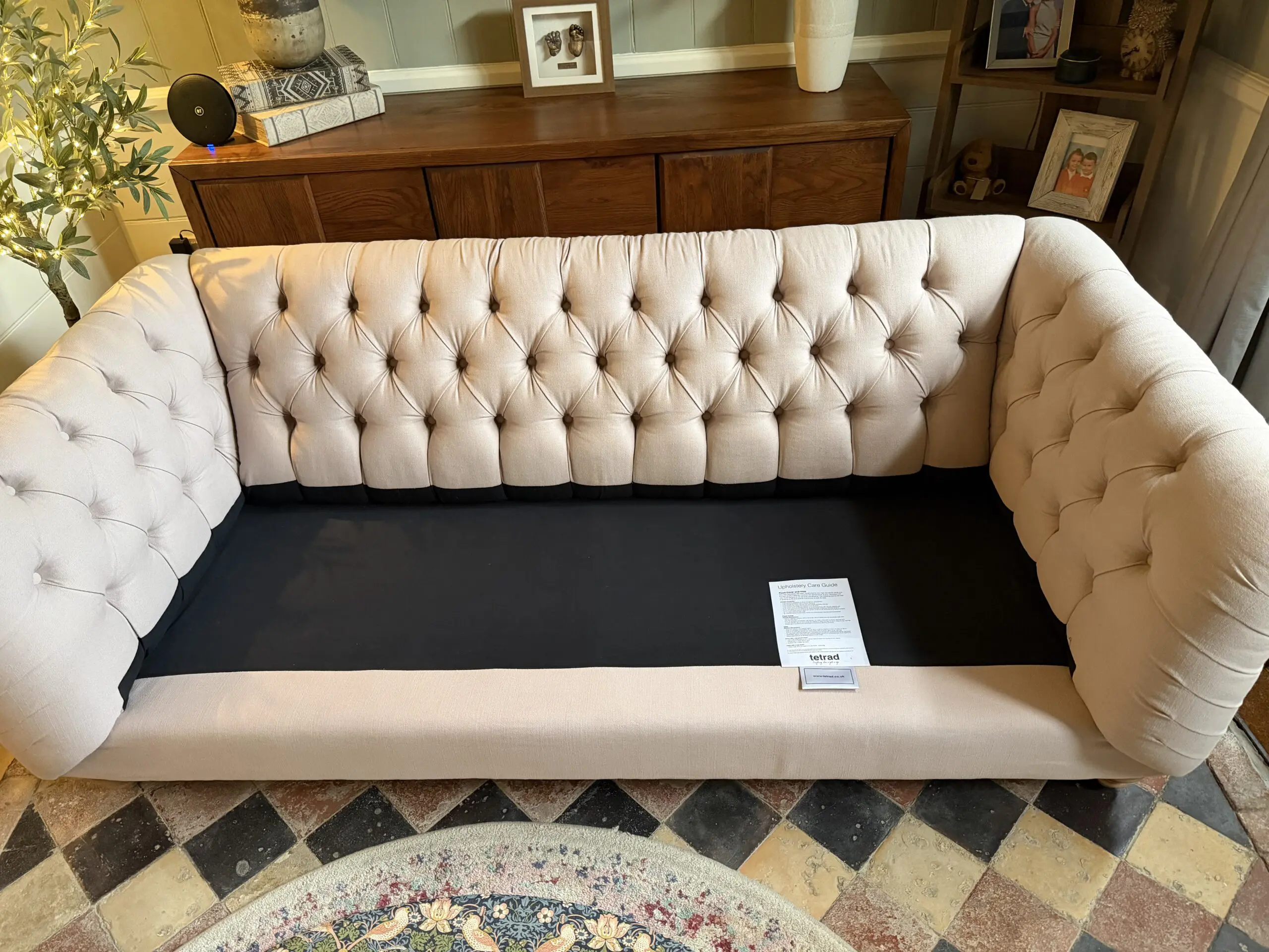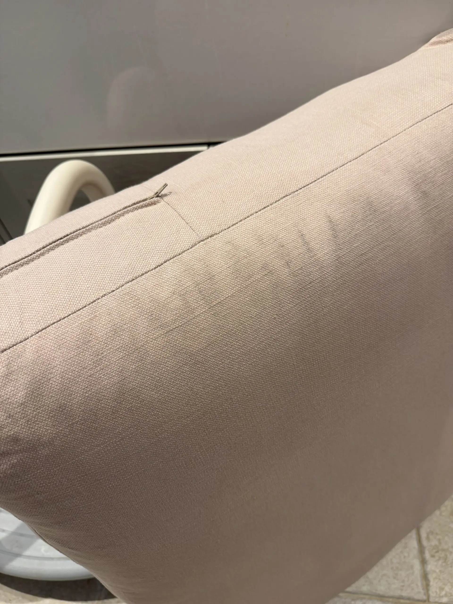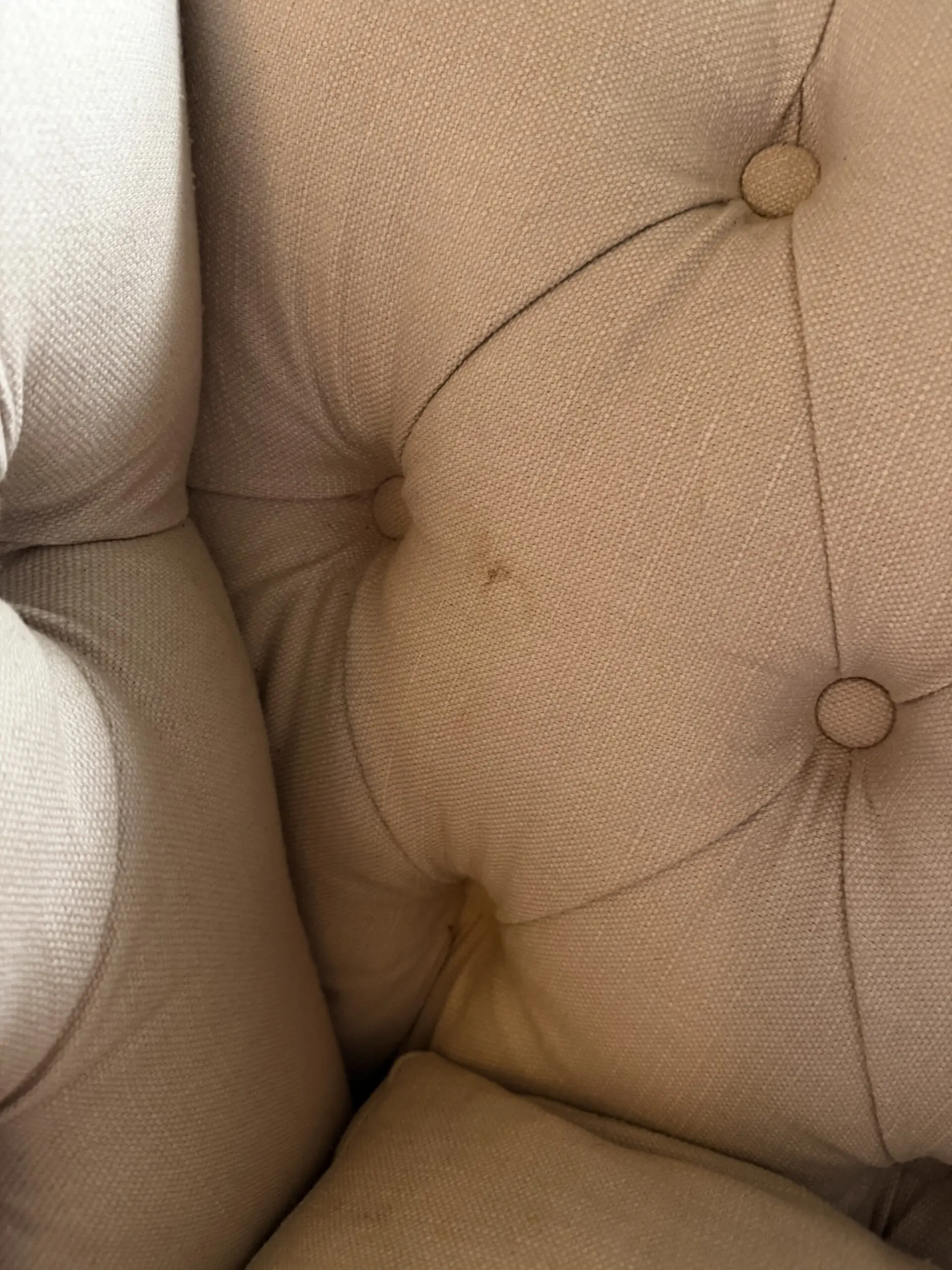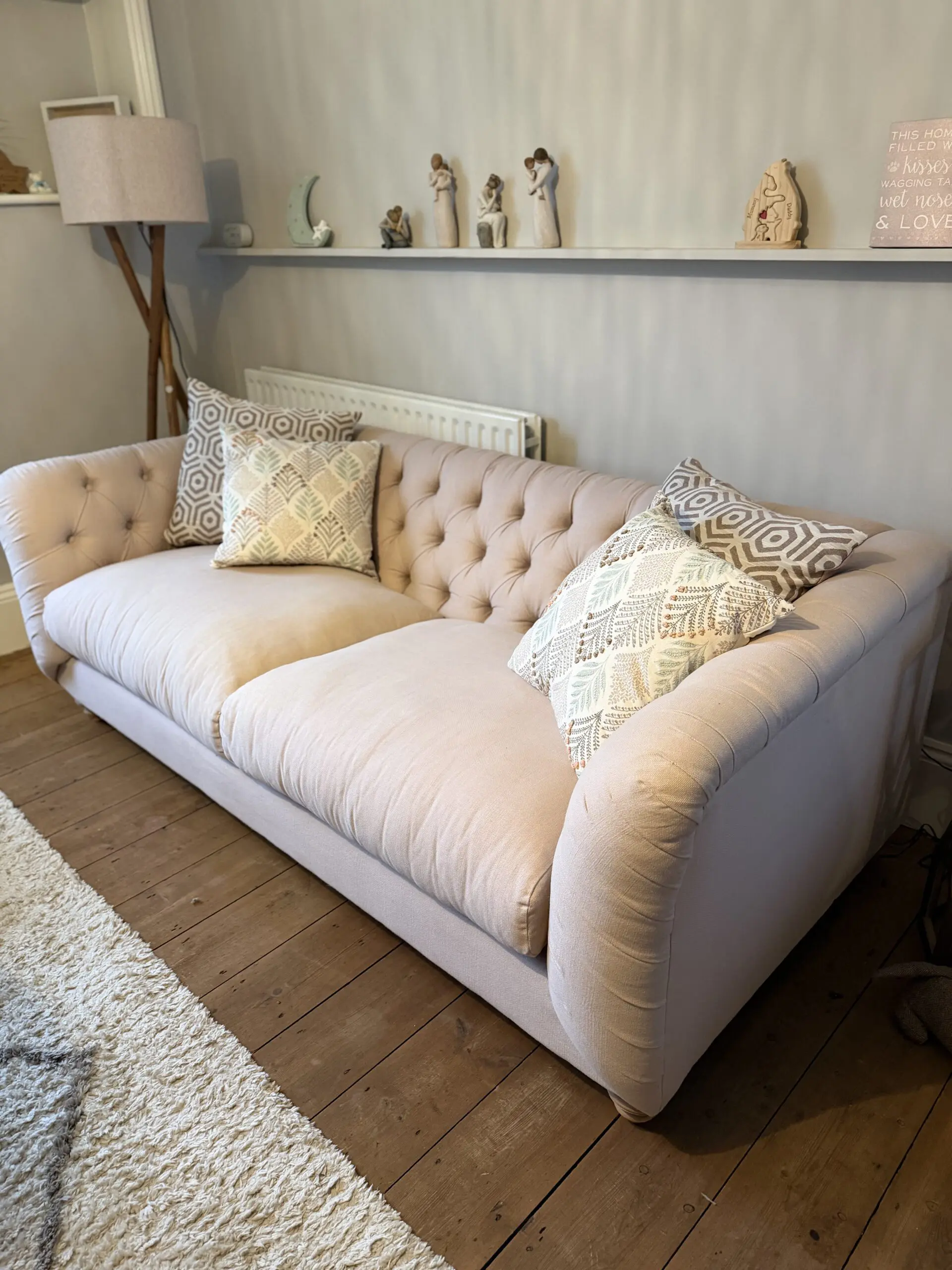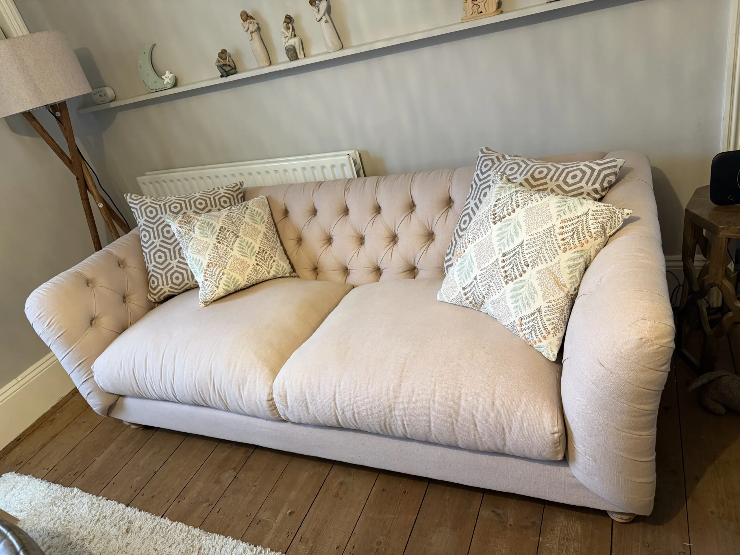 Around 18 months old and bought for £1,900. Used in the hallway so hasn’t been sat on as a main sofa or for prolonged periods. Does have some marks on which haven’t been cleaned so the whole sofa could do with a clean by the new owner. No tears or rips. Zip cushion cases and wood driftwood legs.