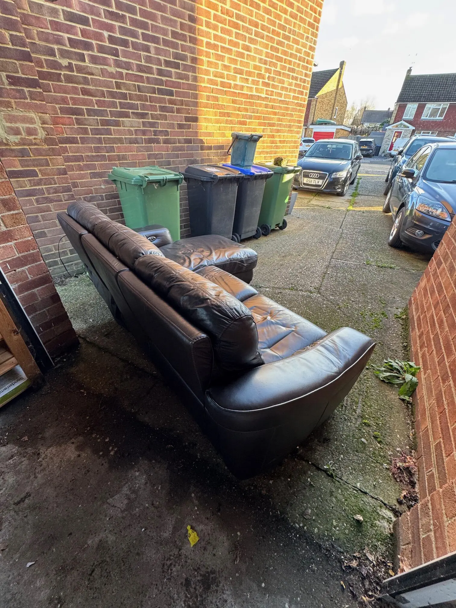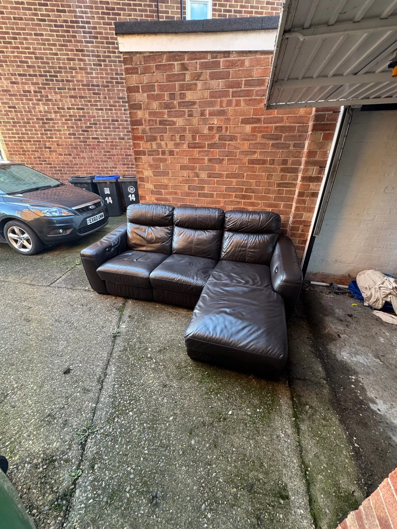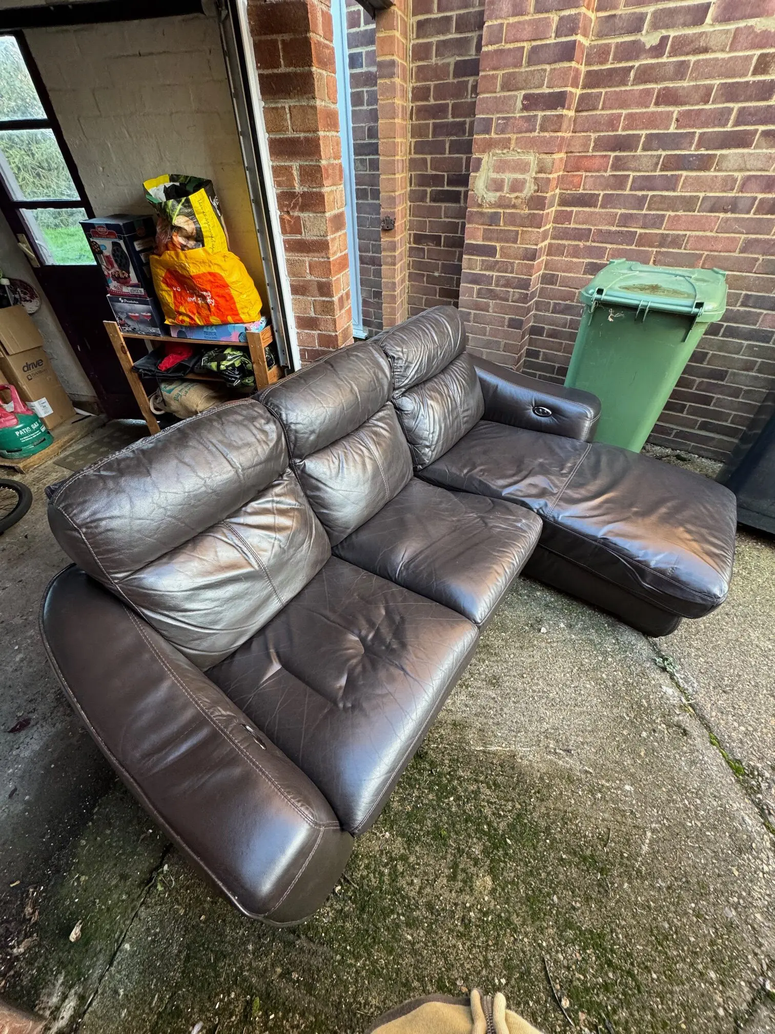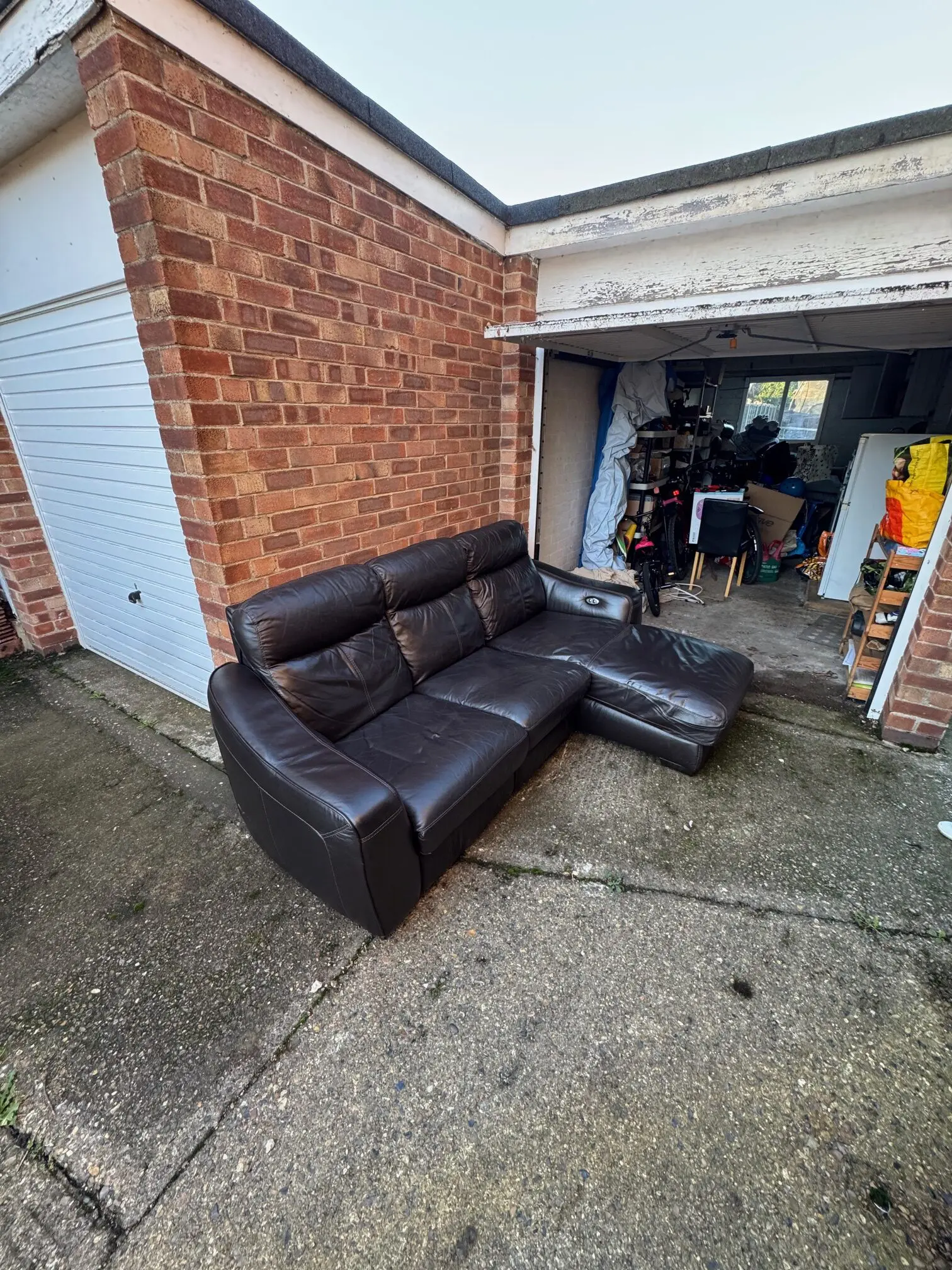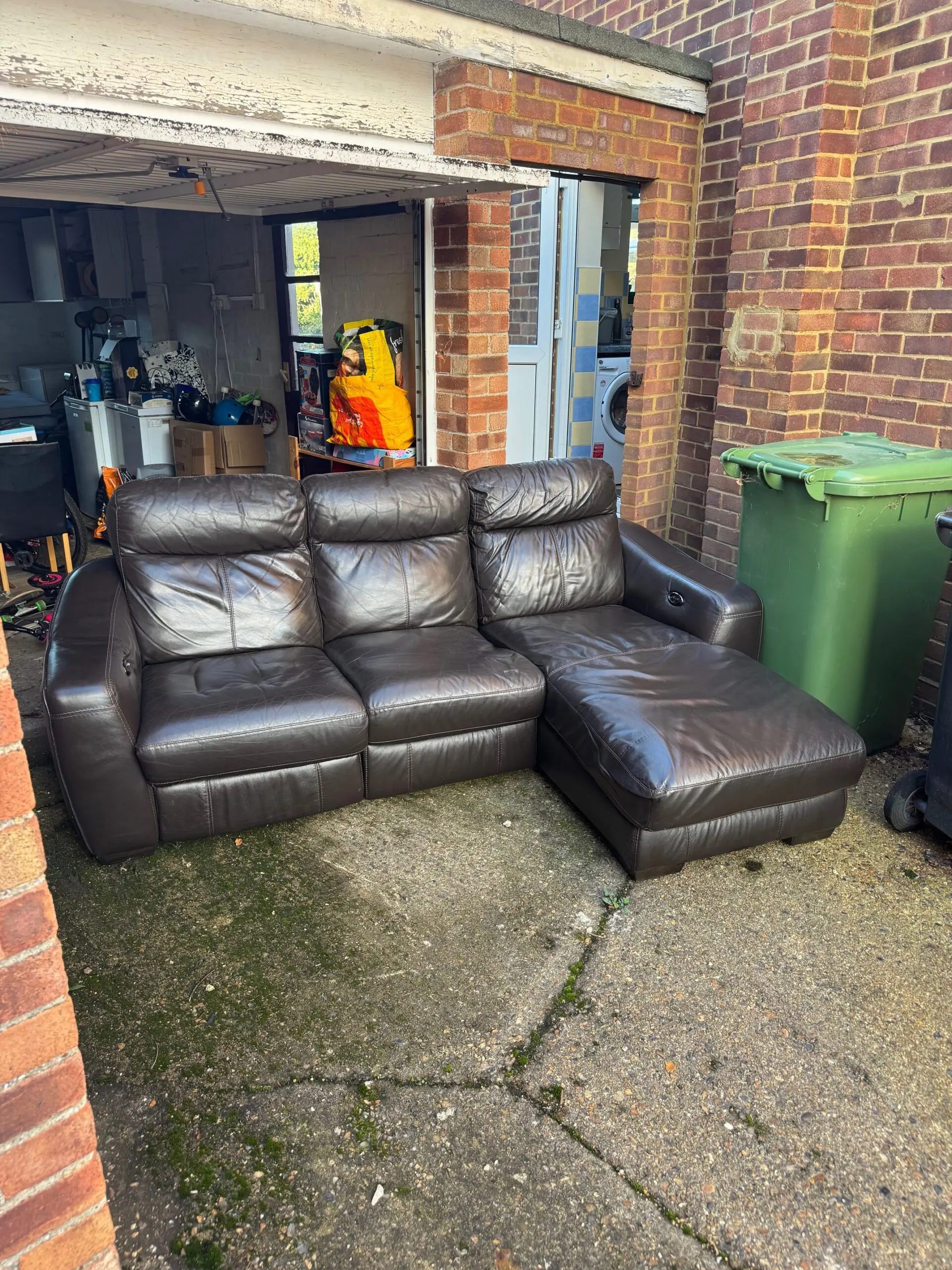 Fully functional brown electrical reclining leather sofa, overall length 228cm, width for L side 158cm (short width 92cm), in good condition. Comes in two pieces, collection only.