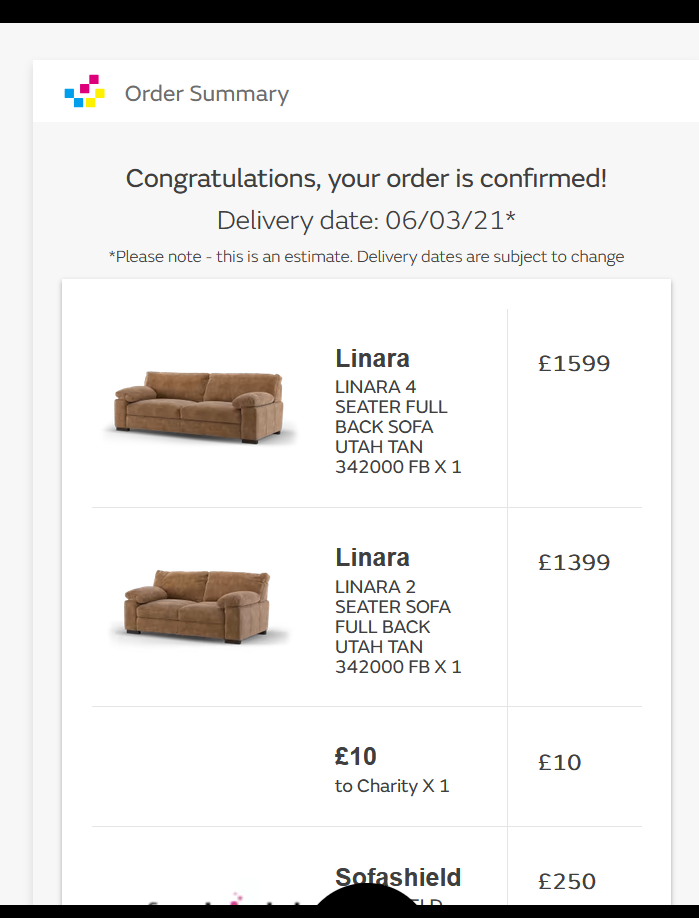 From start to finish this company was amazing. We were unsure about choosing online without trying first so took a chance. We are thrilled with our choice . Delivery was great was in touch with sofalistic all the way. They were fabulous thank you