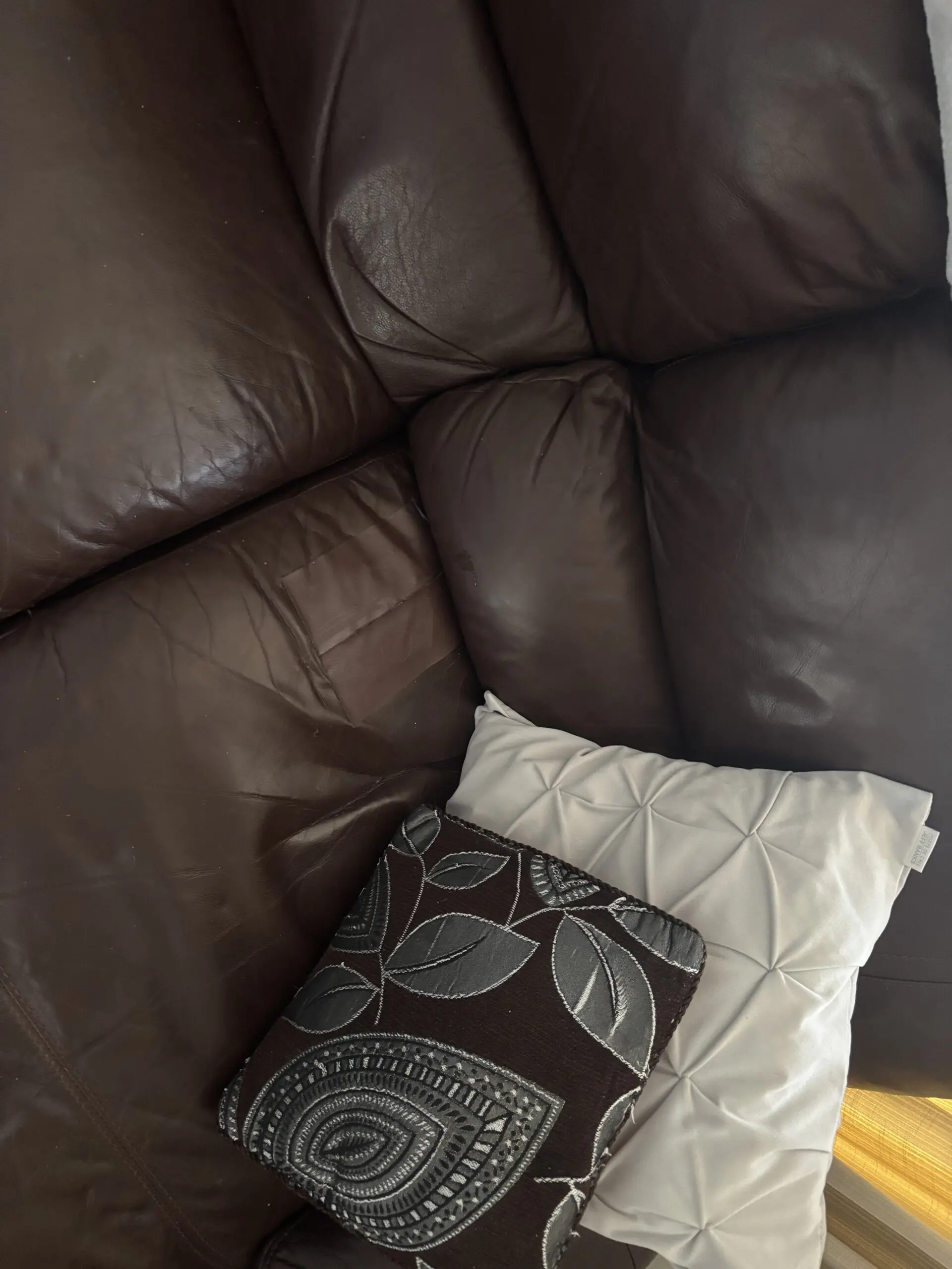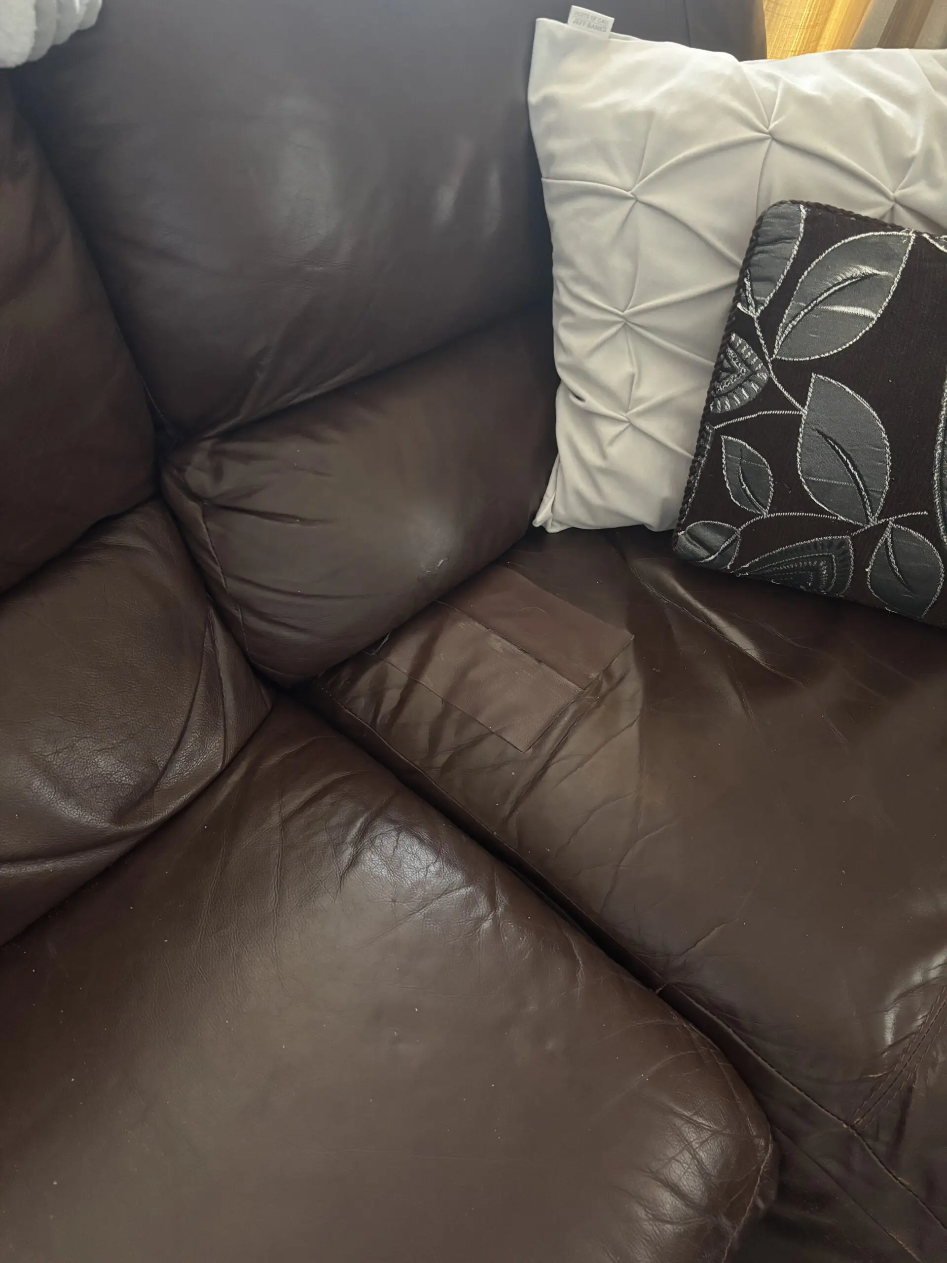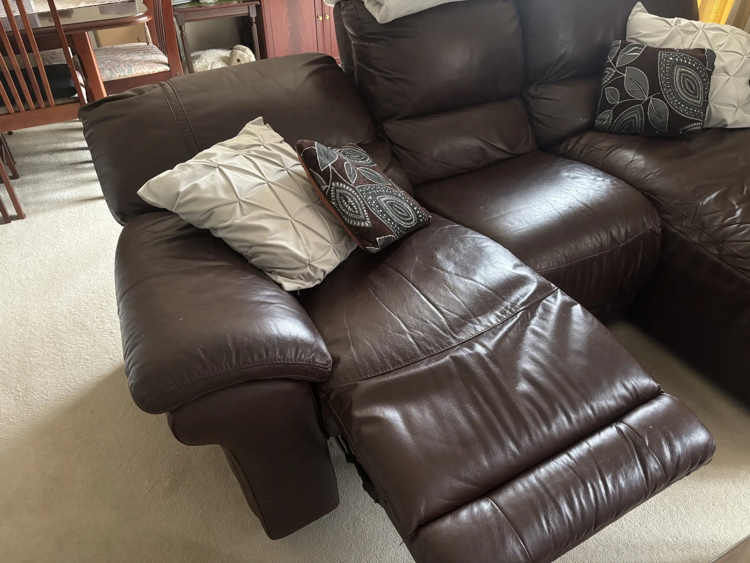 Electric recliner end and middle are in perfect condition – barely used. Chaise lounge section has split that has been patched (as per pics).