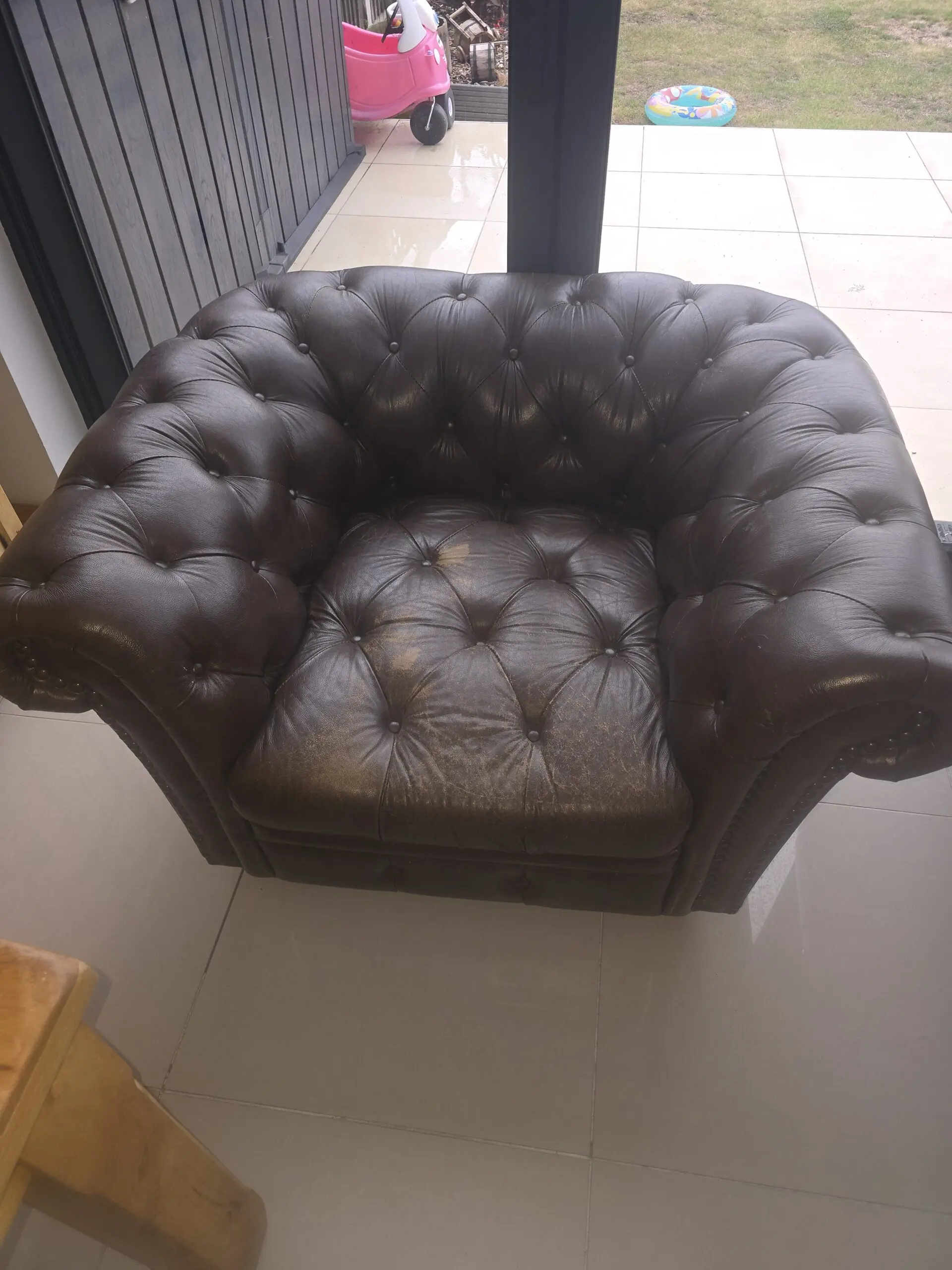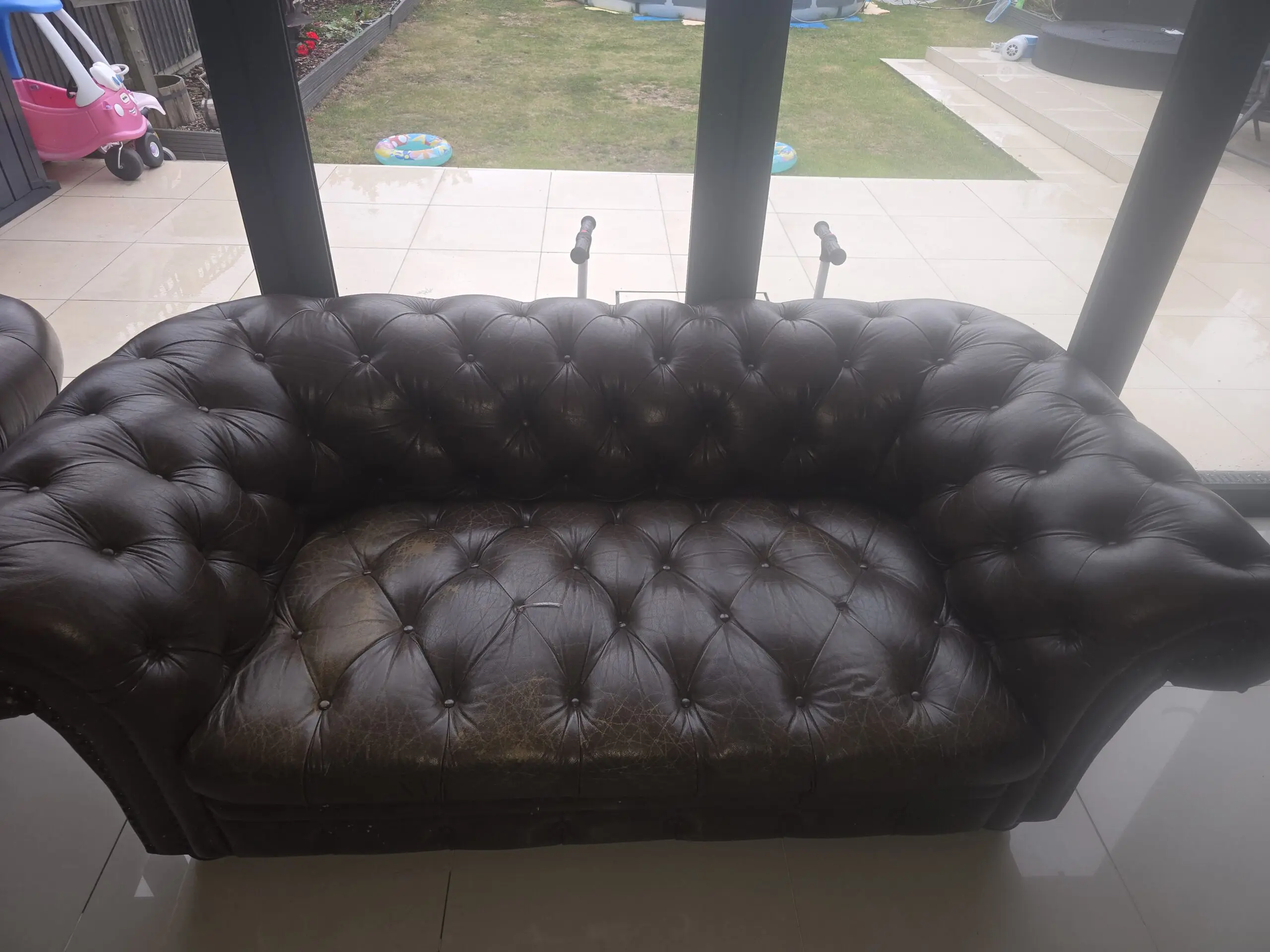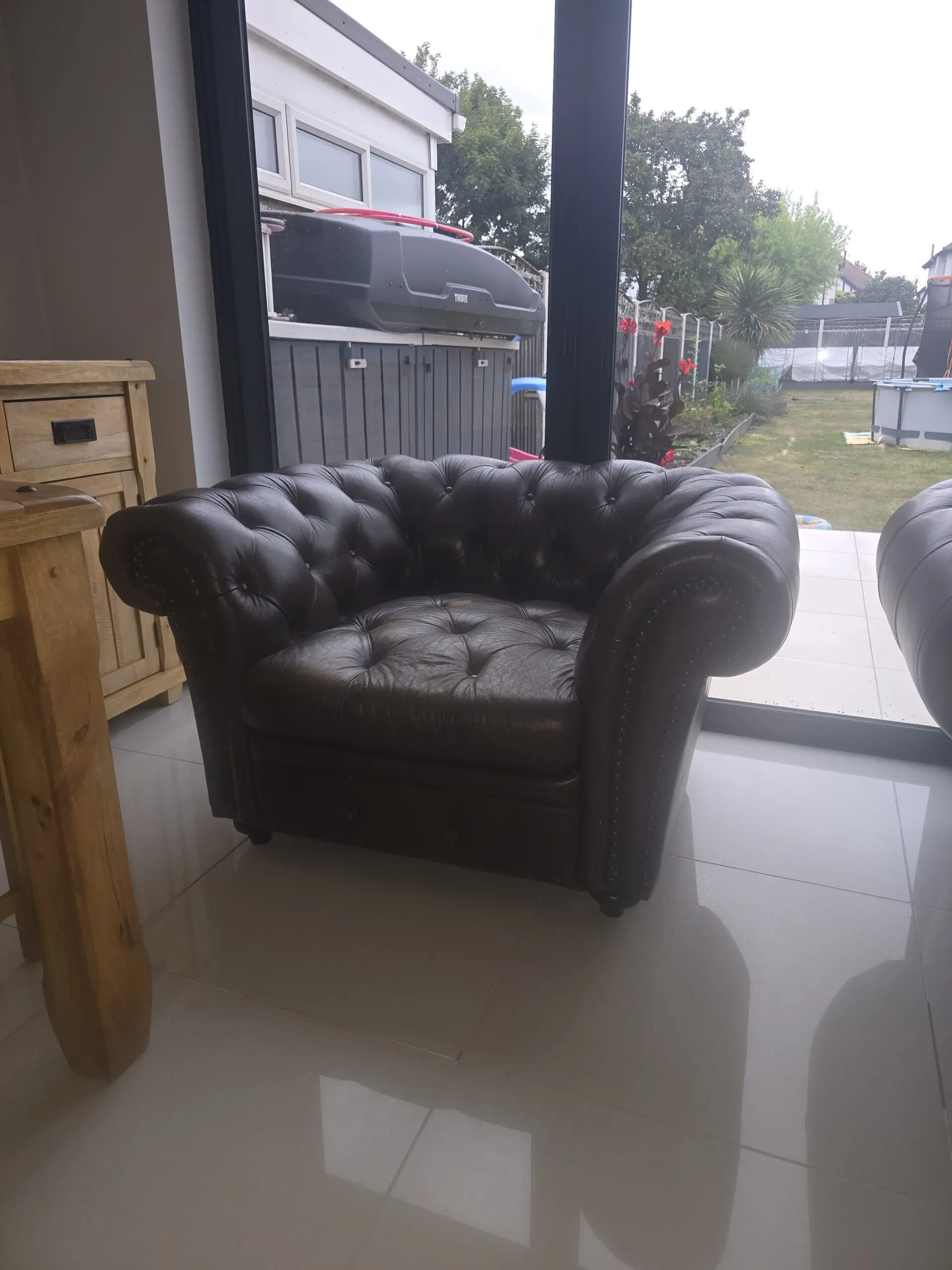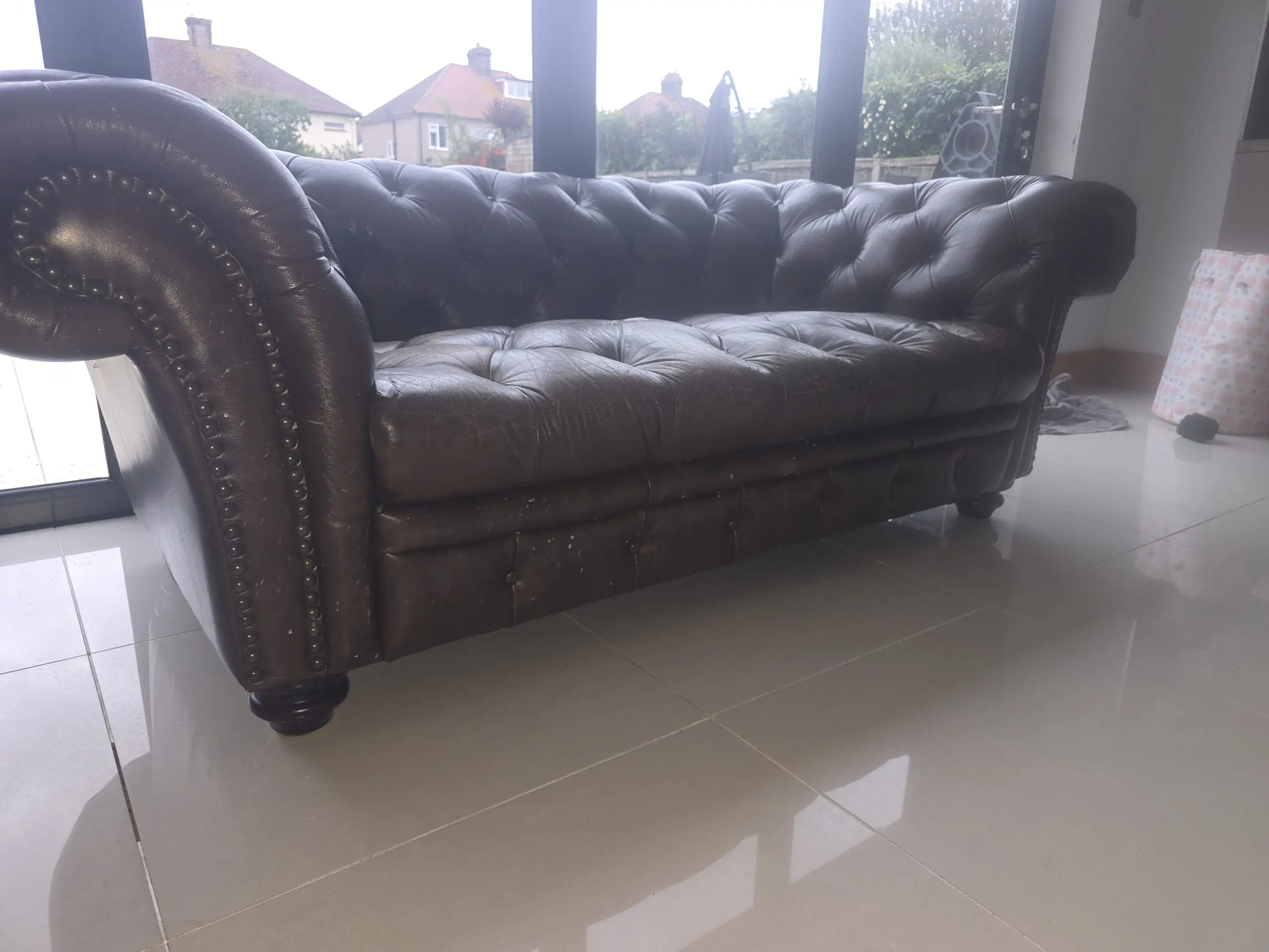 A fantastic brown leather fully buttoned. 3 seater Sofa with matching 2 armchairs in good condition with no rips or tears it is very comfortable and availble for sale