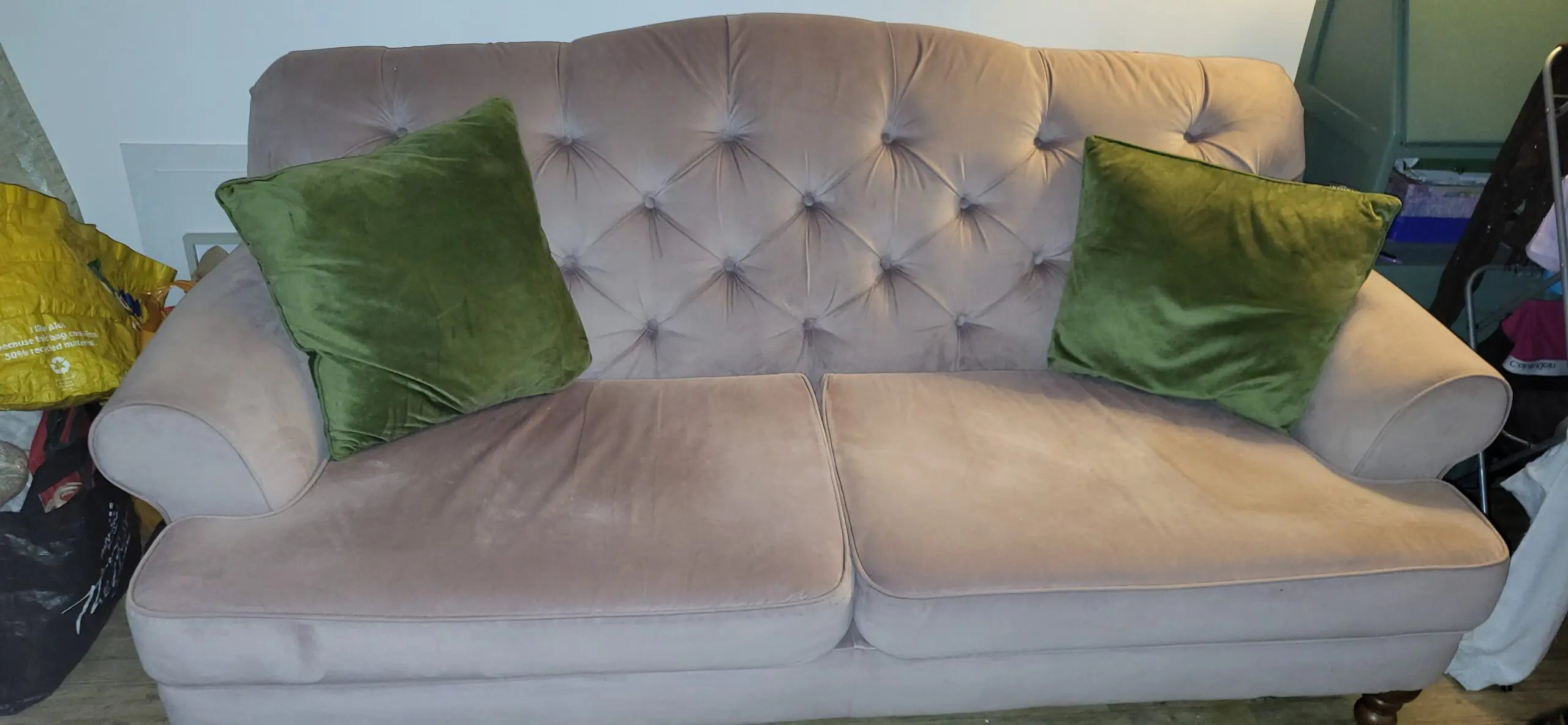 An elegant dusky pink velvet sofa with button back and wooden legs. The seat base cushion covers are removable and machine washable. I believe it was bespoke made and gifted to me so I don’t know the origin of manufacture. It is very comfortable and spacious enough to stretch out on. There is some slight scratching on the seat covers but not too noticeable and still a lovely solid piece of furniture.