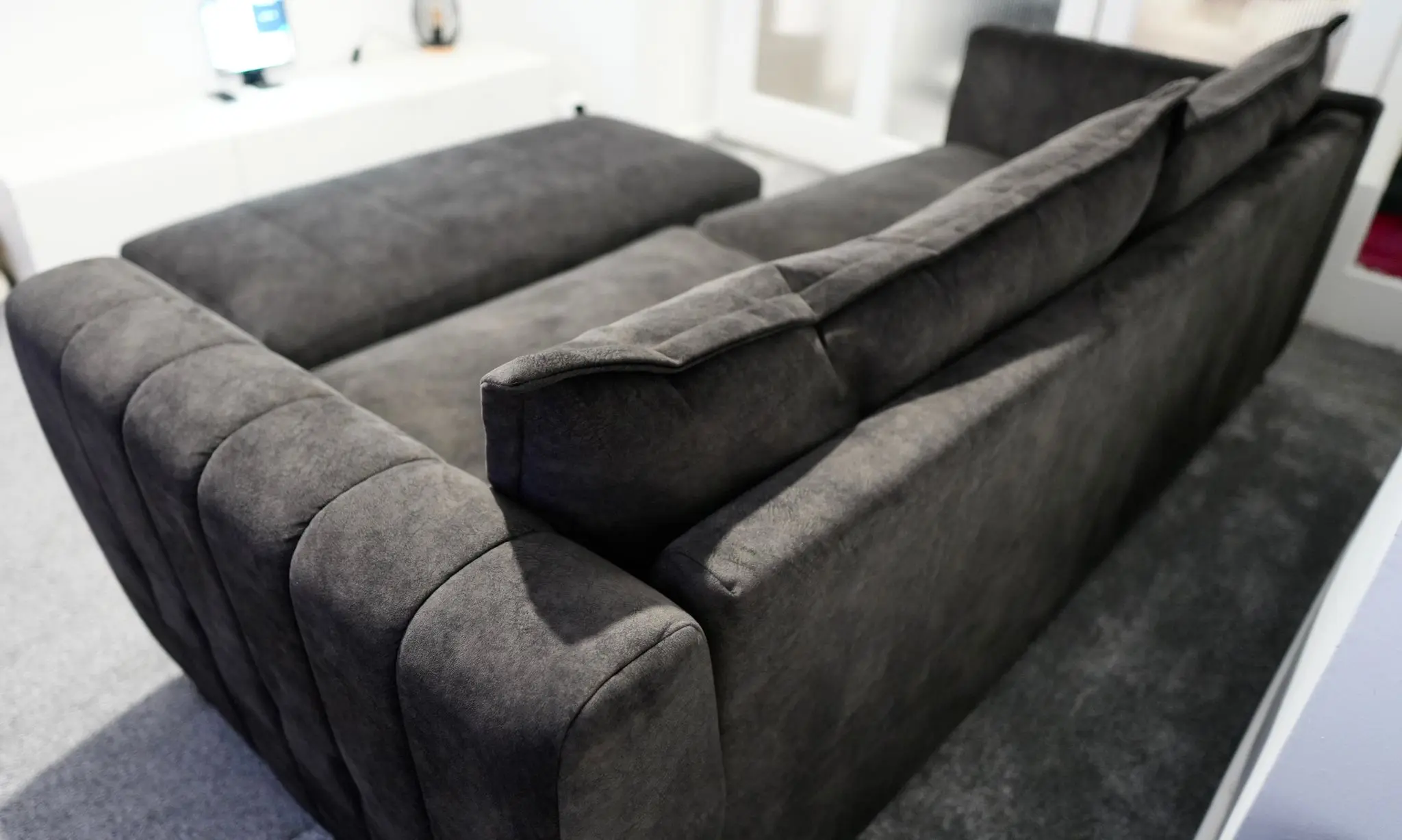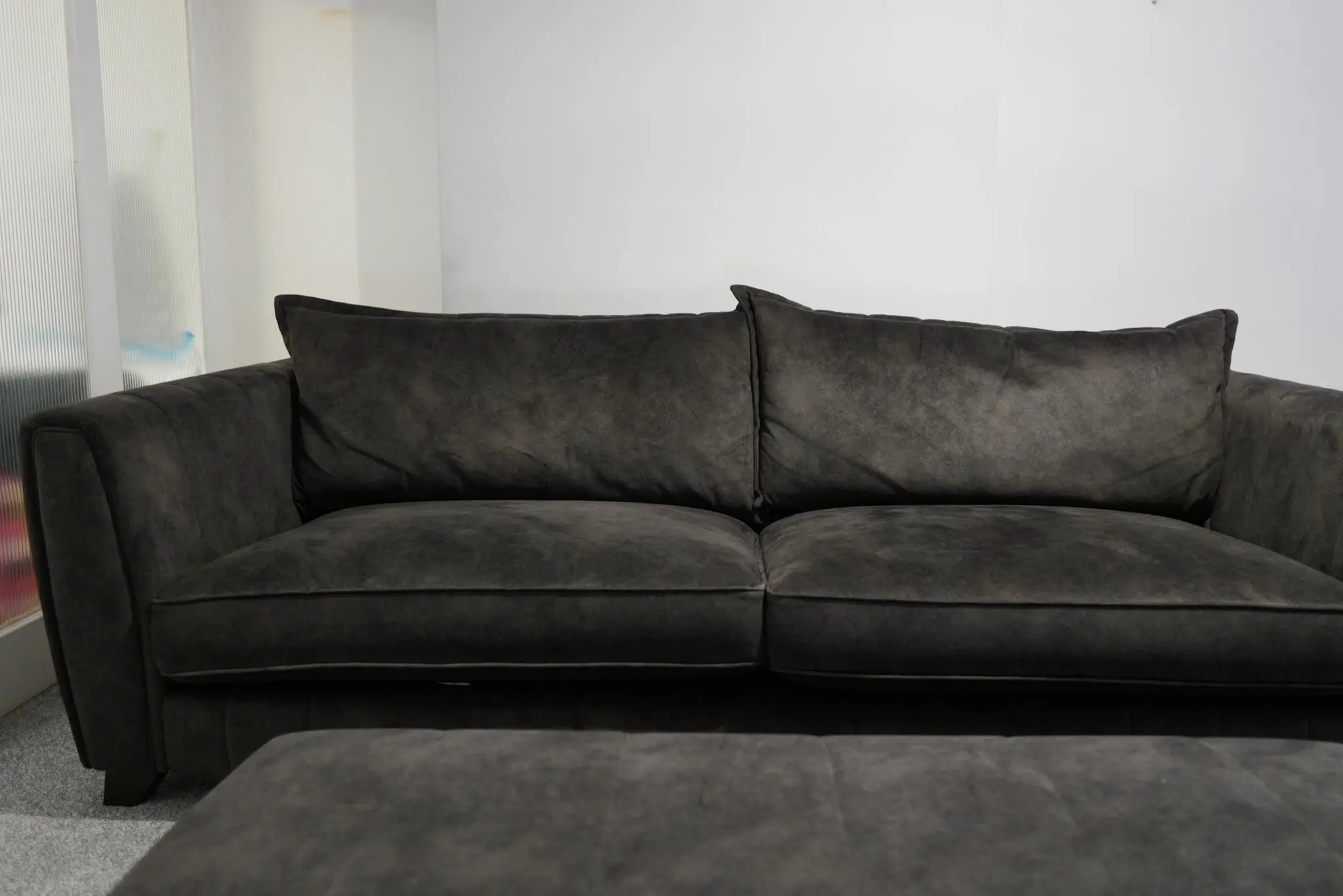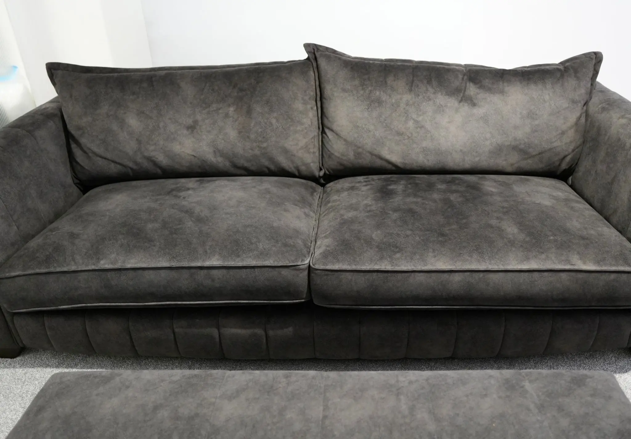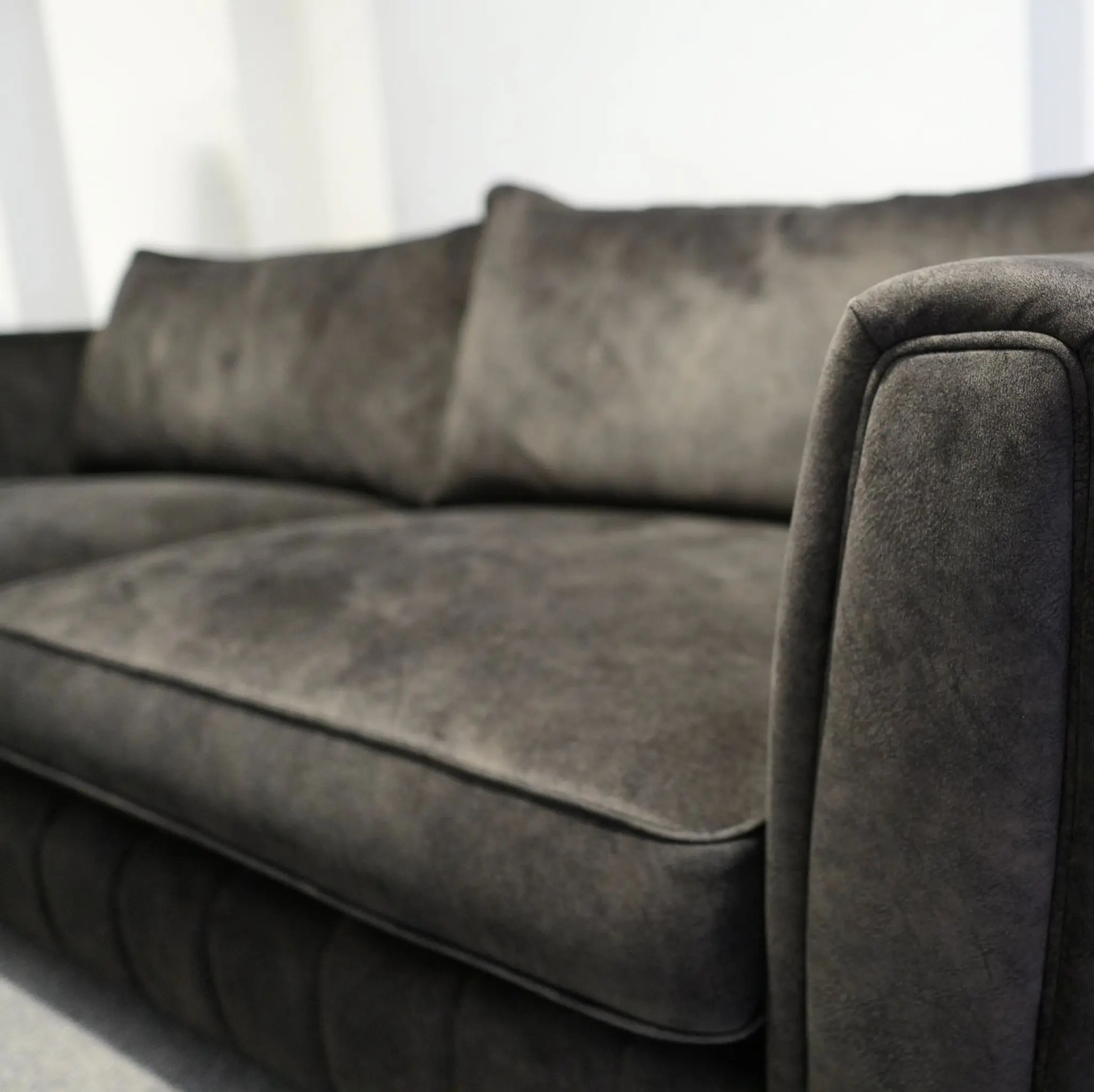 Looks like leather, feels like velvet – this suede-effect fabric features the soft feel and subtle veining of natural suede, but in a low maintenance, hard wearing fabric. Absolute excellent condition with no damage or blemishes whatsoever, regularly cleaned and conditioned.