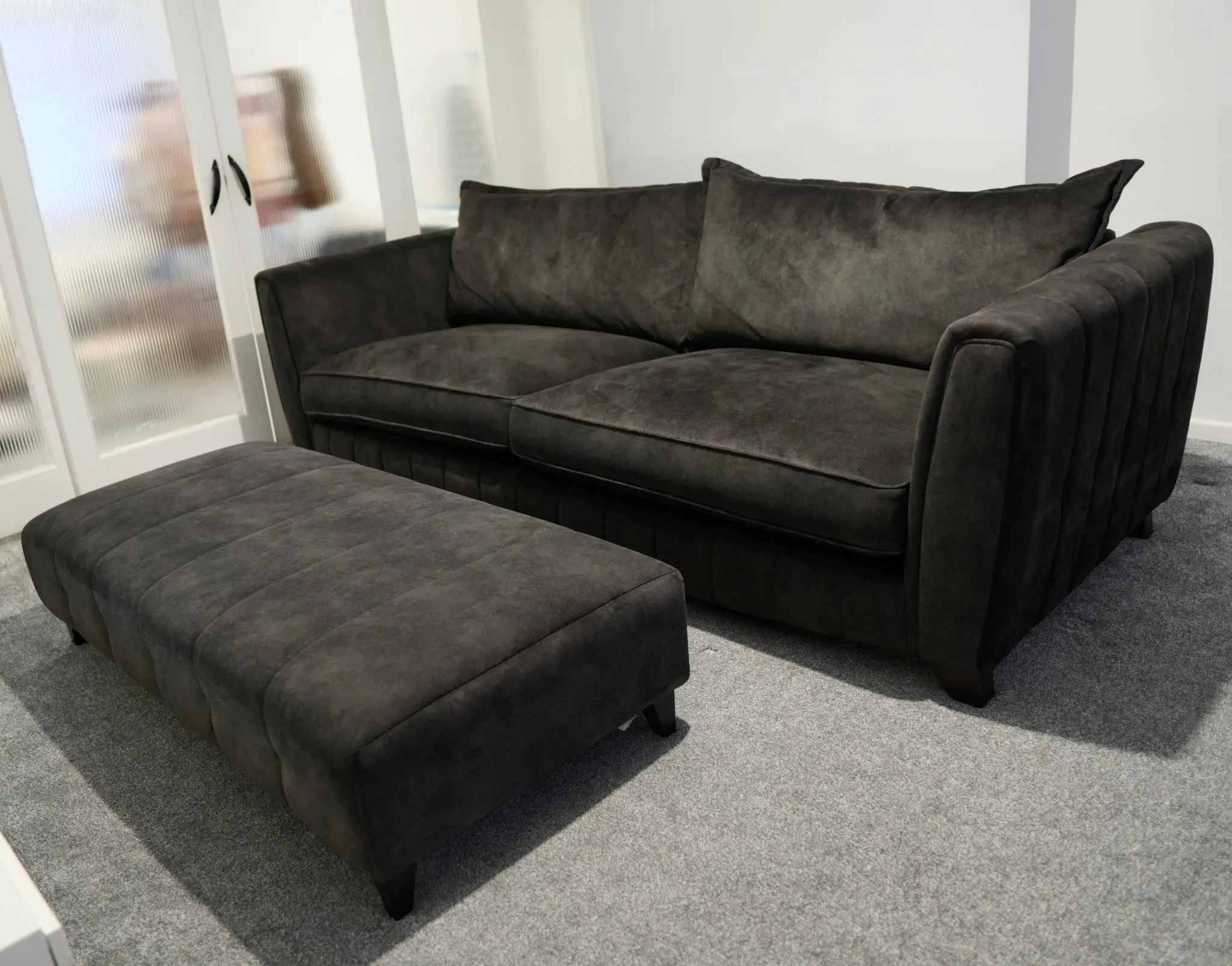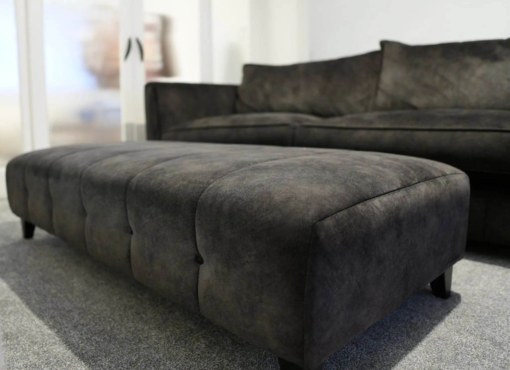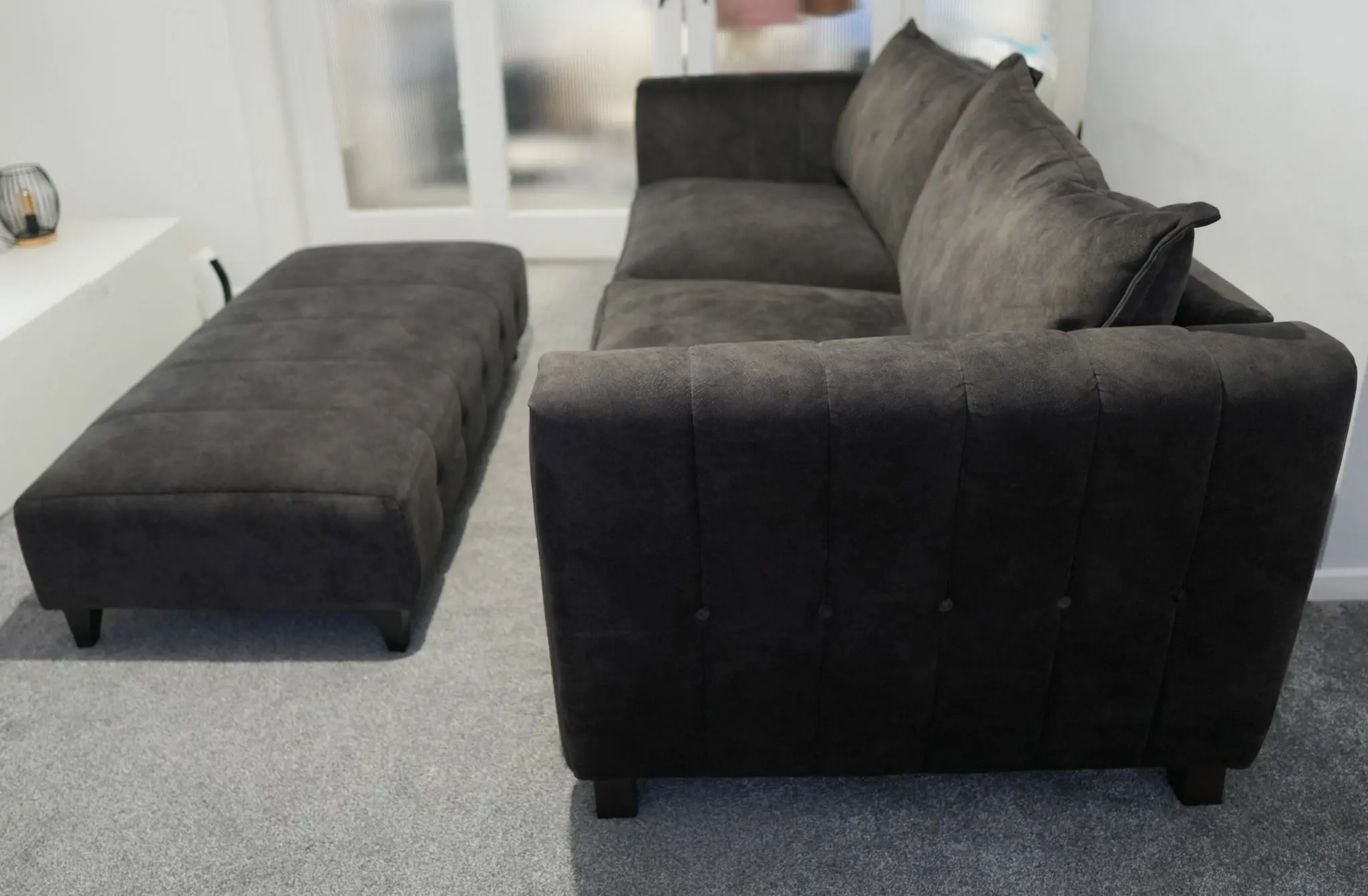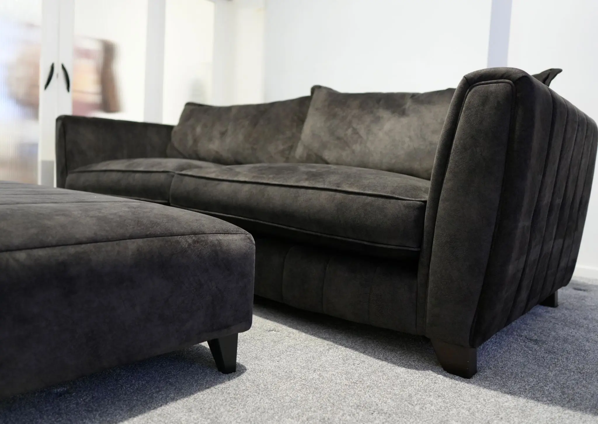 Looks like leather, feels like velvet – this suede-effect fabric features the soft feel and subtle veining of natural suede, but in a low maintenance, hard wearing fabric. Absolute excellent condition with no damage or blemishes whatsoever, regularly cleaned and conditioned.