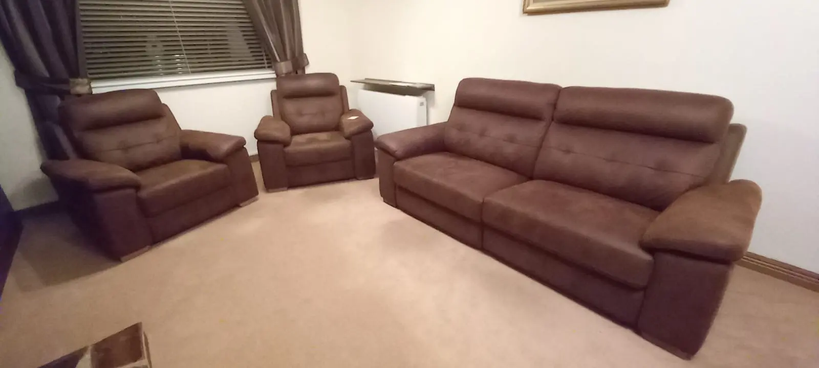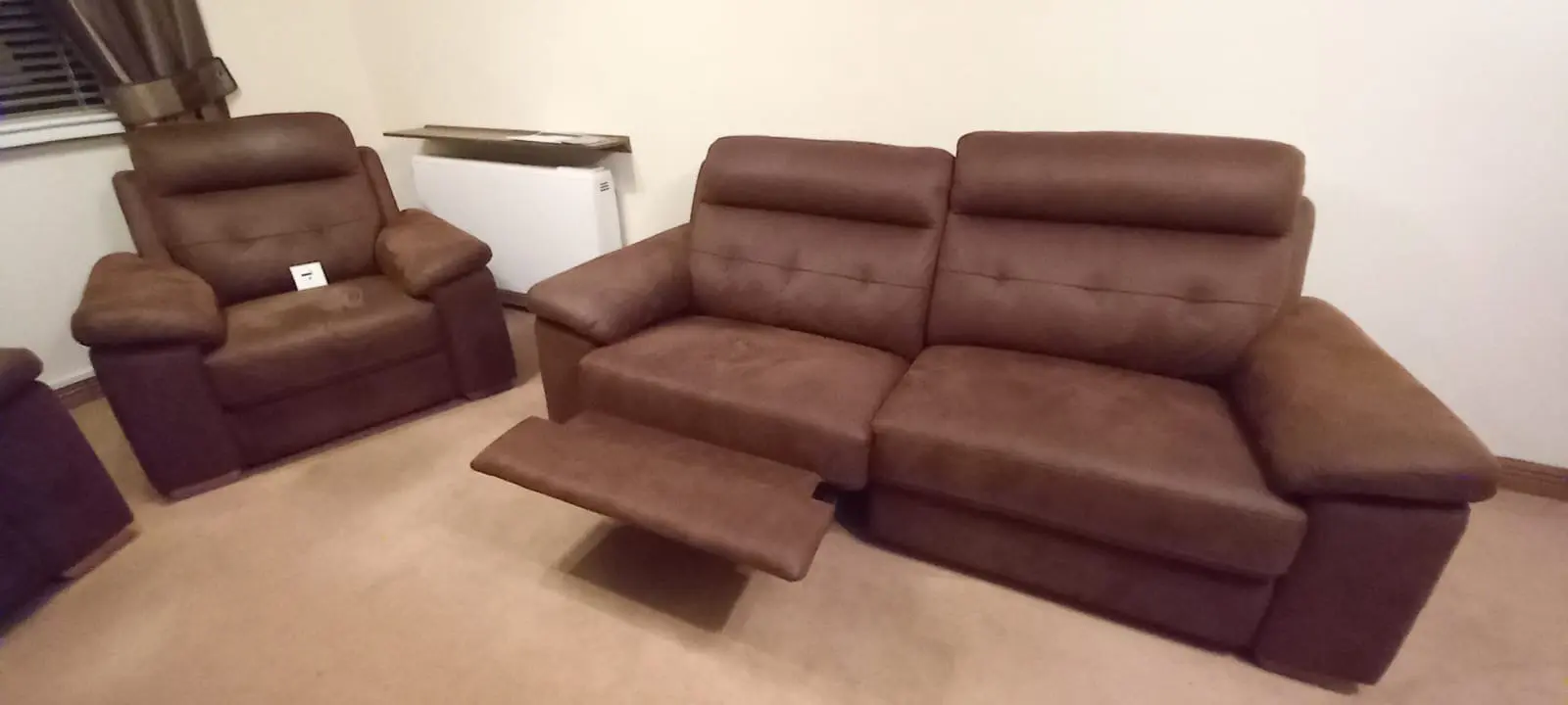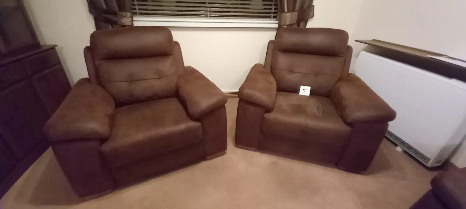 2 reclining chairs in immaculate condition, less than five years old in a home with only one residence (therefore less wear and tear). One recliner is electric and one manual. The manual reclining sofa sits three comfortably. Looks very on trend alongside being very ergonomic.