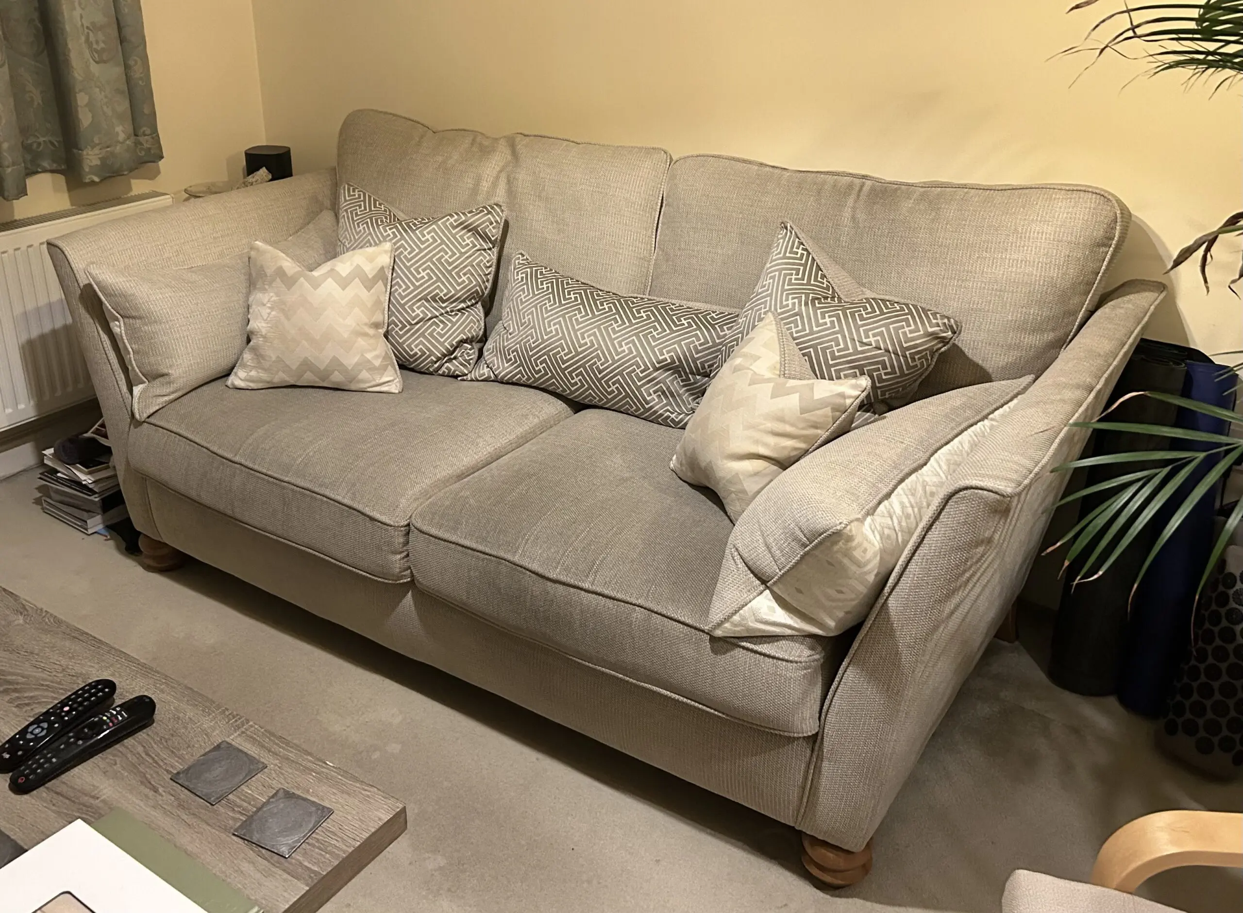 Comfortable high sided sofa in a oatmeal/beige colour with full set of cusions