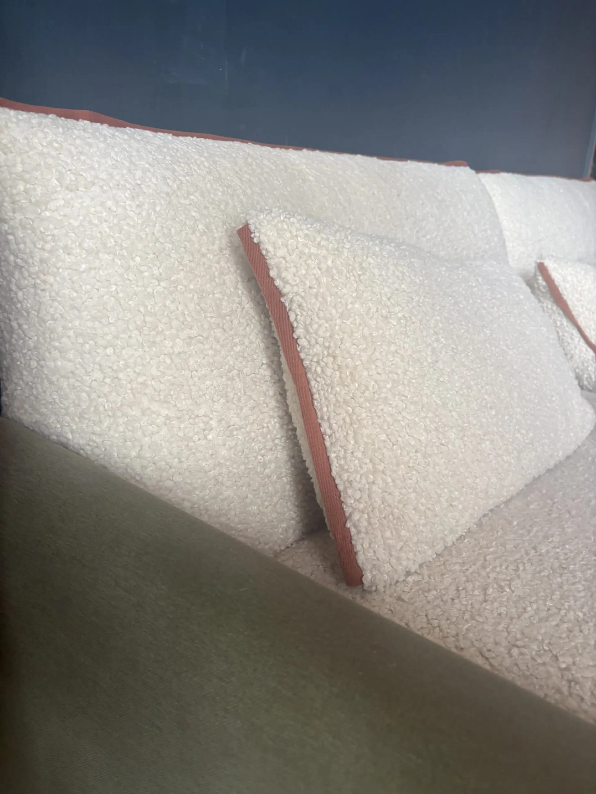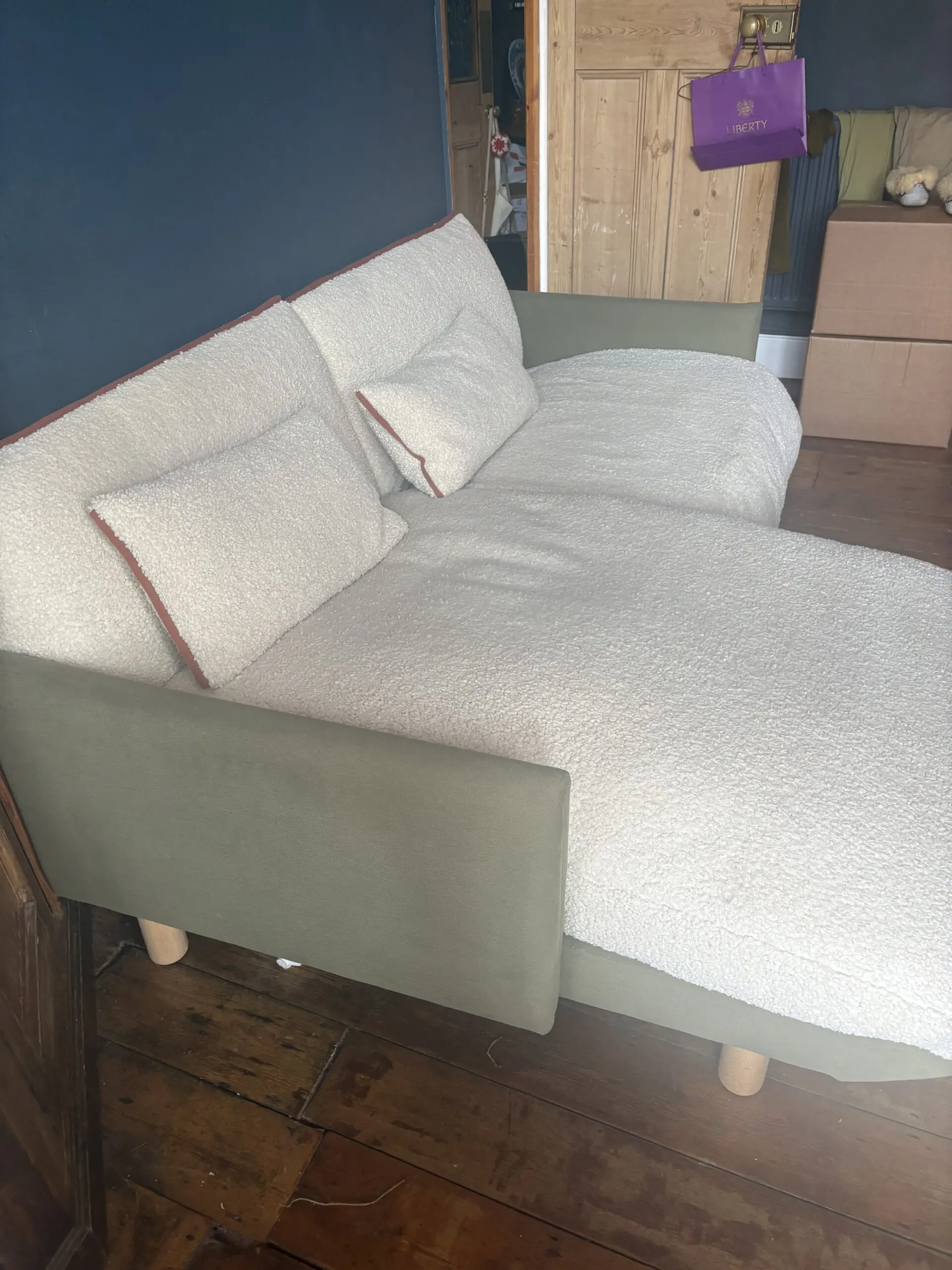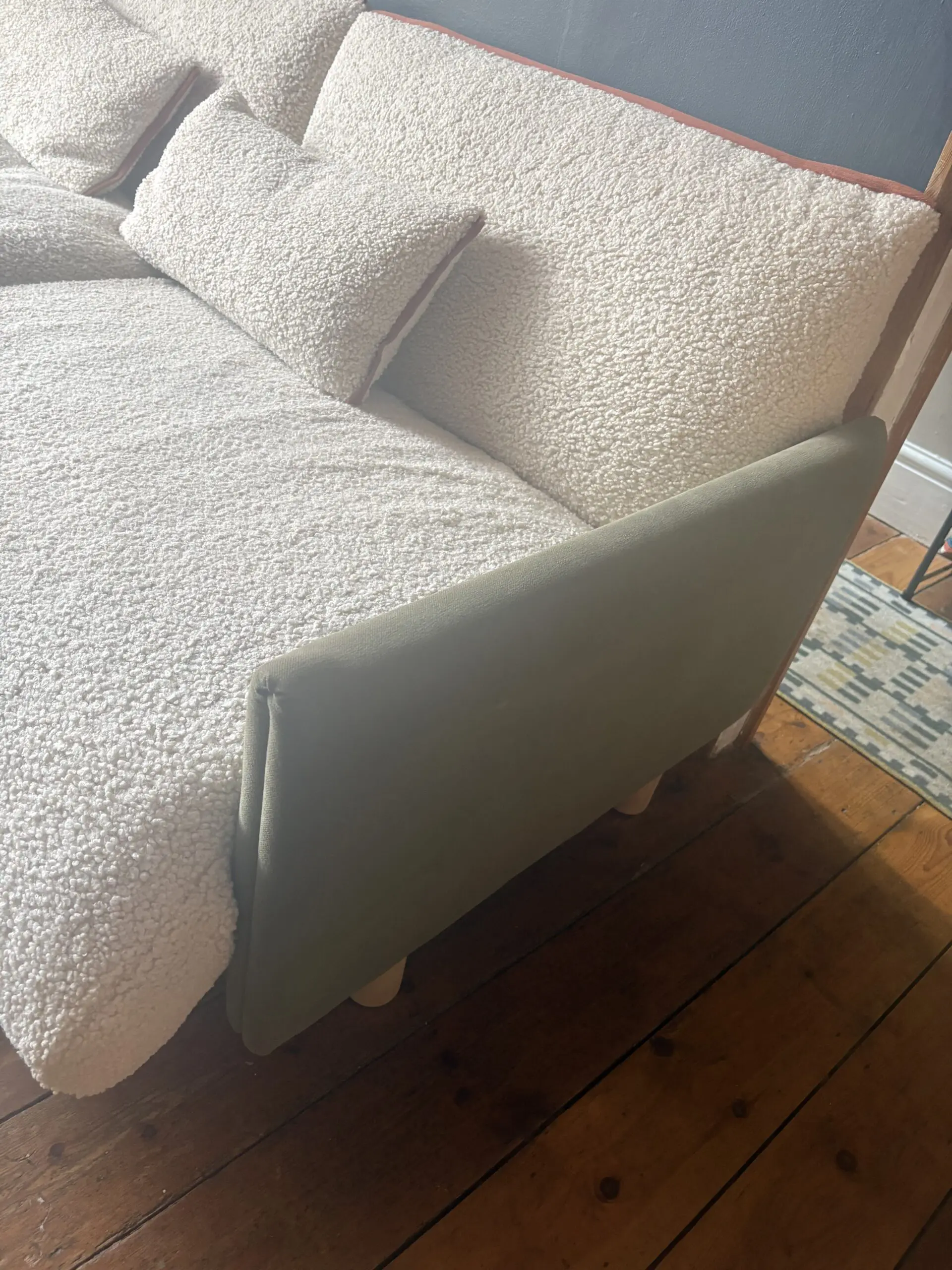 Cozmo three seater sofa with chaise. The sofas are now available in John Lewis as well. The seats and back are covered in a faux sheepskin. You can see that’s some of the texture has flattened where I’ve been sitting. However, the covers are removable and washable. The frame itself is covered in a sage coloured linen fabric and the cushions have a terracotta trim. I have had this Sofa for just under two years and it cost me £2500.