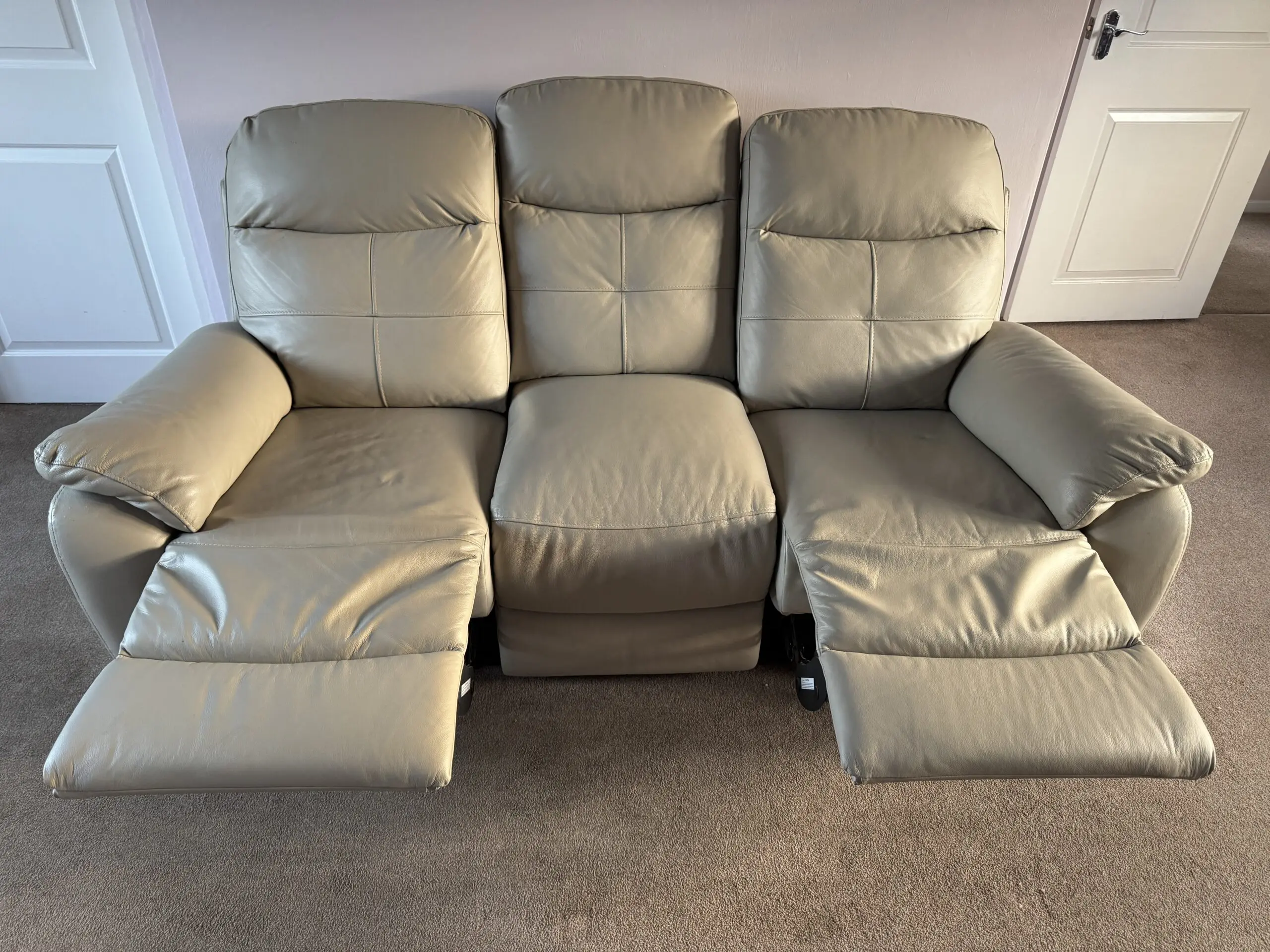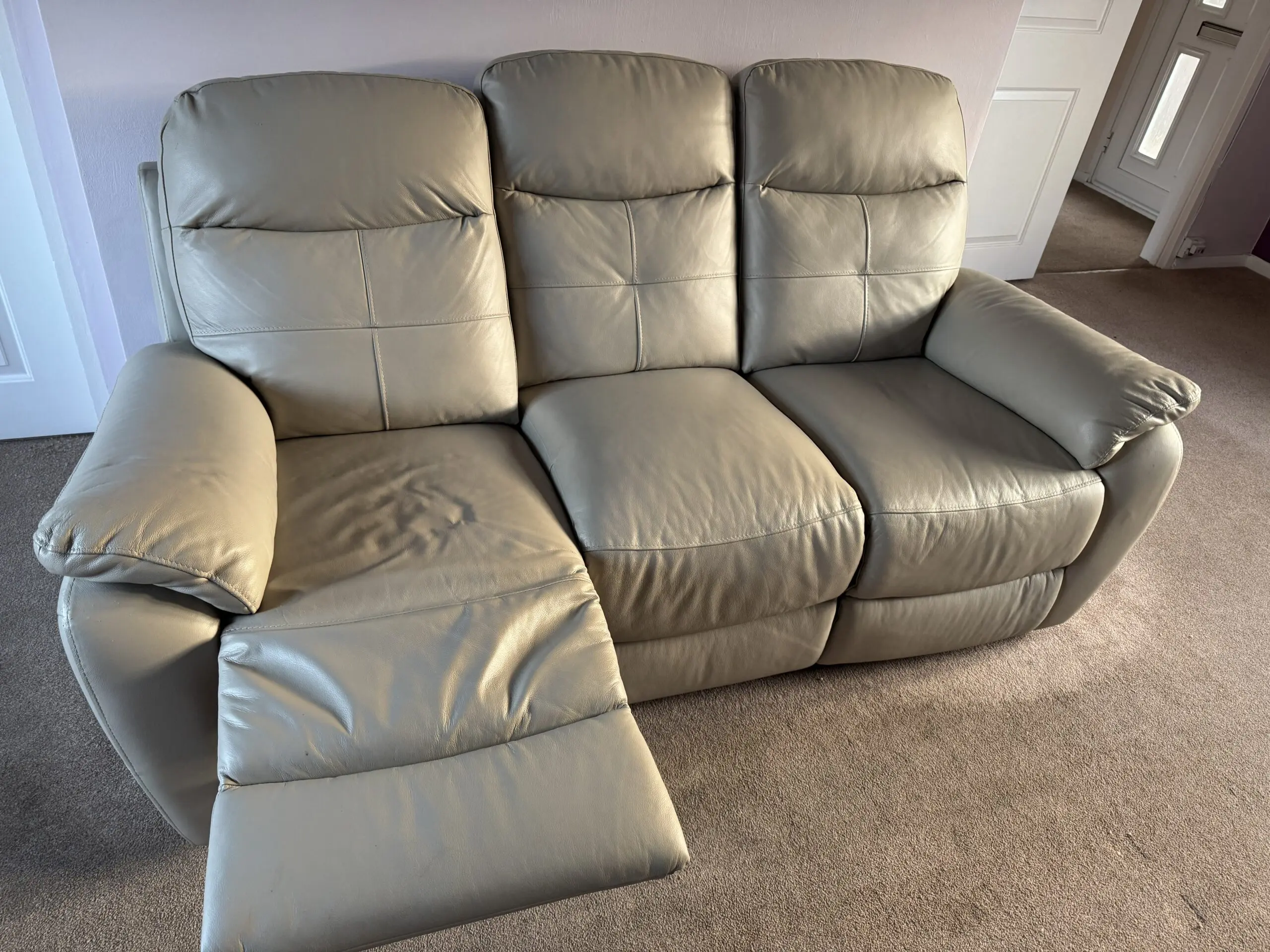 Second hand cream leather 3 seater recliner (two outer seats recliner) in good condition from non smoking pet and child free home.