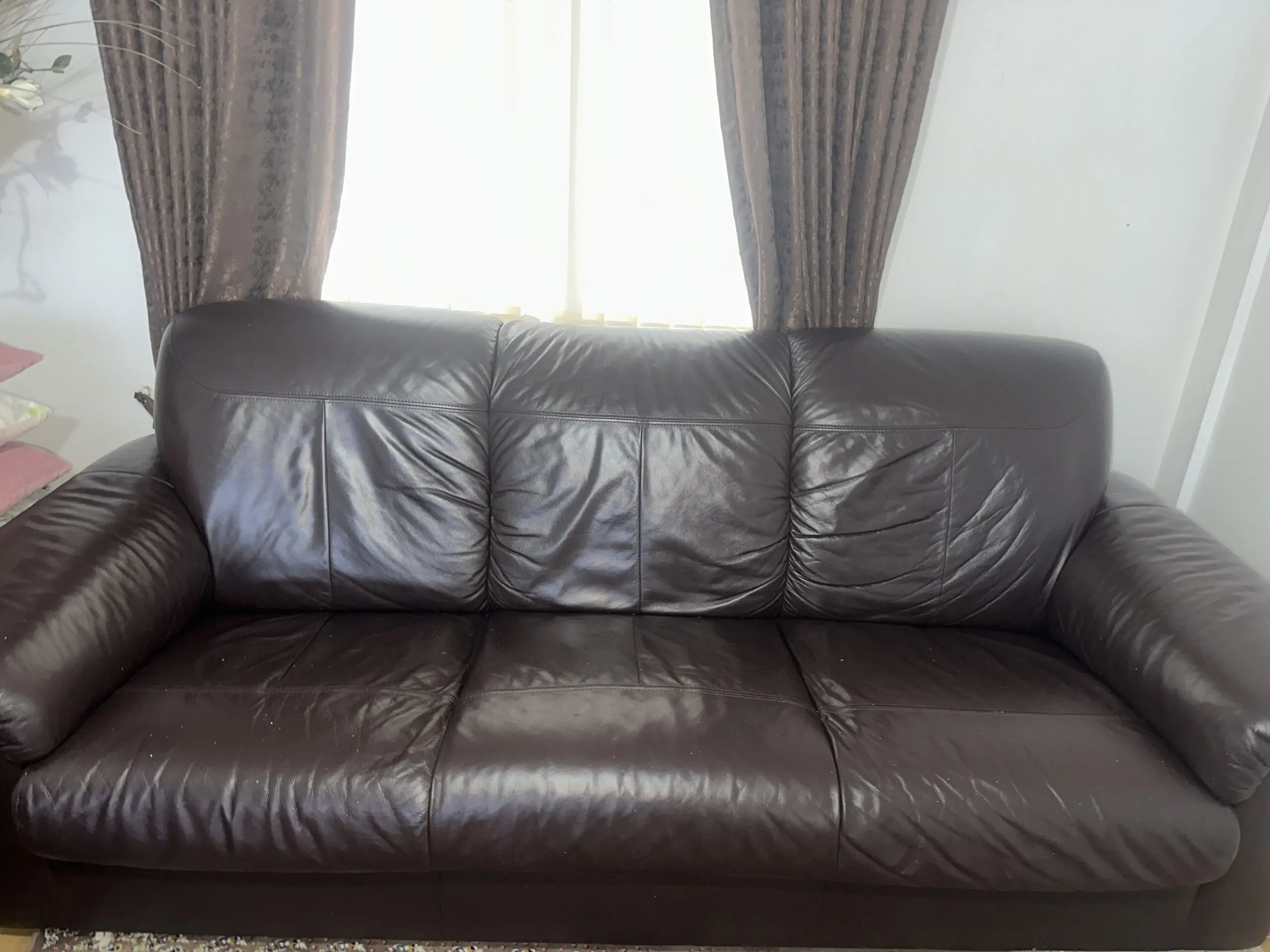 Comfortable and spacious 3-seat leather sofa from IKEA in a dark brown finish. Features a classic design with rounded armrests, supportive fixed back cushions, and deep, cushioned seating. Upholstered in genuine leather with a soft, lived-in texture that adds character and durability.