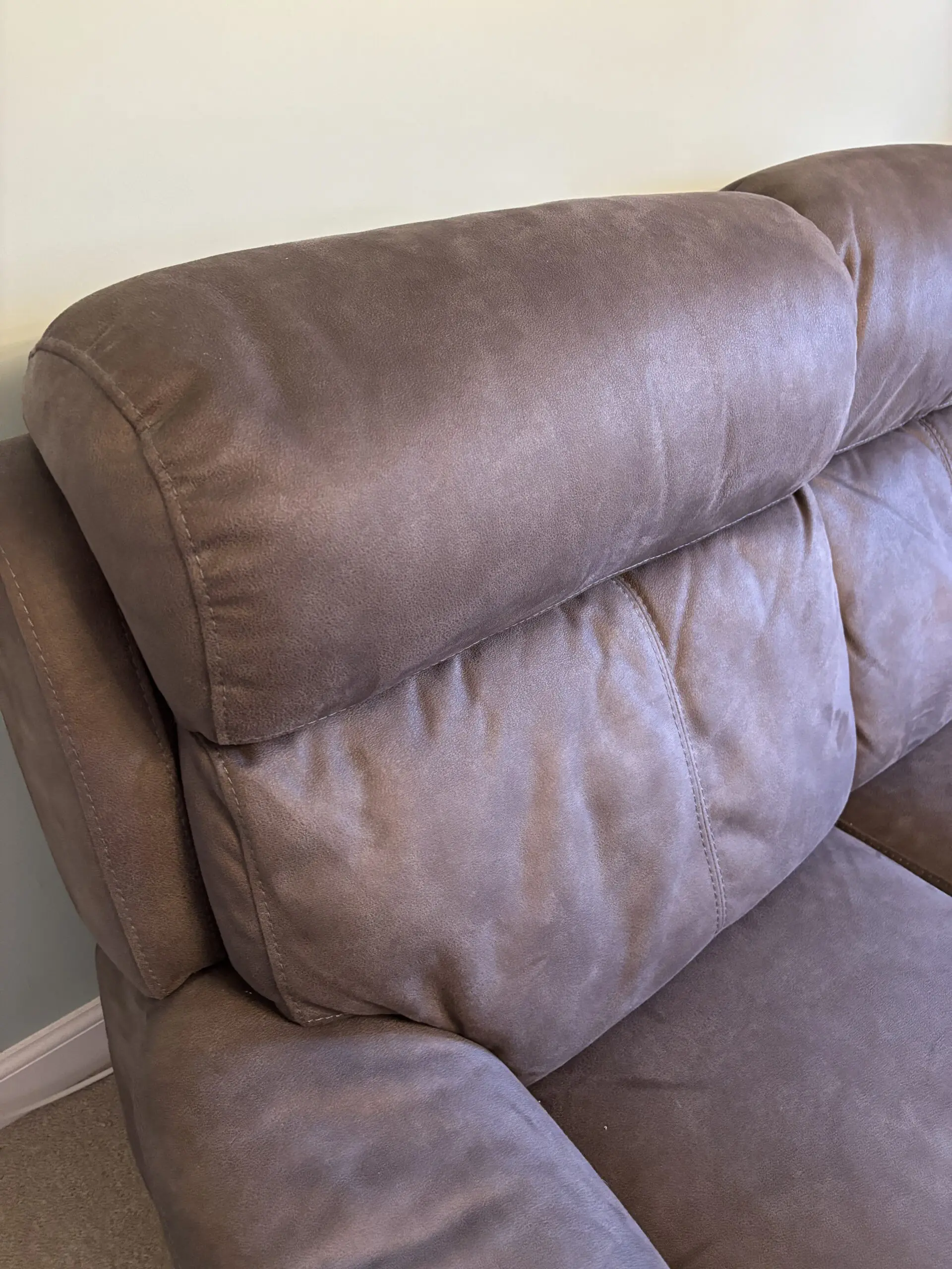 Its deep cushions , dual recliner function, and plush, padded arms.