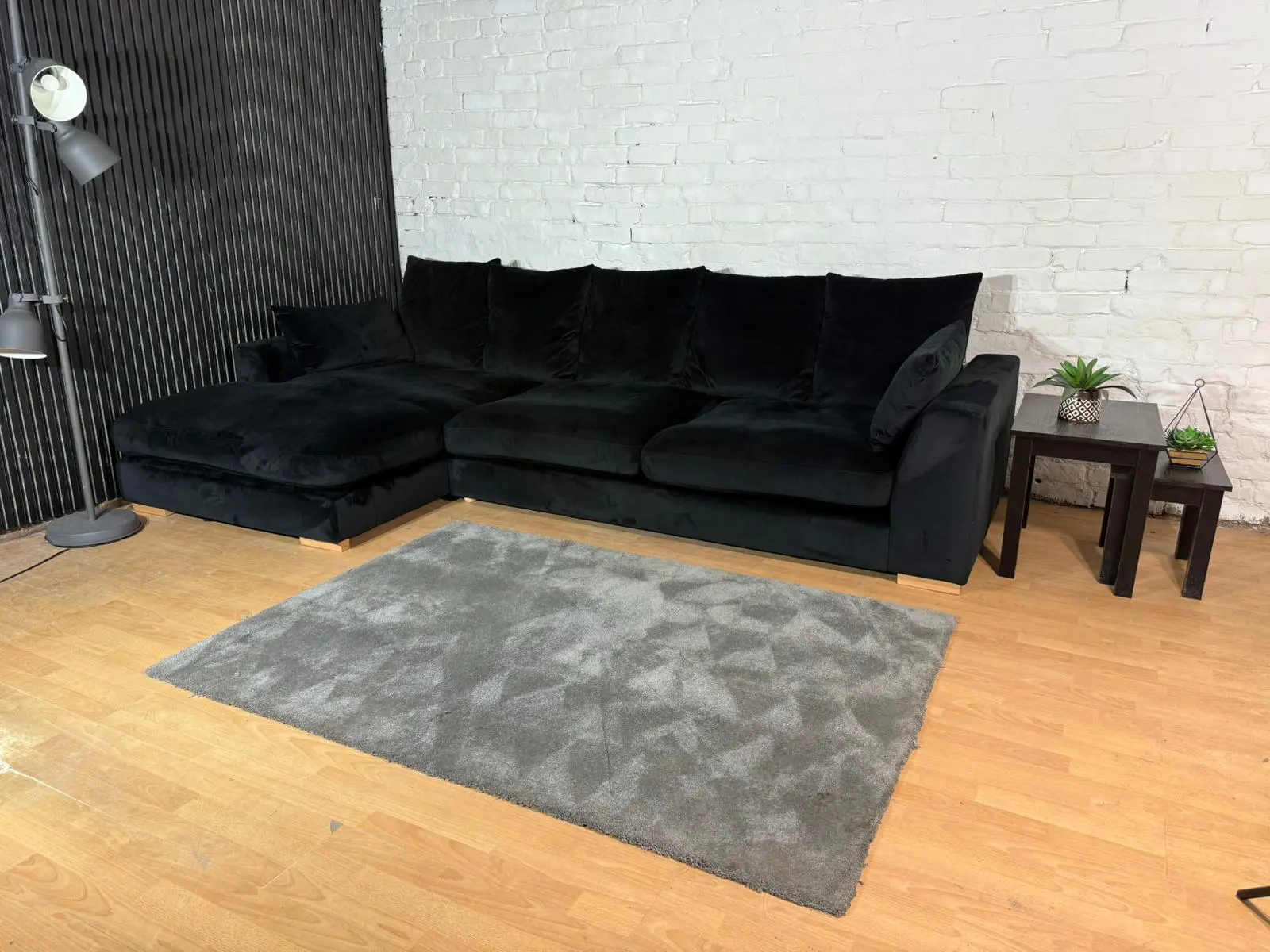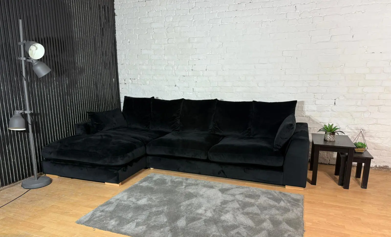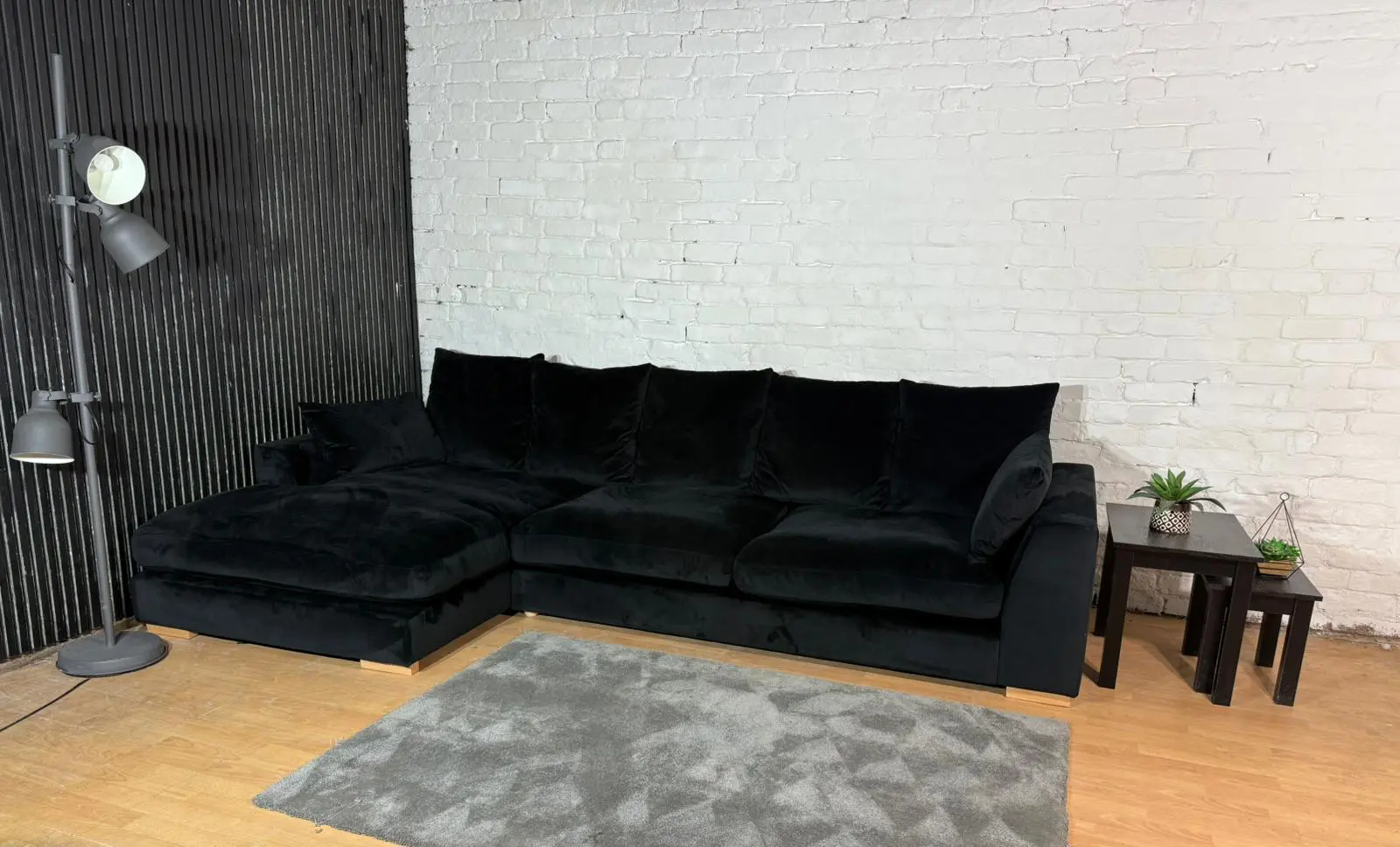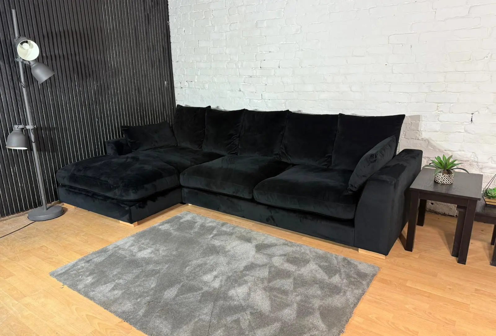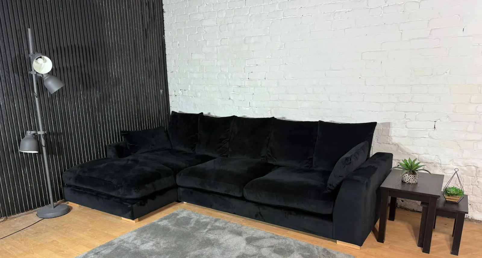 Luxurious black plush velvet corner sofa. Deep seats, soft touch fabric and modern chunky arms. Great condition – like new / ex-display.