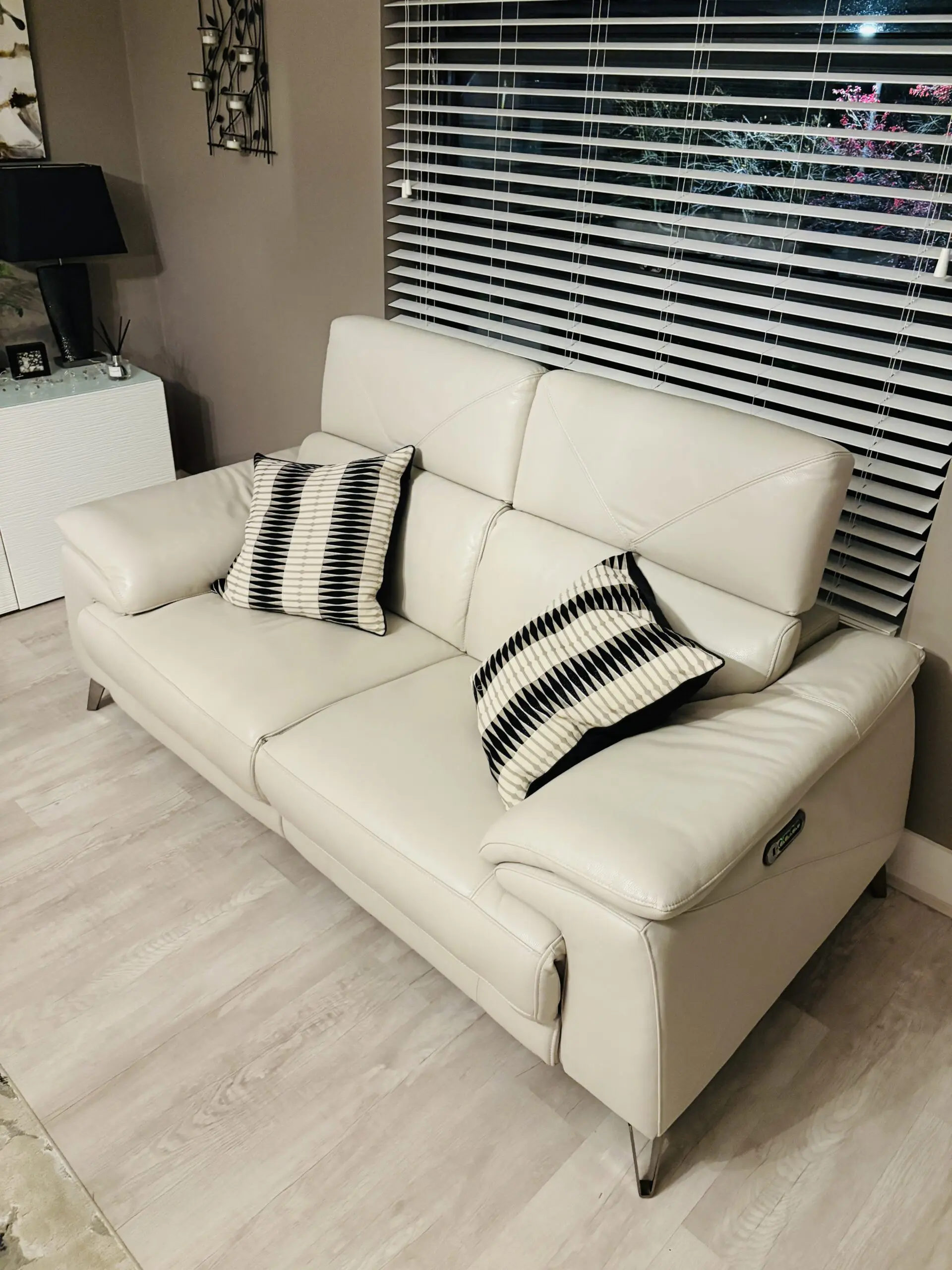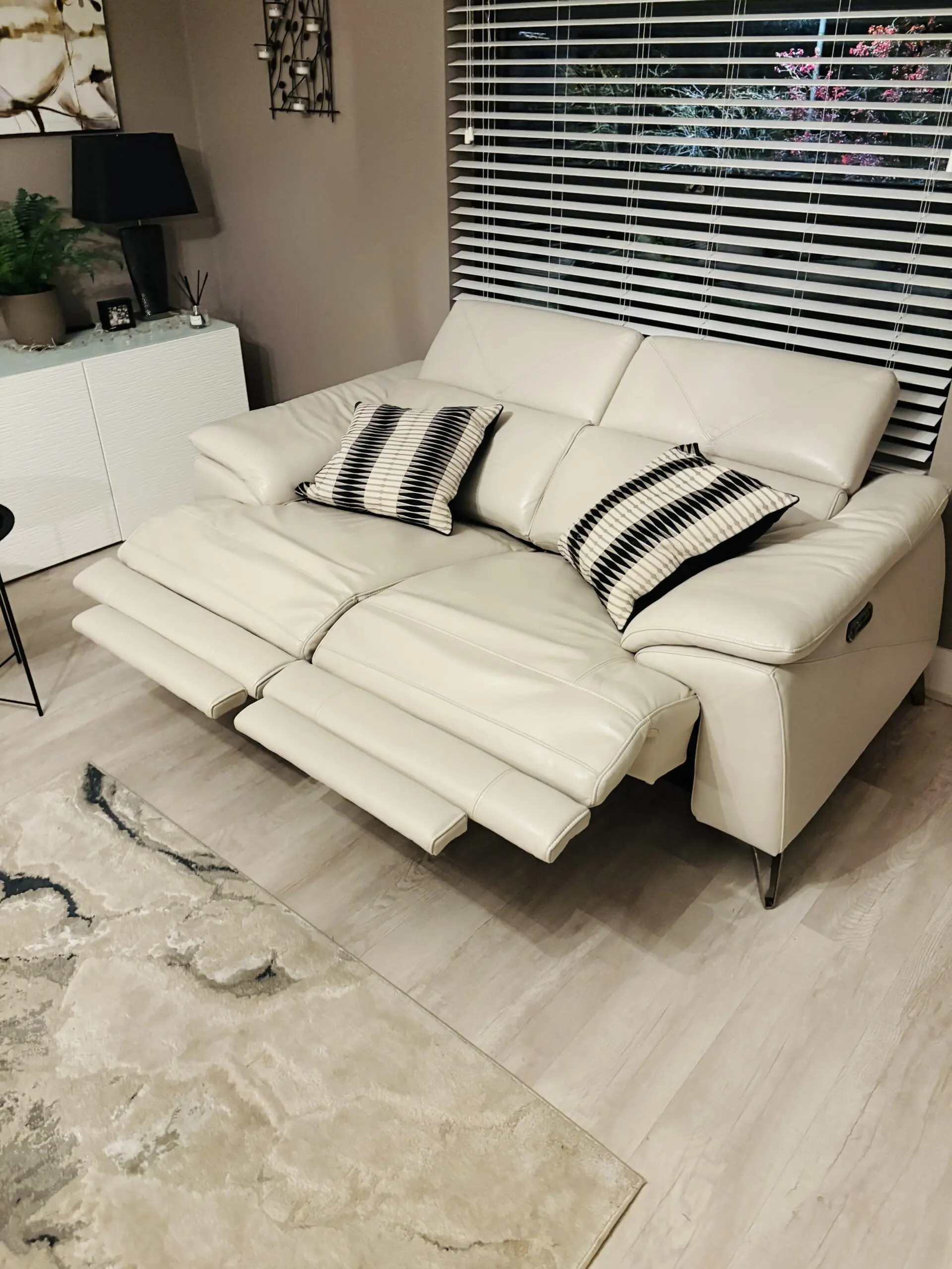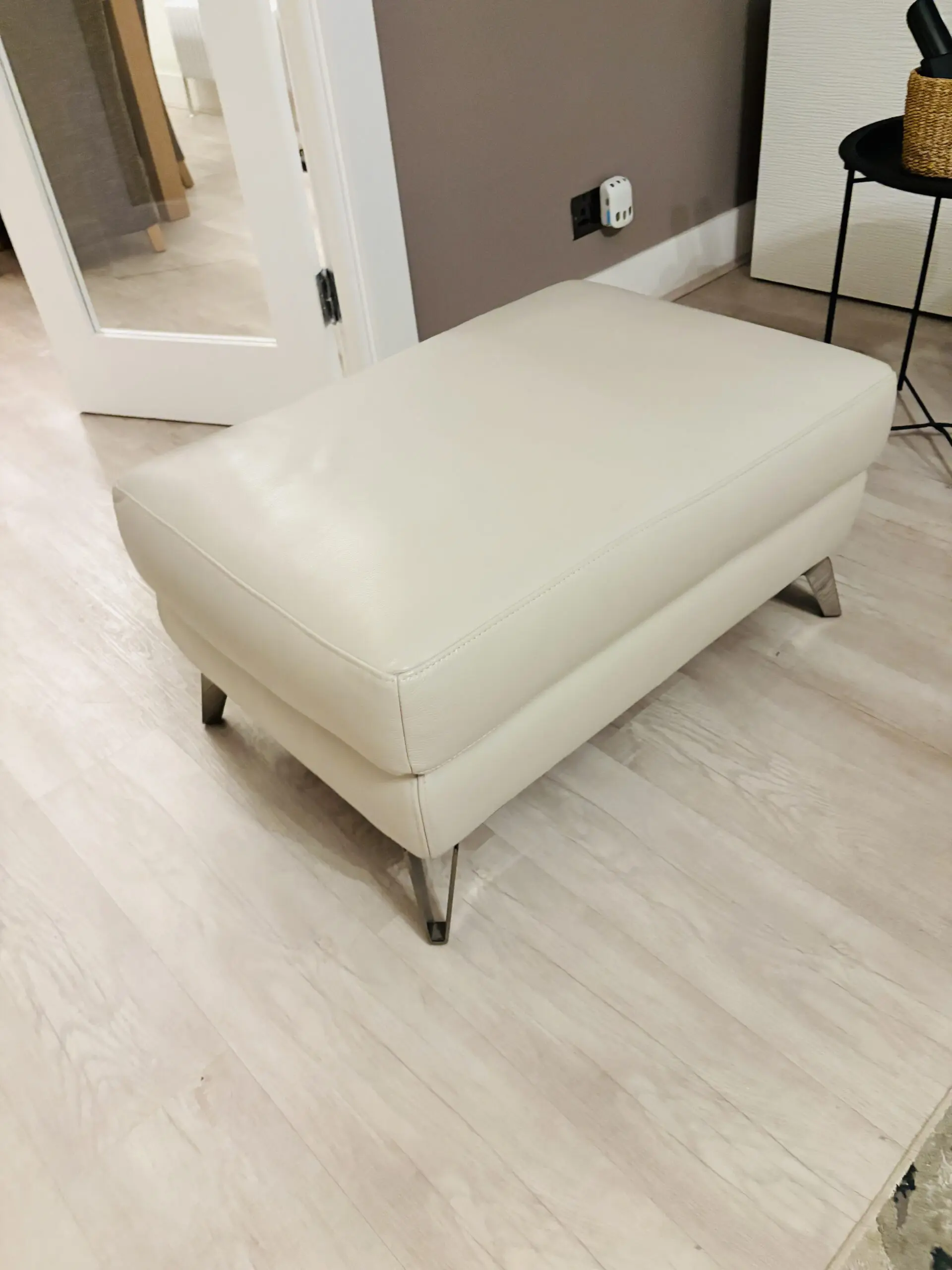 DFS Caldo 3 seater power recliner, 2 seater power recliner and footstool, in colour ‘fossil’. Material ‘New Club’ 100% leather.