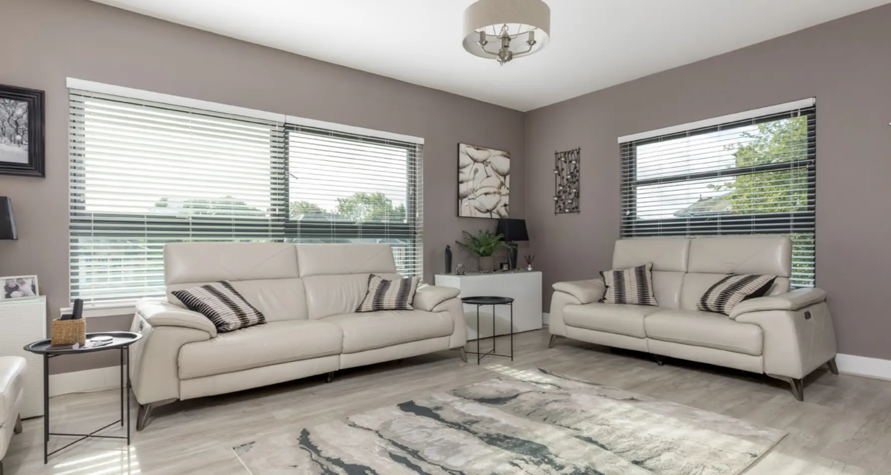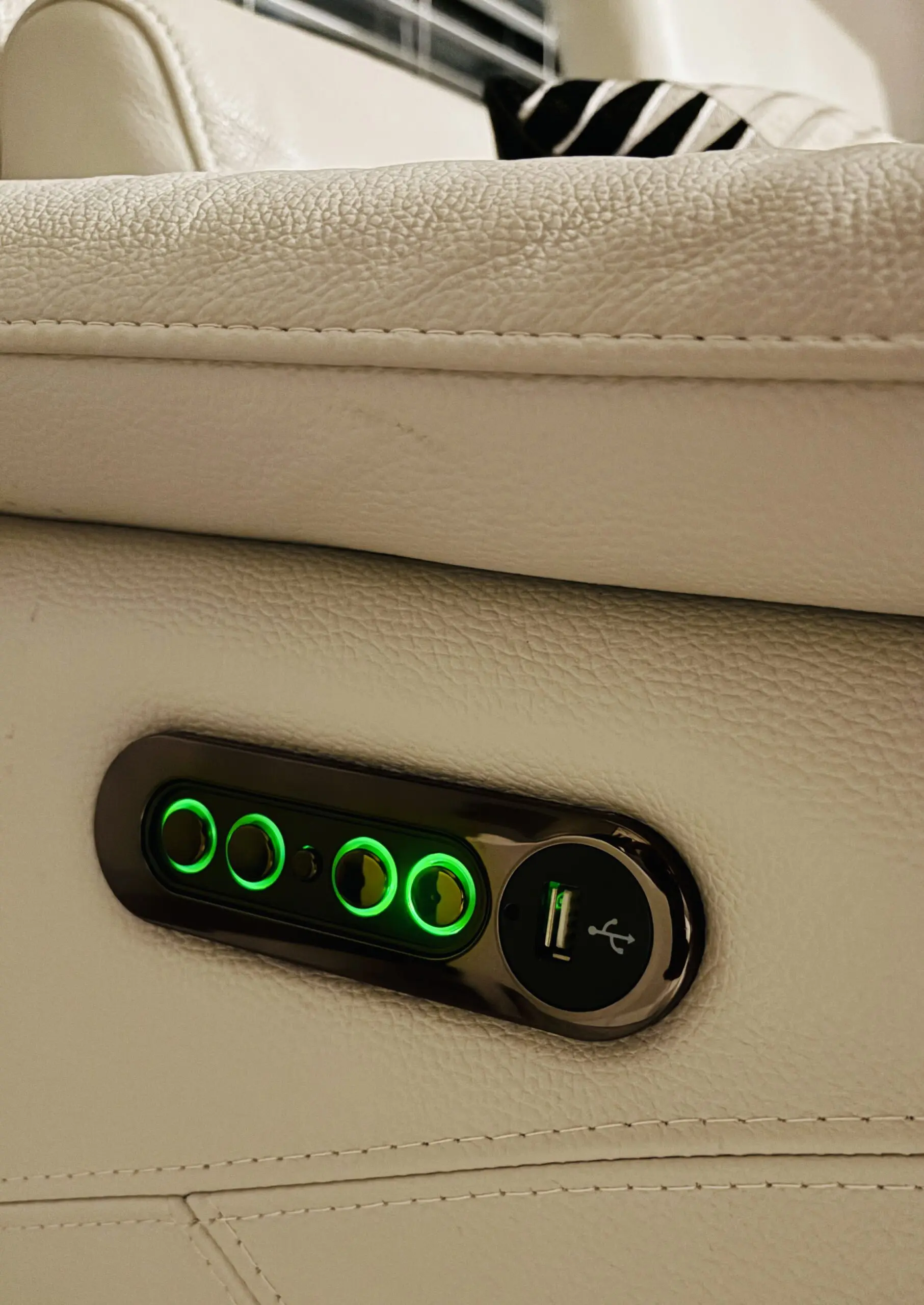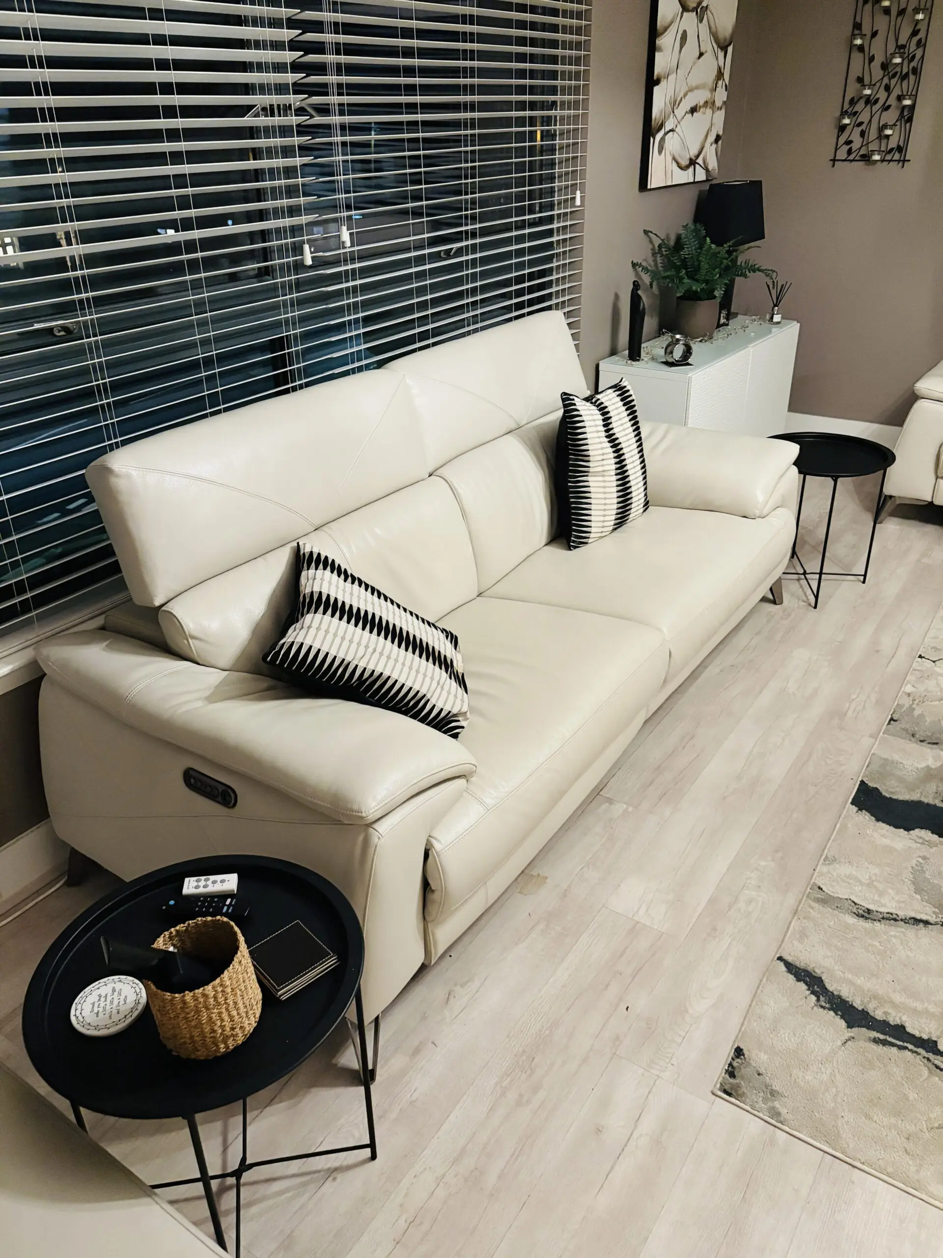 DFS Caldo 3 seater power recliner, 2 seater power recliner and footstool, in colour ‘fossil’. Material ‘New Club’ 100% leather.