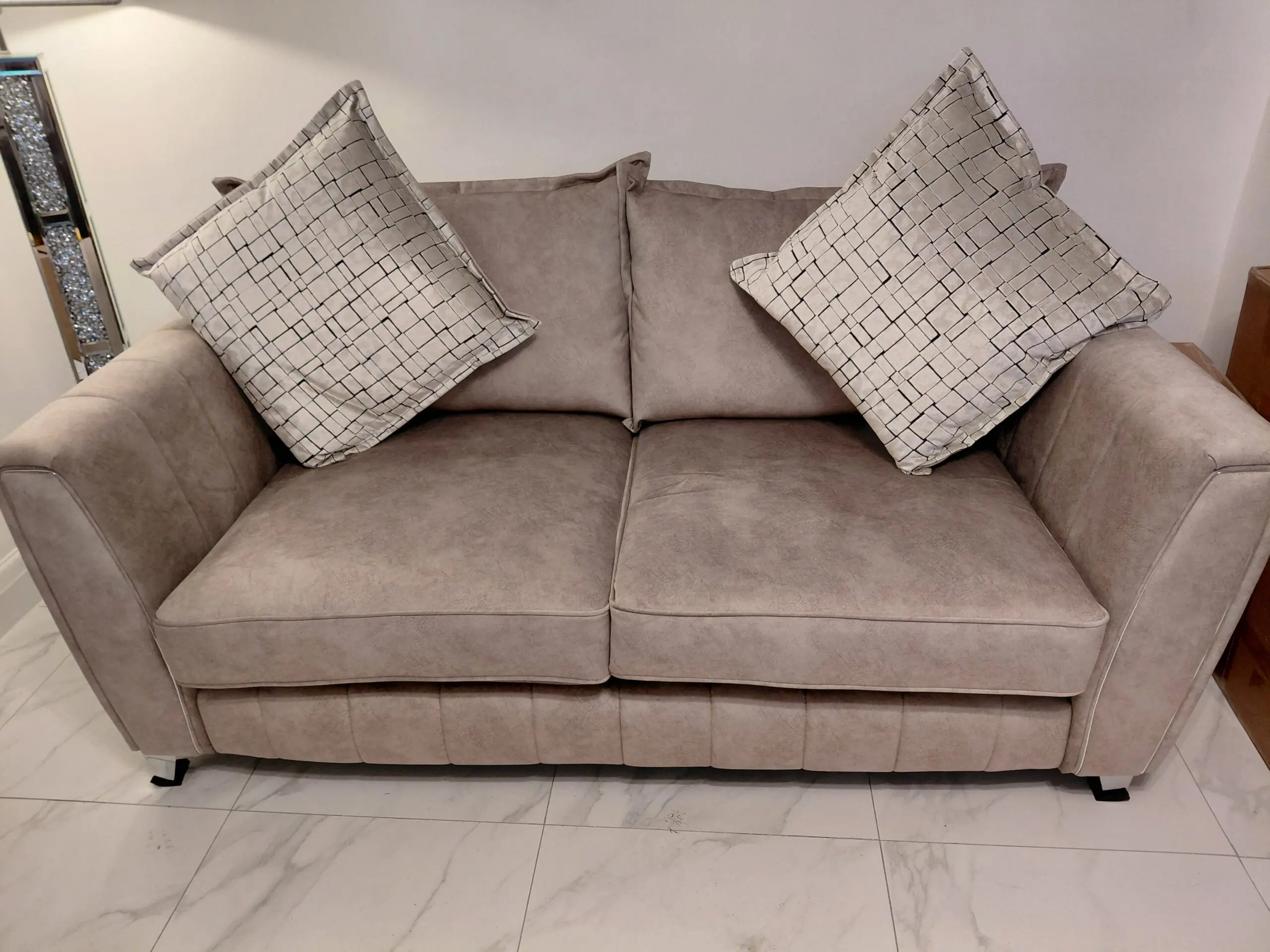 3 weeks old dfs cherished 3 seater sofa and cuddle chair …in oatmeal colour.with silver feet..immaculate from smoke free pet free home paid over £2,300 plus i paid 40.00 each for each cushion i have 4 only selling as i want a leather one selling for £1,500