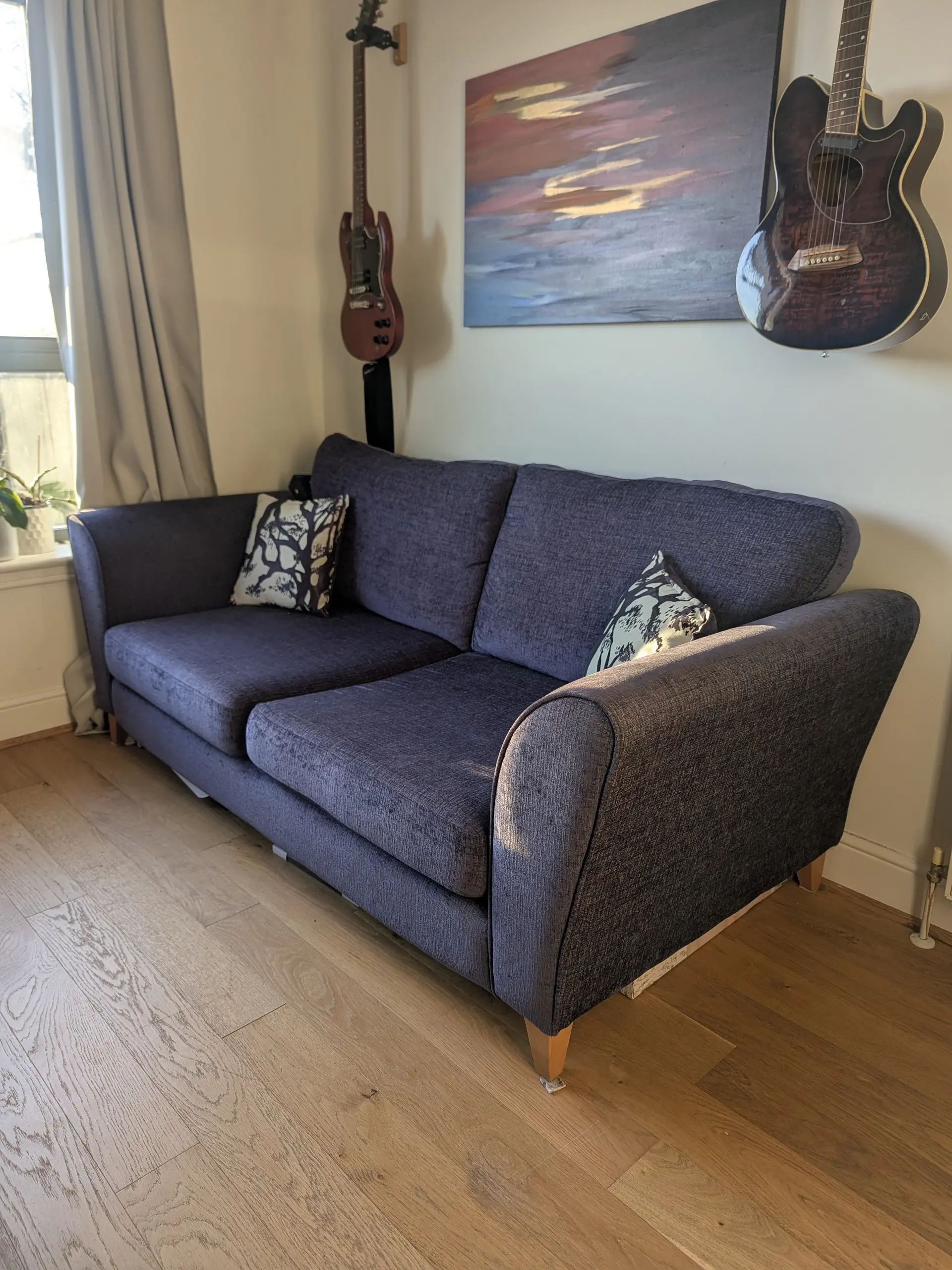 This spacious 3-seater sofa offers excellent comfort for family relaxation and entertaining guests. The deep cushions and supportive backrest create the perfect spot for movie nights or reading. Featuring matching decorative cushions with an attractive tree branch pattern, it adds character to any living room. The classic design works well in both modern and traditional home settings, making it a versatile addition to your furniture collection.